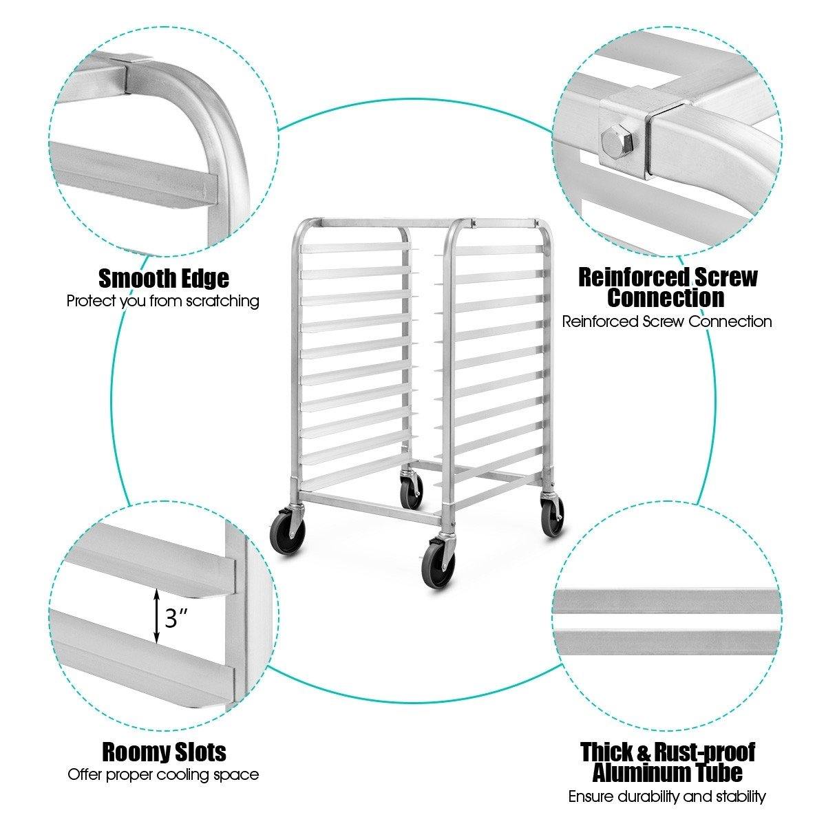Our 10 tiers sheet pan rack is designed to hold and transport a variety of your most popular baked goods or meats. This rack, which is construct with premium food grade aluminum, is durable, high quality, and will save precious space for your catering business, bakery, cafe, supermarket, or restaurant. The rack provides chefs with the ability to store multiple sheet pans in one convenient location and also facilitates proper cooling of your freshly baked treats. Additionally, 4pcs mute universal wheels provide strong balance and high stability, flexible and convenient. Don't miss it!