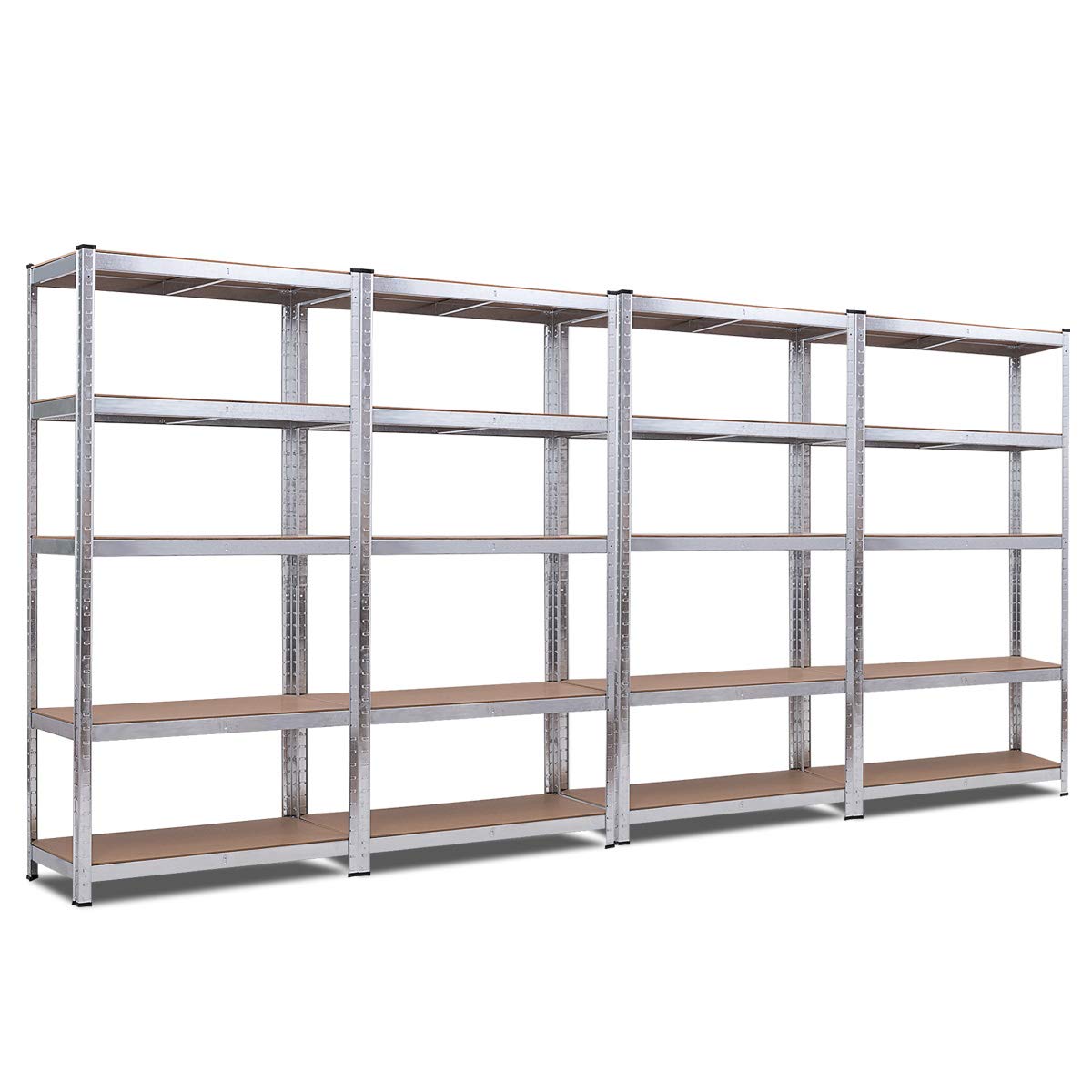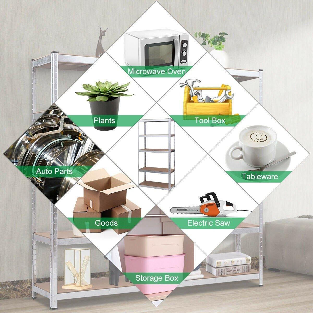 Would you like to have 2 storage racks to make your living space more neat and organized? Our 2 pcs spacious 5-tier storage racks can be the ideal solution. These sturdy racks are made of galvanized steel and durable board. They're very stable because of the heavy duty construction, so that you don't have to worry about the problem of falling shelves causing injuries. The feet with pads will keep the floor from scratching as well. The height between shelves can be adjusted freely to adapt objects of different heights. What more, the racks can be assembled into different combinations to satisfy your different needs. So what are you waiting for? Please choose our 5 tier storage shelves to enlarge your living space.