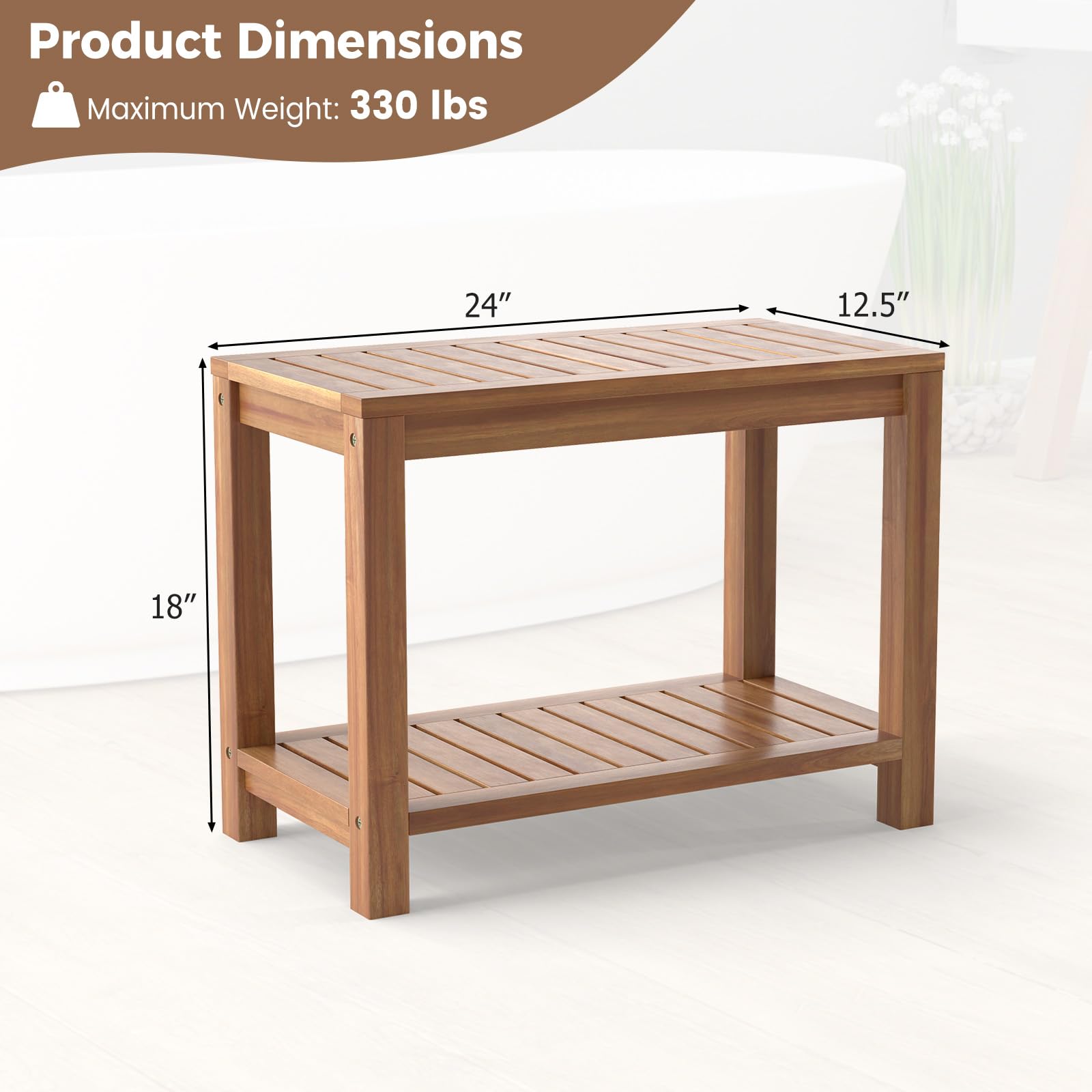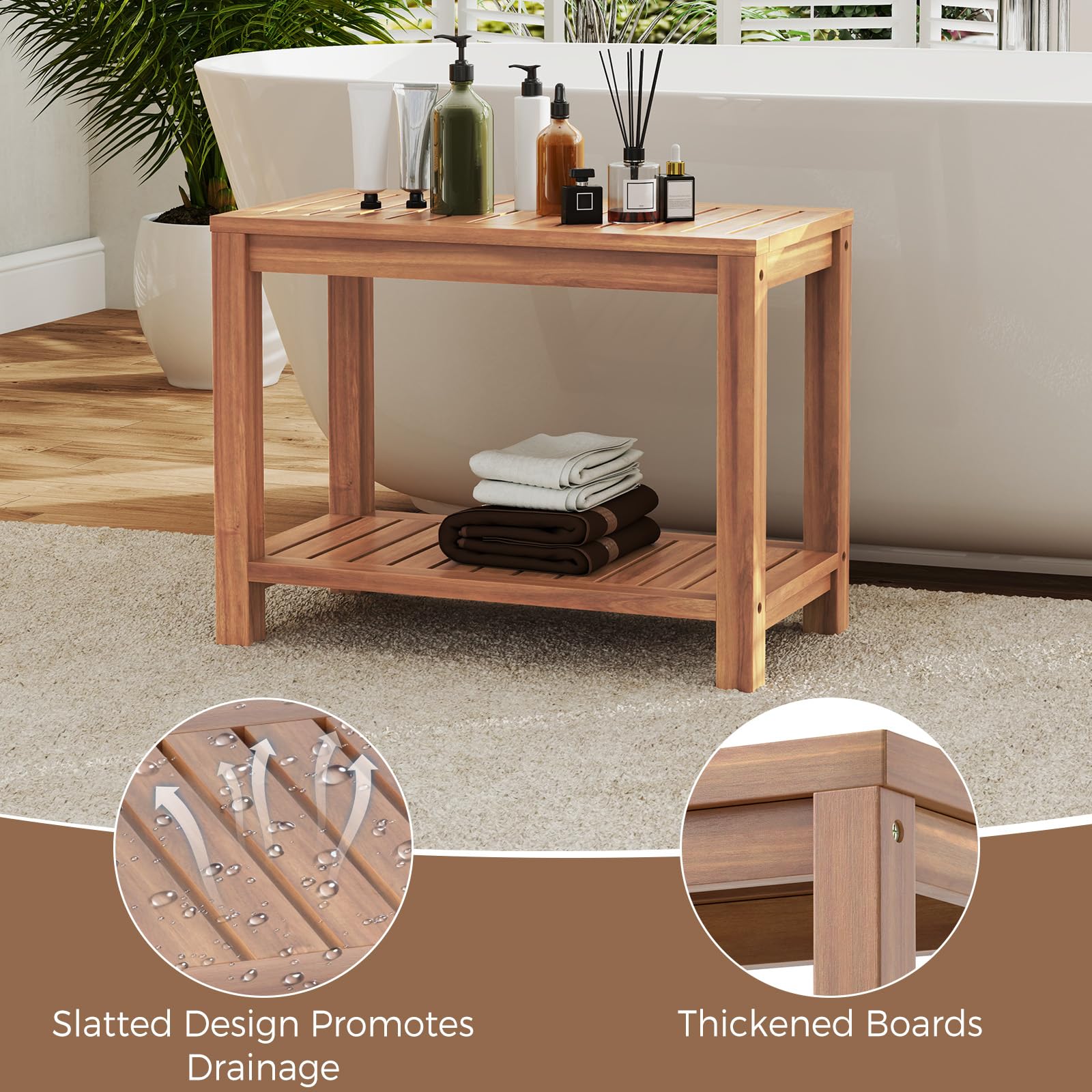 Crafted from teak wood, the teak shower bench stands out for its unmatched sturdiness and durability, promising a long-lasting addition to your home. Featuring a 2-tier storage system, the bathroom rack is the epitome of organization. Additionally, the slatted design not only adds a touch of sophistication but also promotes efficient drainage, making it ideal for areas like bathrooms or poolside settings. Also, the large bench can be used as a shoe bench or entryway storage shelf as you need. Built to last, our teak wood bathroom rack boasts thickened boards that significantly enhance its stability. Moreover, the water-based painting allows you to keep the bath spa seat looking pristine with minimal effort.