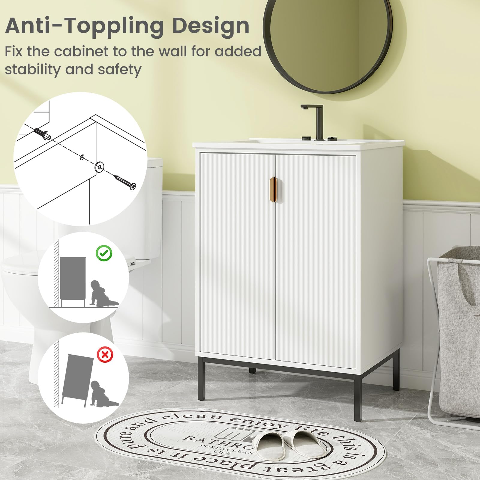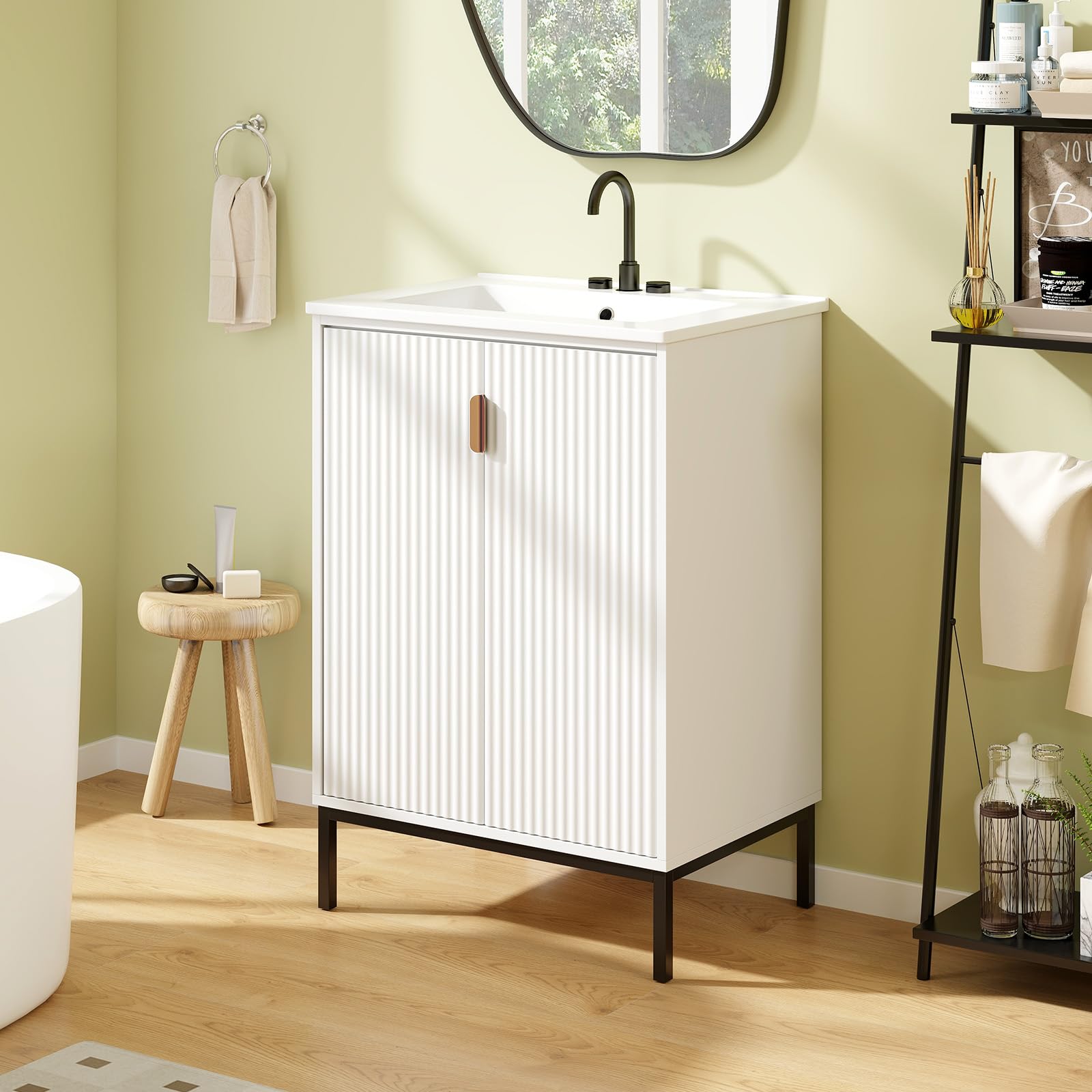 Transform your bathroom space with this modern bathroom vanity with sink combo! This bathroom vanity features a smooth ceramic basin and countertop, which provides ample space for your daily hygiene routines. 3 pre-drilled holes on the top make the faucet installation hassle-free. Below the basin, the cabinet boasts double doors with a visually appealing wave pattern, enhancing the overall design while keeping your bathroom essentials neatly organized. Inside the cabinet, you will find a 3-position adjustable shelf that allows you to customize the storage space according to your needs. What's more, this bathroom cabinet is supported by heavy-duty metal legs, which not only enhance stability, but also raise the cabinet off the ground, for easier cleaning.