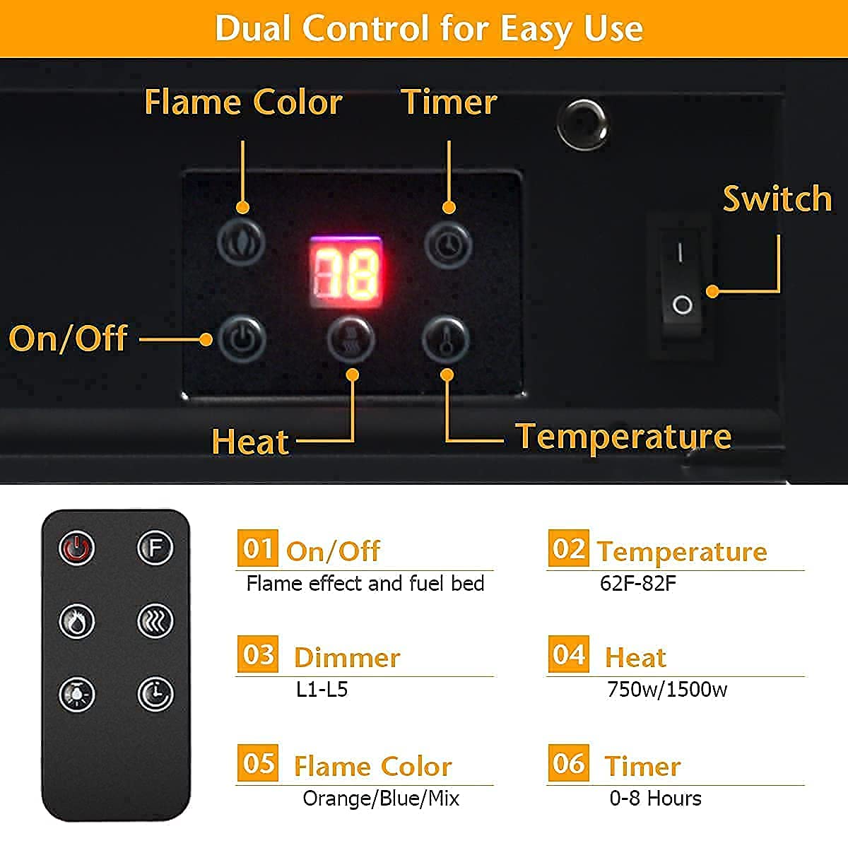 Adjustable Temperature & Time: With an Intelligent thermostat system, the temperature can be adjusted from 62 degrees Fahrenheit to 82 degrees Fahrenheit to guarantee you have a comfortable level of heat. The fireplace, which comes with a timer, frees you by turning on and off at a previously specified time and automatically functioning from 0 to 8 hours.