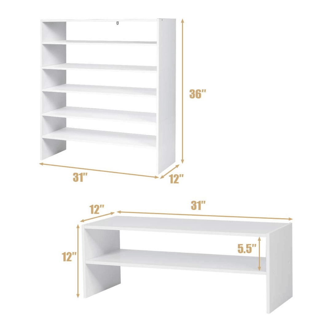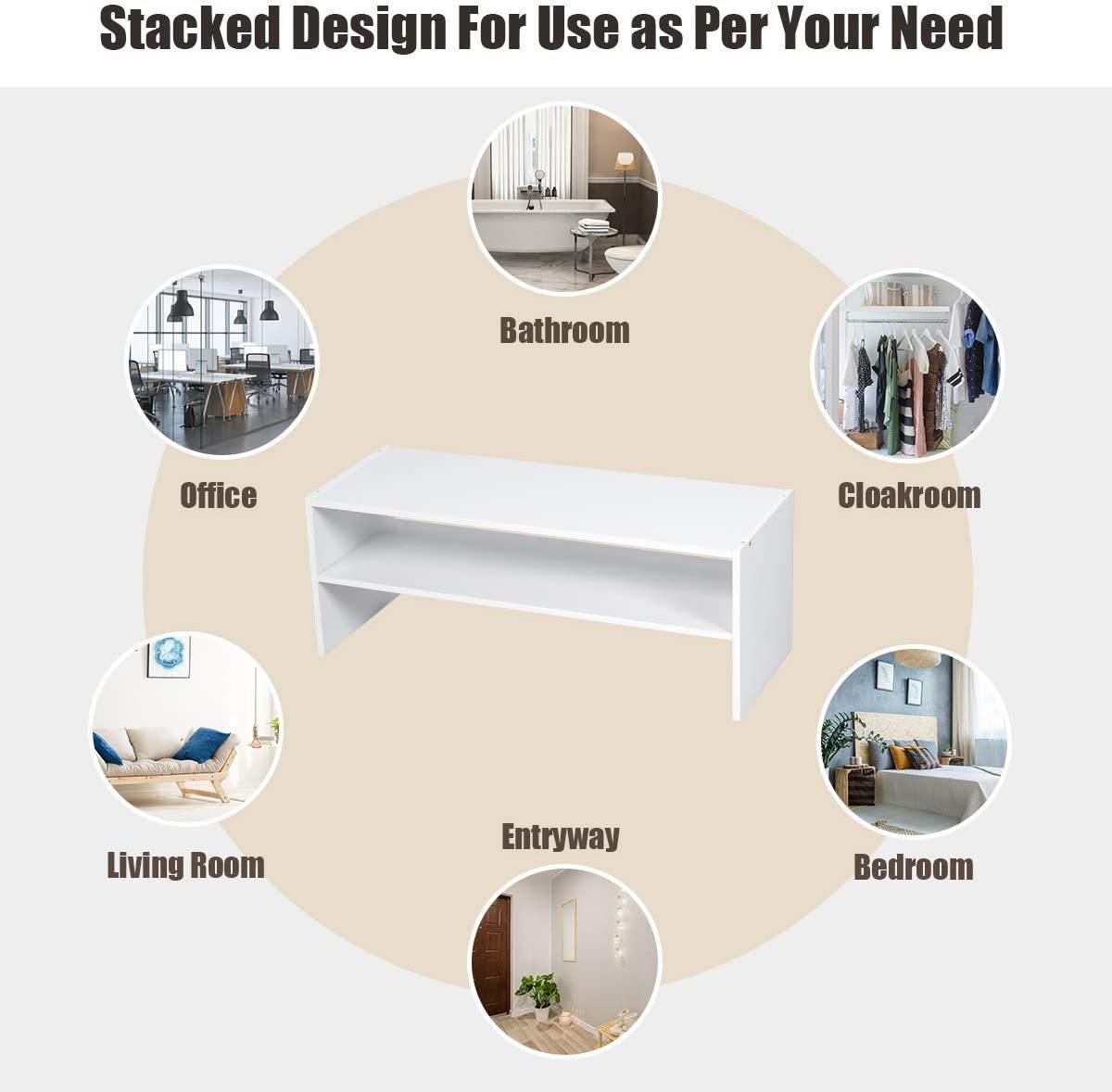- Wide Application with Stackable Design: This shoe rack consists of a 3pcs 2-tier storage shelf that provides enough storage space for you. More, a unique stackable design allows you to combine freely. It can be used as a shoe rack, closet organizer, and display shelf. In addition, this storage shelf can be fixed by corks that ensure the safety of use.