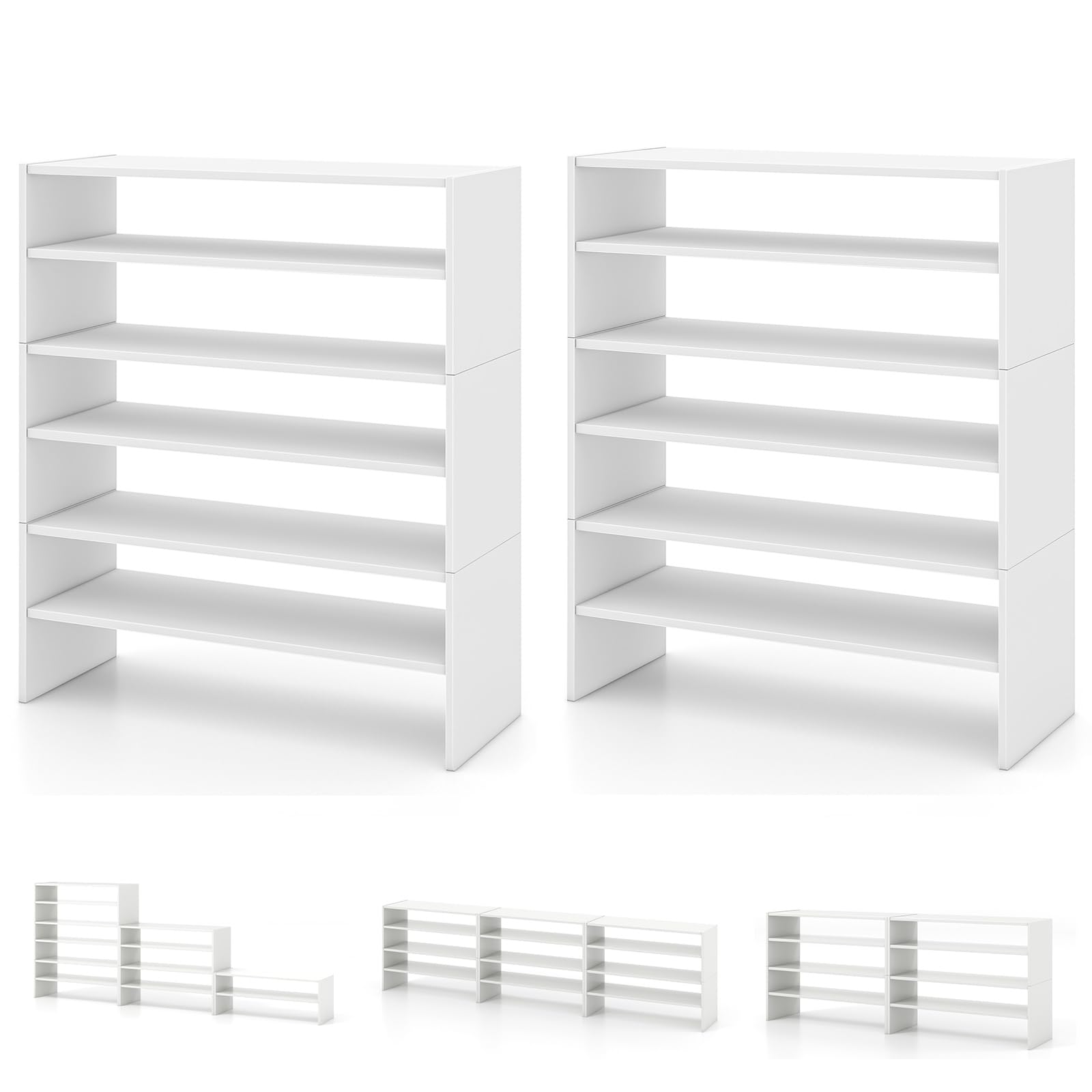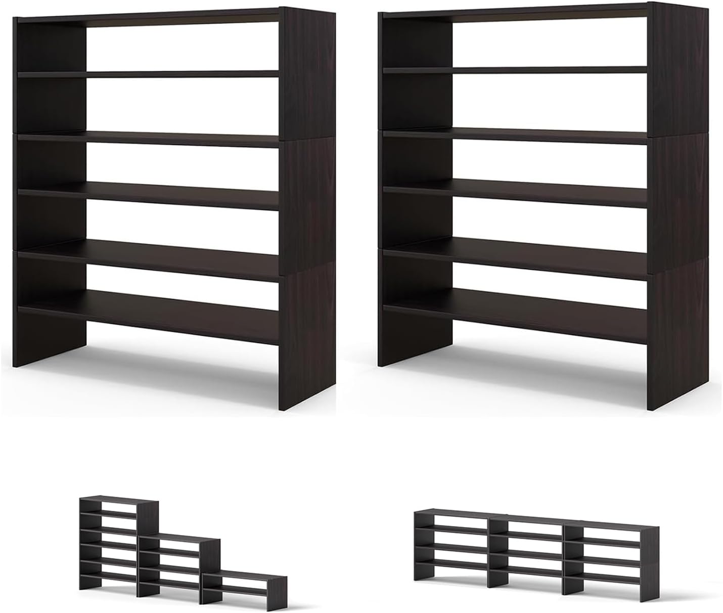 Are you finding a space-saving shoe rack to store your different shoes? This 3pcs 2-tier shoe rack is the perfect solution to keep your shoes tidy and neat. An environmentally friendly board and robust structure ensure years of worry-free use. More, stackable design not only satisfies the fun of DIY but also meets your different storage needs. These three stackers can be used individually or in combination as per your need. The chic and compact design makes it suitable for living rooms and bedrooms. Additionally, three 2-tier storage shelves can be stacked into one 6-tier rack that provides plenty of space for shoes and clothes.