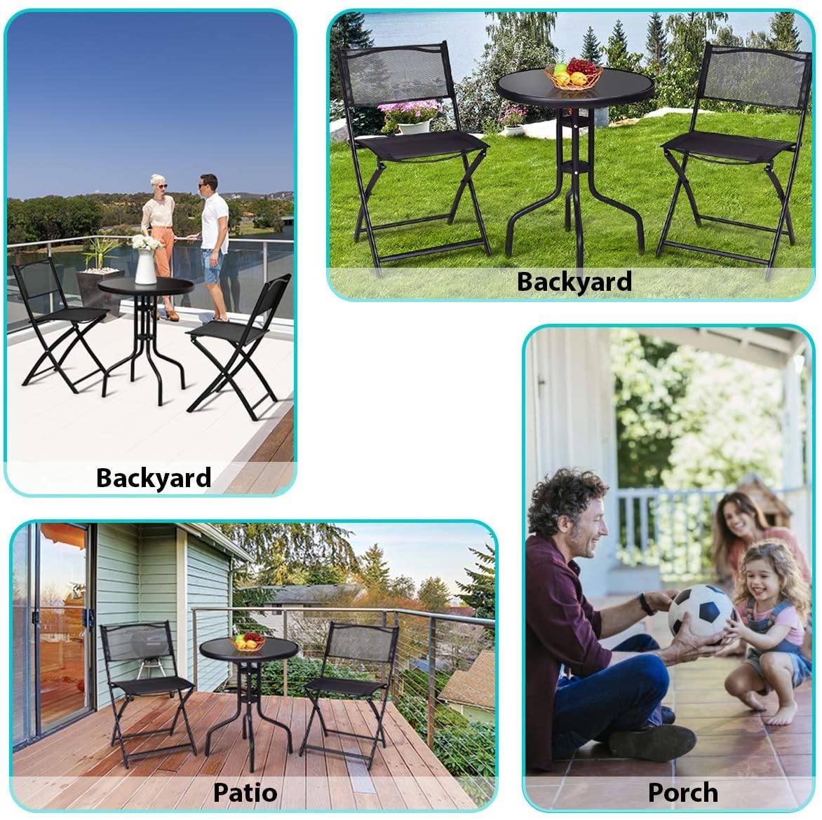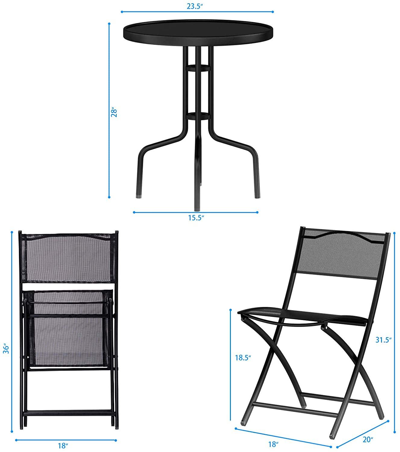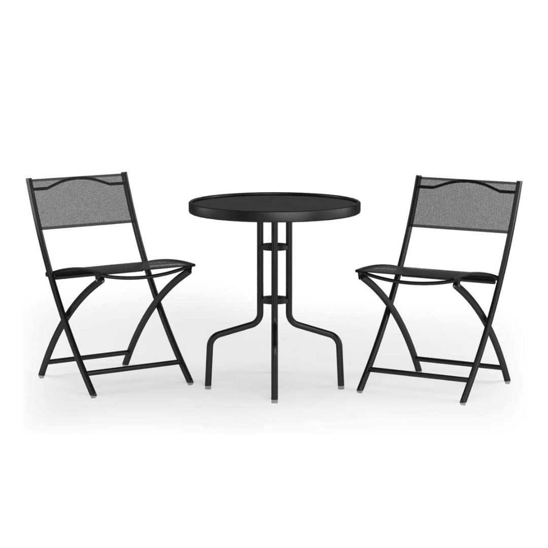This is our brand new 3-piece Bistro set which add a fashion style to your garden or patio . It includes a sturdy round table and 2 folding armless chairs. With premium painted metal construction, this set is sturdy and durable, rust-resistant and UV-resistant, bringing new life to your patio or deck. It is the perfect way to enjoy a cafe-style experience right outside of your door with this set. Besides, it is easy to wipe clean with normal household wipes. You can enjoy meals, drink with this set and have a good leisure time. Don't hesitate to buy one set now!