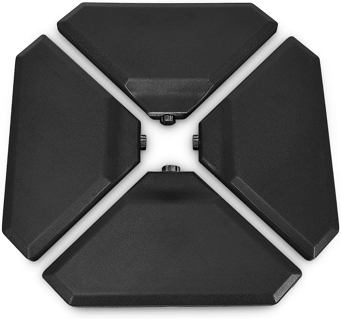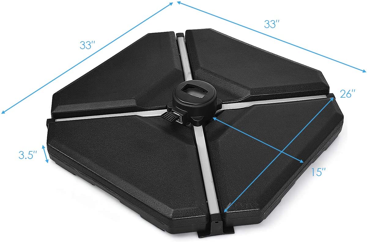 This is our hard base weightthat can be perfectly fixed. Made of durable PE material and excellent blowmolding technology, it can ensure weather resistance and lasting quality. Fourplates are connected by 4 galvanized pins, and the sturdy 4-plate structure isvery easy to disassemble and store. Most importantly, you can fill it with sandand water to ensure the stability of the umbrella. Also, the easy-to-fill large1.5-inch water injection spouts can help you fill quickly without wasting time. The concave handle on each plate are also easy to move. And simple black appearanceadds elegance to your outdoor space, perfect for patio, garden, courtyard,porch and poolside.