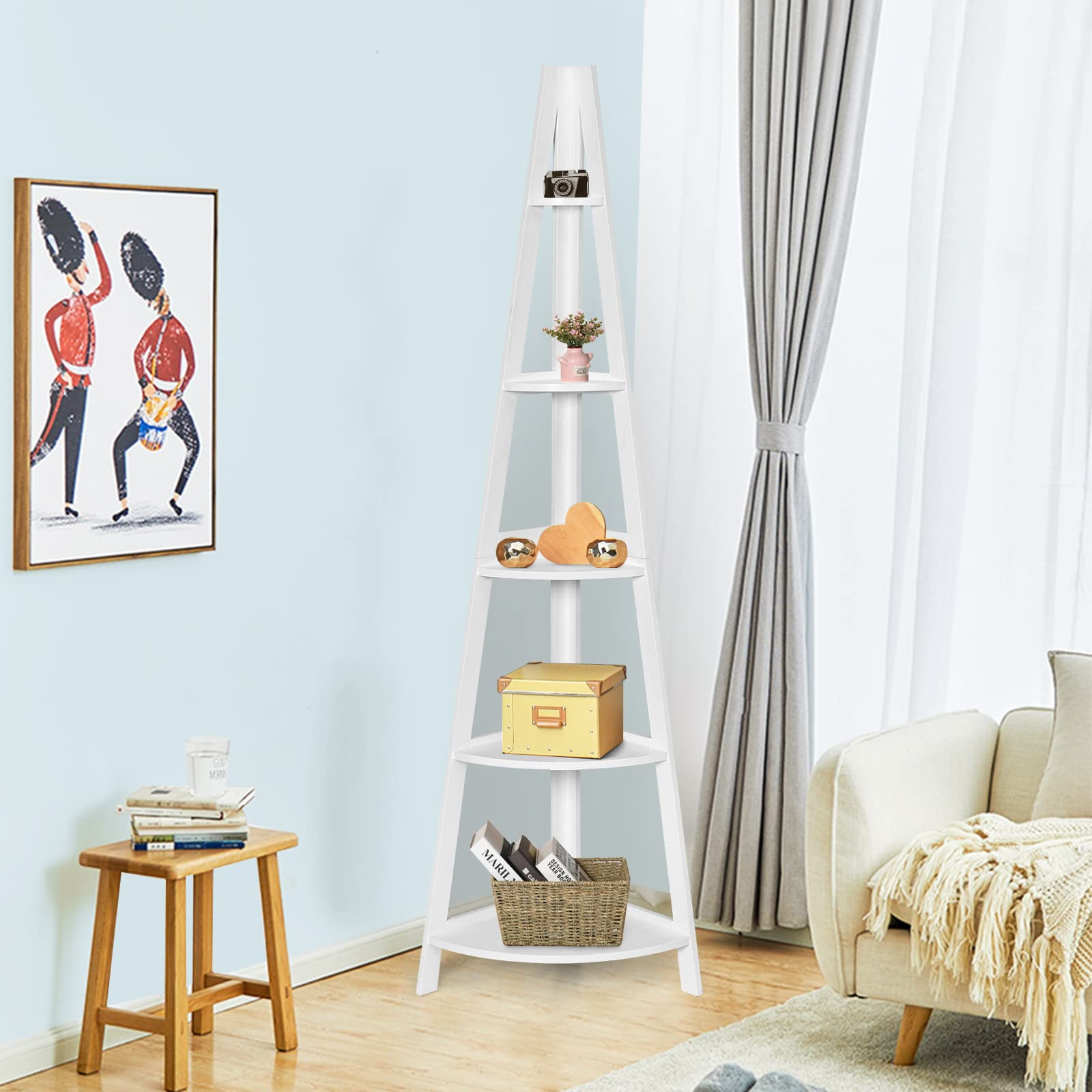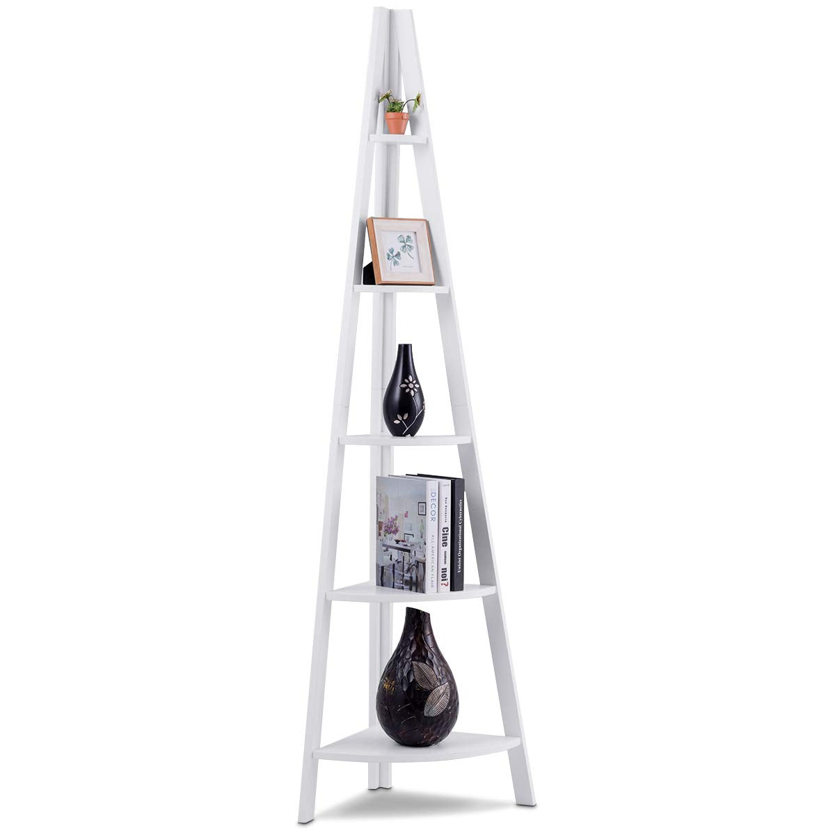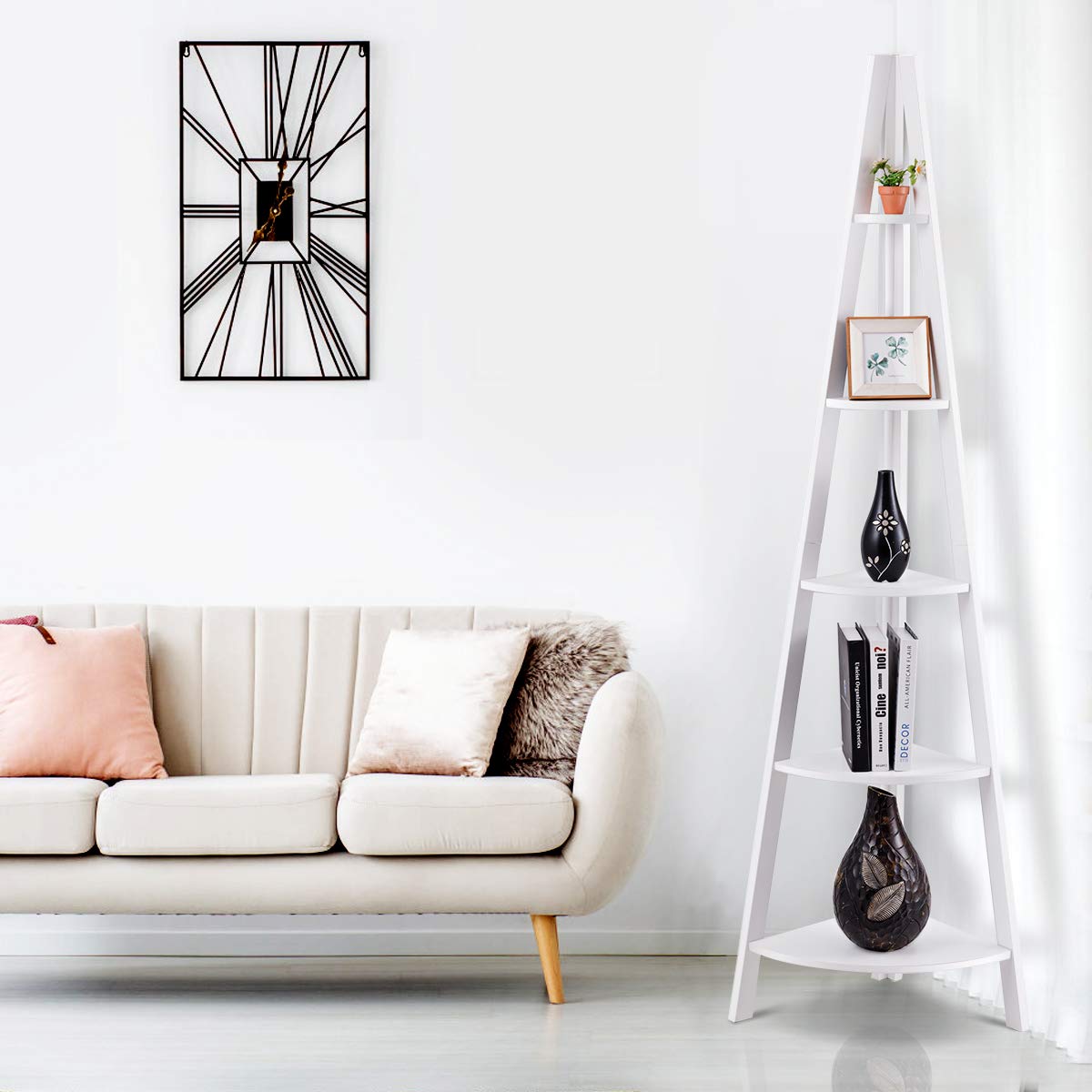 Constructed with sturdy MDF board, designed into an A-shaped frame, strengthened by solid screws, our corner ladder shelf is made into stable and durable furniture. And every shelf has a right-angle design for this furniture to fit wall corner of any rooms better. From top to bottom, shelf size is from smallest to largest, which means you can put objects of different sizes like cups, toys, books, or flowerpots. It is sophisticated and stylish, matches well with other furniture in home, office or balcony.