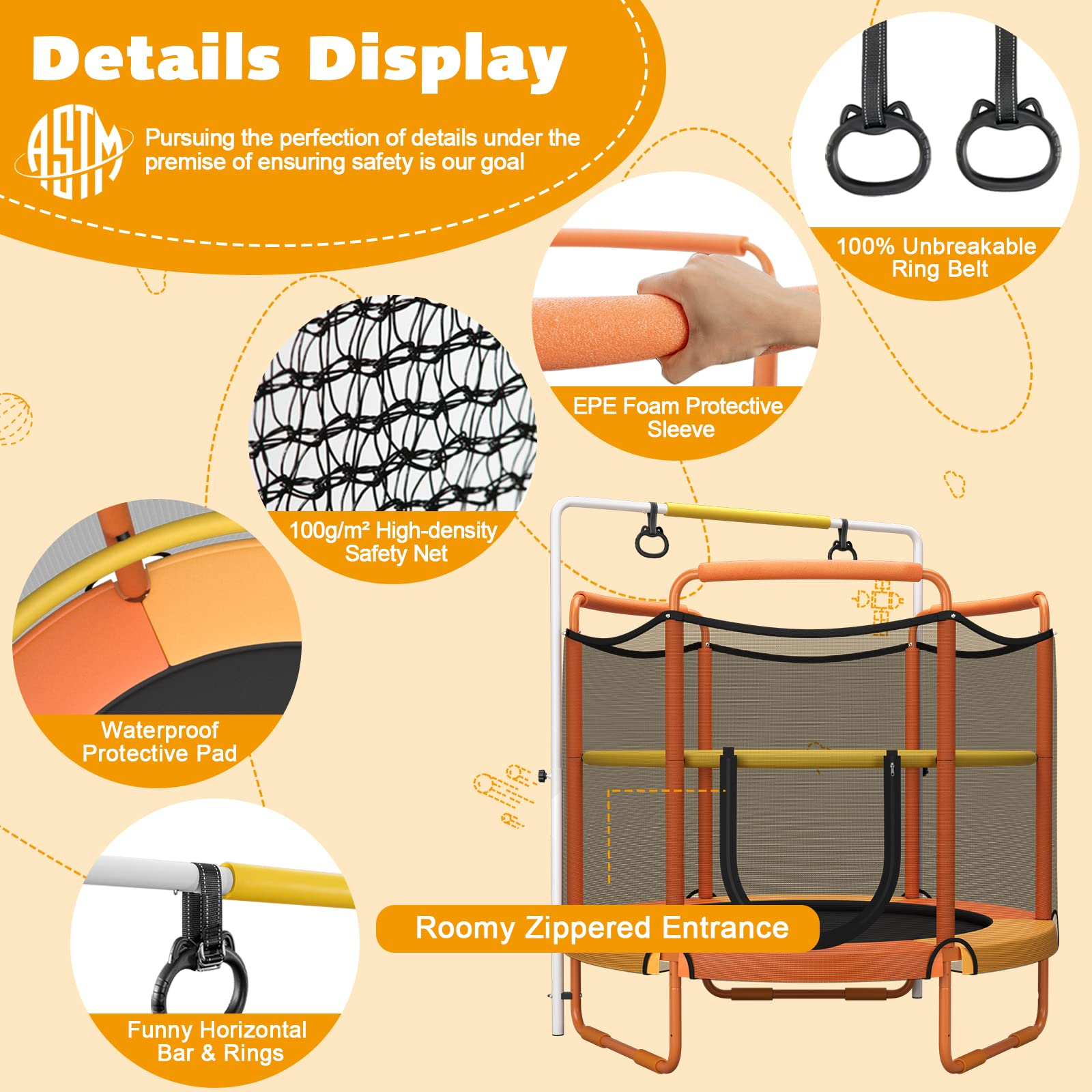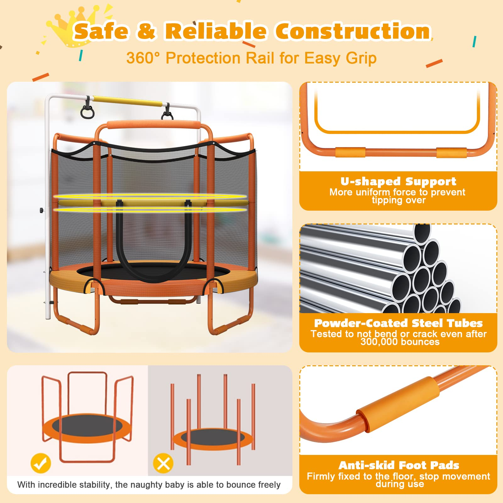 - 3-in-1 Multifunctional Design: This toddler trampoline combines a variety of fun for children to play for hours. The 60-inch kid's trampoline can be used alone, allowing your child to bounce freely. The funny horizontal bar features 3 adjustable heights to meet different needs, including 53"/57"/61". Plus, a pair of unbreakable rings keep kids active and improve motor skills.
