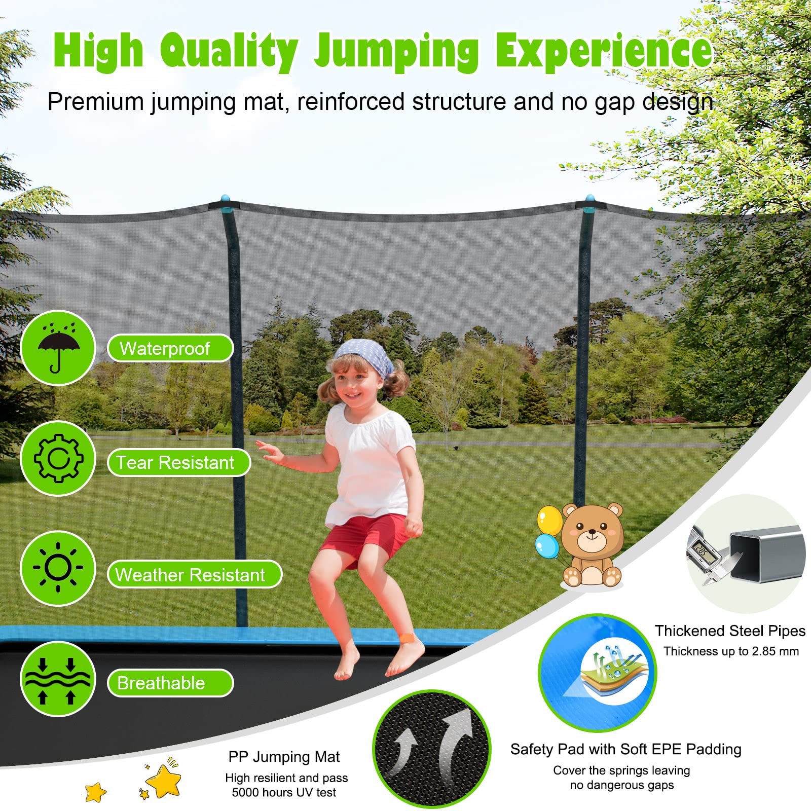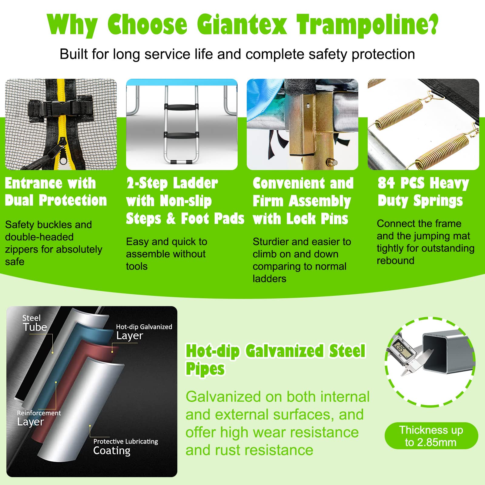 - Long-Lasting & Impressive Jumping Experience: The Giantex trampoline is equipped with 84 heavy-duty steel springs to connect the jumping mat tightly for outstanding rebounds. The breathable and wear-resistant PP jumping mat has been tested for 5000 hours of UV resistance, ensuring outstanding weather resistance for long-time outdoor use.