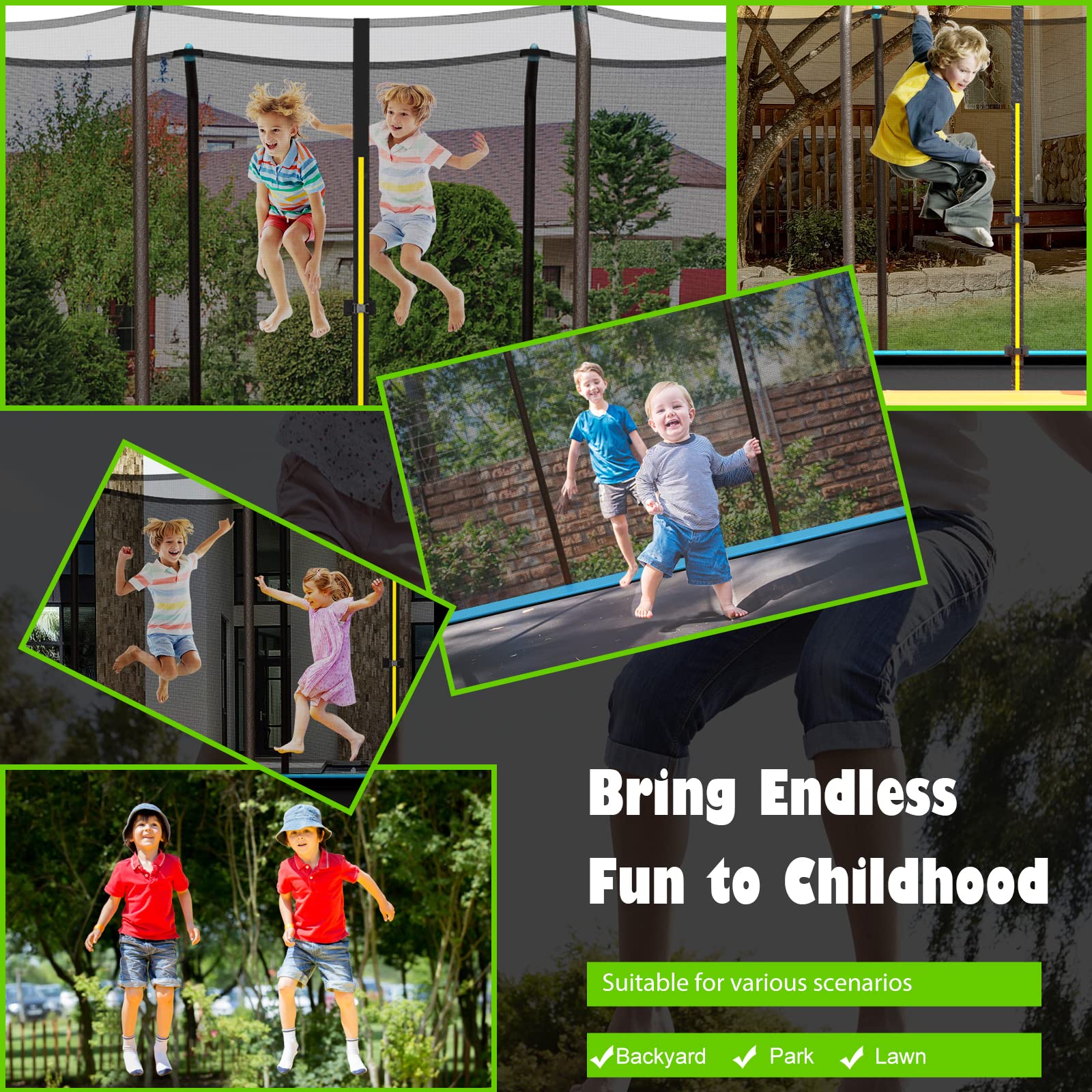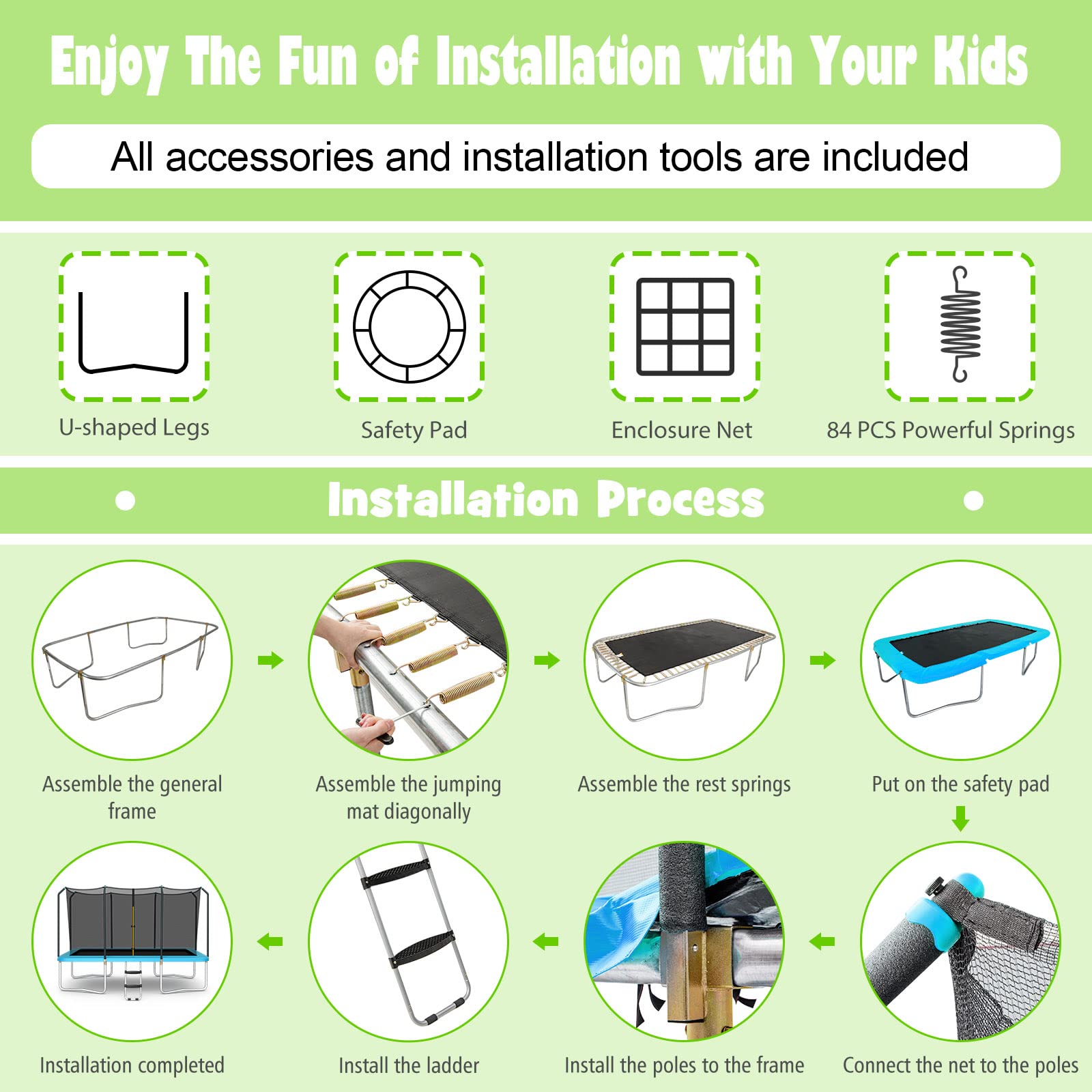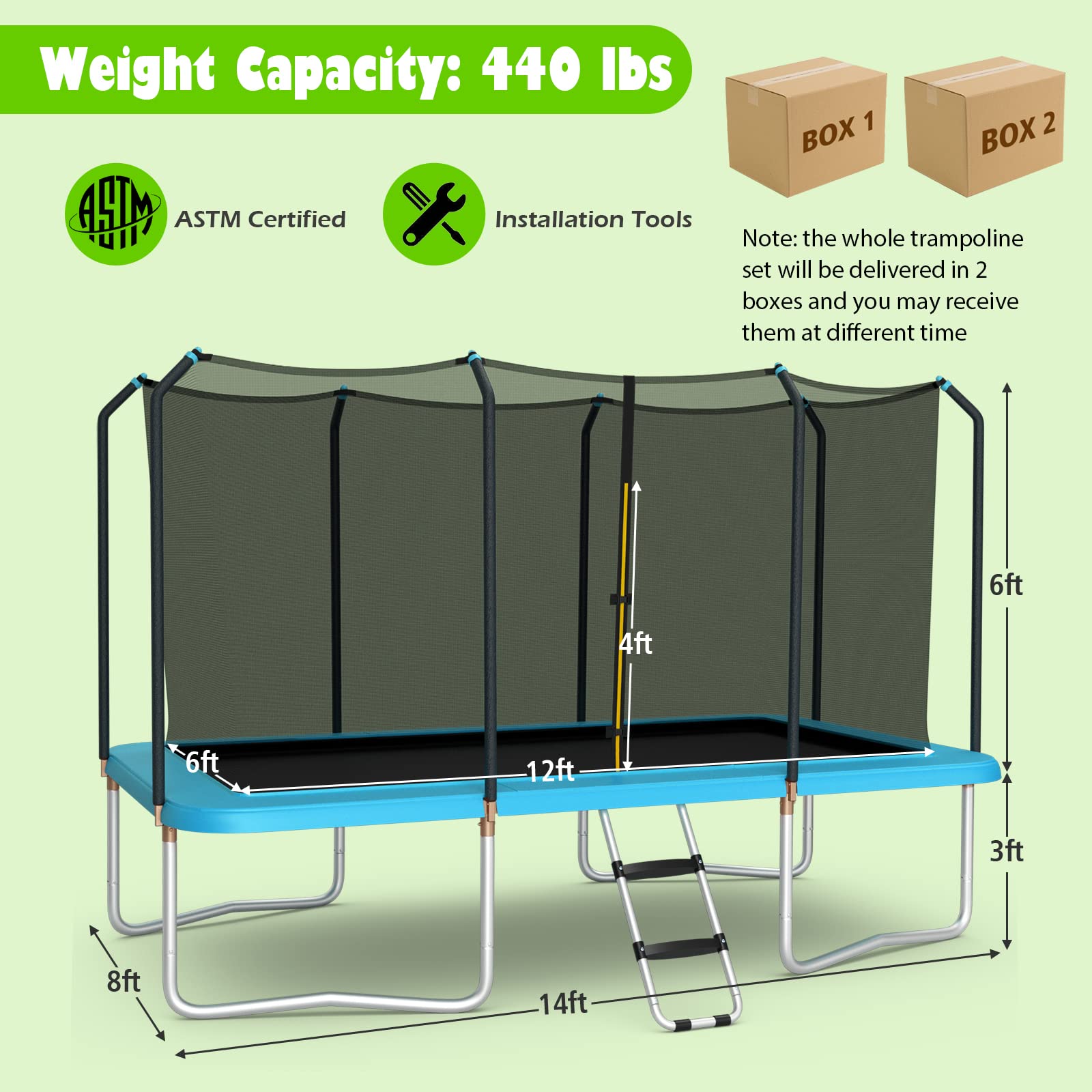 - Turn Your Backyard into a Playground: Giantex outdoor trampoline with bright and warm color will catch kids’ attention as soon as they see it and make your kids fall in love with bouncing very quickly. The 8 ft x 14 ft trampoline not only brings endless fun to kids’ childhood, but also is helpful to enhance their physical fitness, balance ability, and skeletal development.
