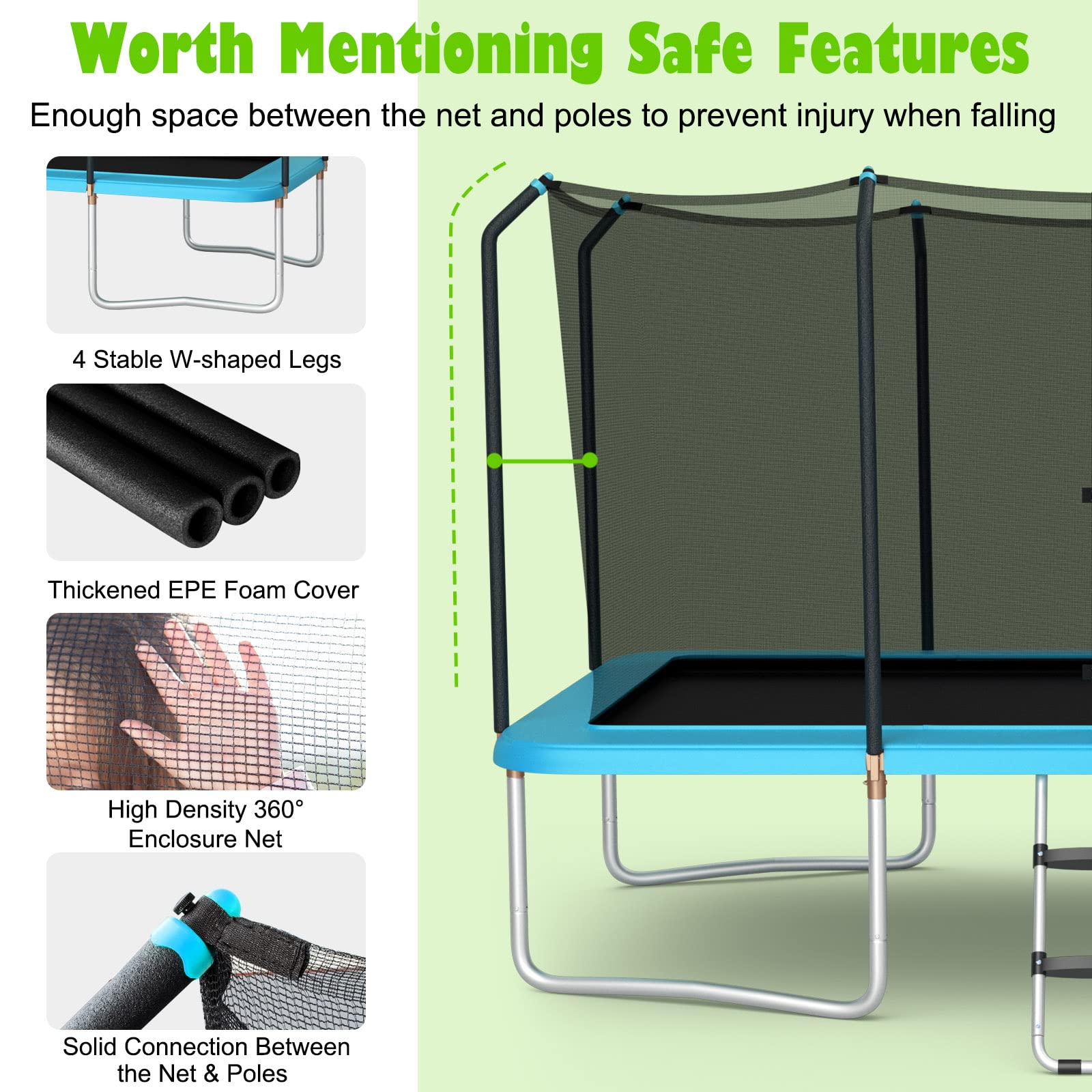 Certified by ASTM, the Giantex trampoline is surely a reliable choice for you and your family. Compared to those trampolines with straight poles, the Giantex rectangular trampoline with curved poles features ample safety space between the net and poles, protecting kids from getting injured in case of falling. The safety pad and enclosure net offer complete safety protection during jumping. And the non-slip ladder is safe to climb and the entrance is designed with safety buckles and double-headed zippers to prevent accidental opening. Constructed with hot-dip and double-side galvanized steel pipes, this large trampoline features outstanding wear and rust resistance, which is capable of long-lasting outdoor use. The jumping mat has passed thousands of hours of UV tests for prolonged outdoor service.