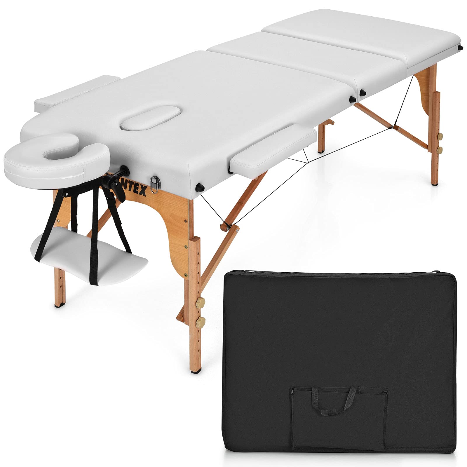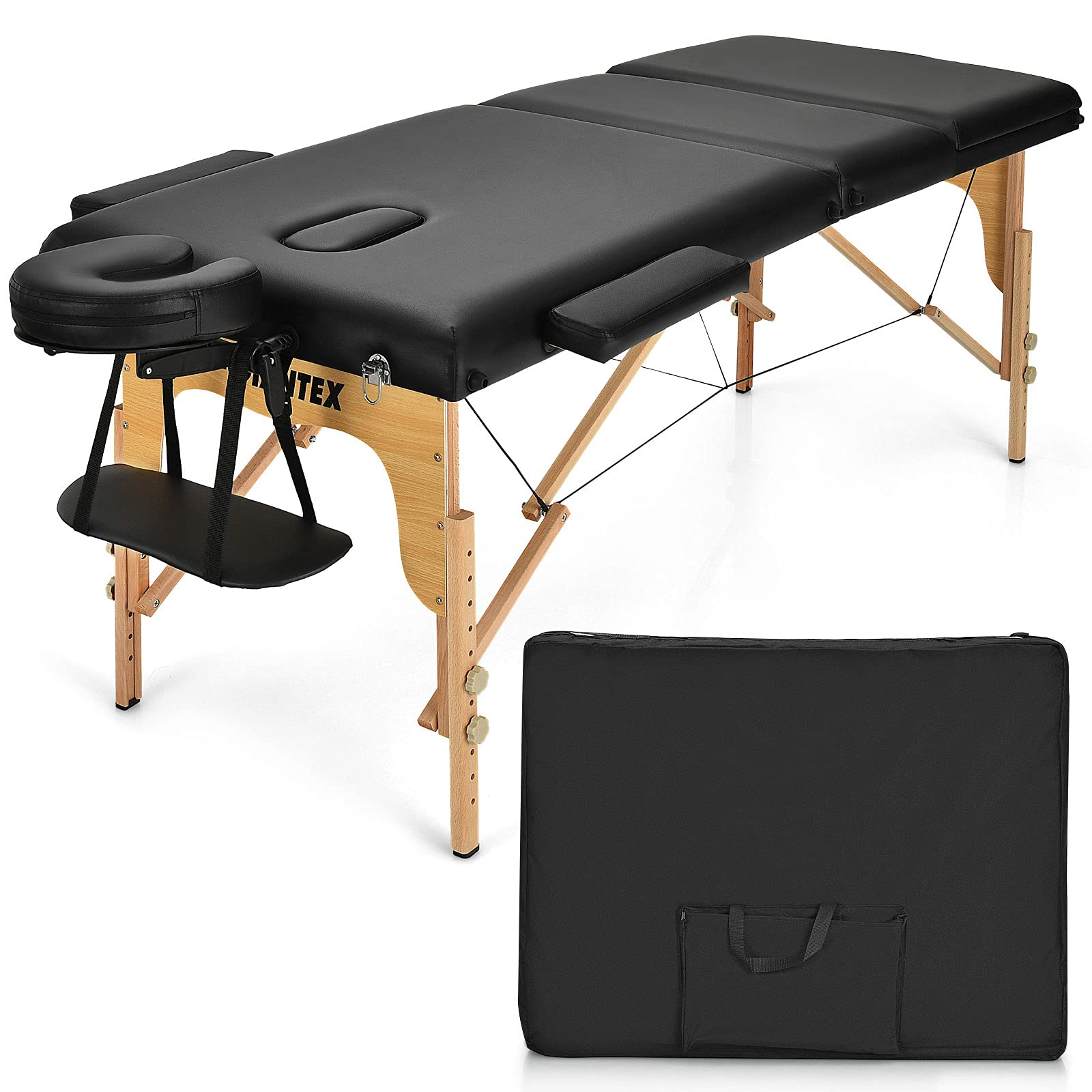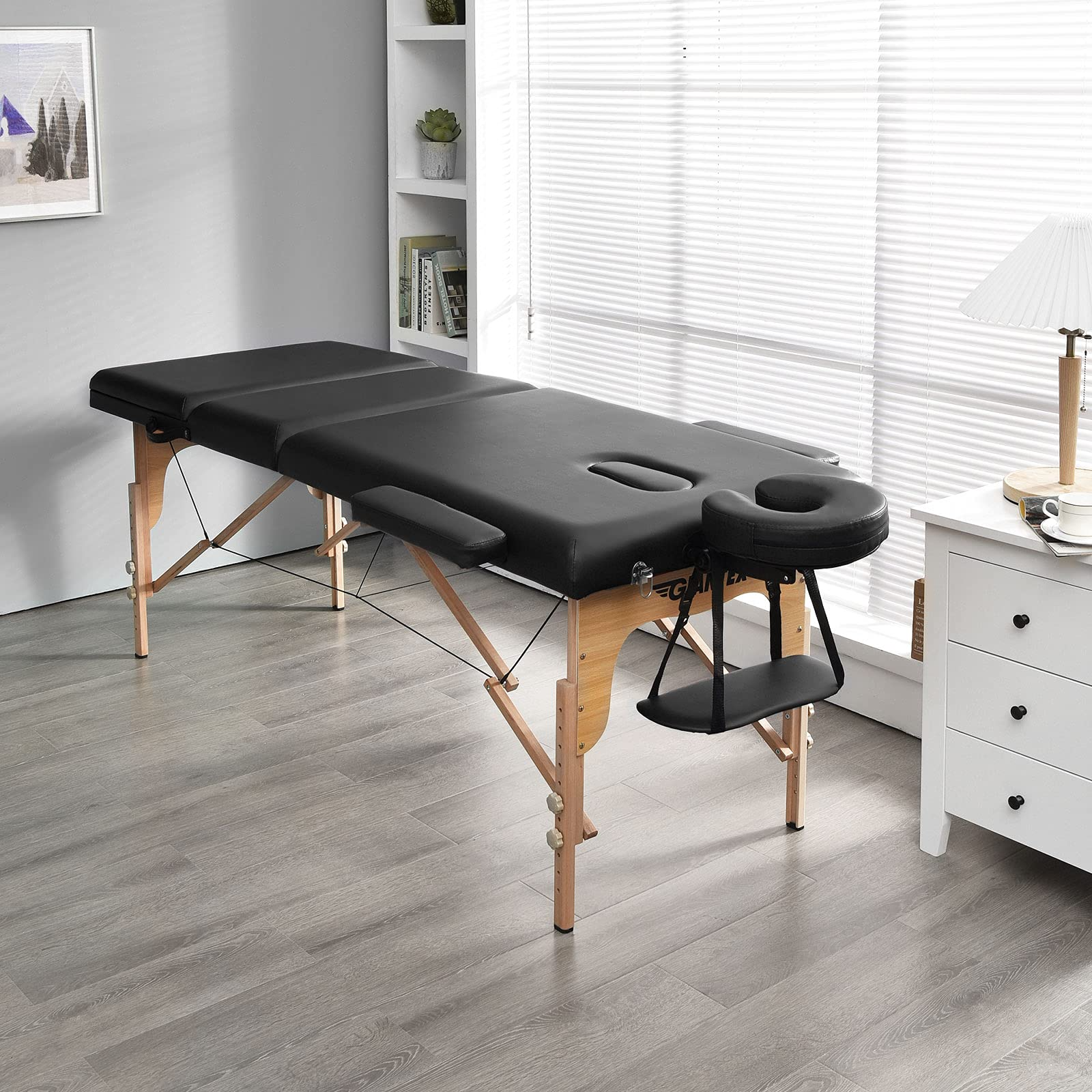 Can lie flat or sit up thanks to its adjustable backrest with 10 gear adjustment11 adjustable height positions for therapists of different heightsSupported by a sturdy beech frame and high-strength wire ropeAdds extra stability while preventing floors from scratches with anti-slip foot padsOffers a comfortable lying experience with breathable PVC leather and high-density spongeAdjustable headrest, facial cradle, hand pallet and armrests for extra comfortSuitable for spa, massage, facial care, acupuncture, tattoo, beauty treatment, etc.Foldable design and included carrying bag for easy carrying and storageCarrying bag has an adjustable shoulder strap and side storage pocketSuitable for many occasions, such as home, women club, beauty salon and so on