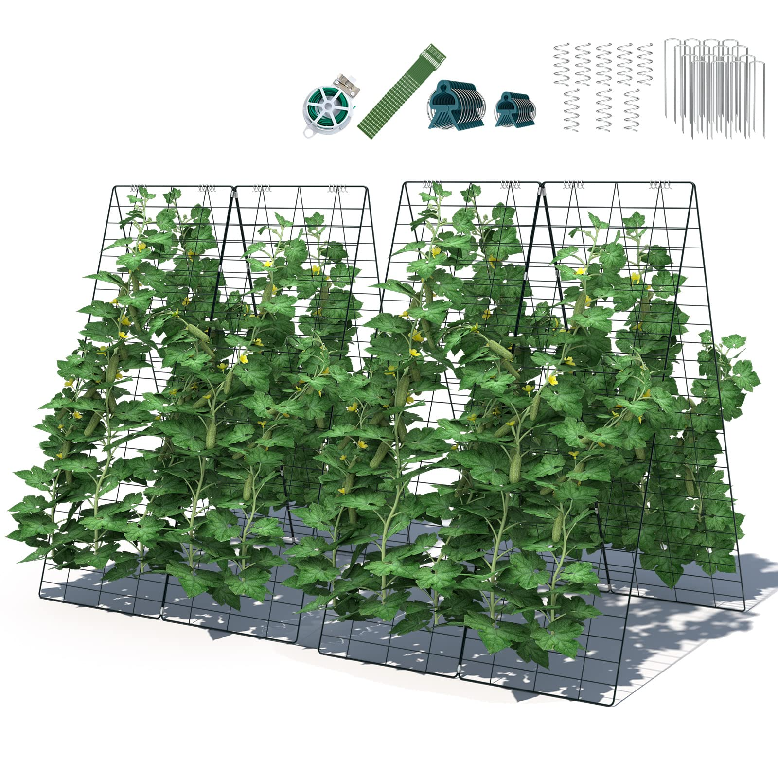 Weather-Resistant & Rust-Proof Trellis The cucumber trellis is constructed of rustproof and peel-resistant steel wires, providing strong support for plants to grow better, hold plants in a graceful shape, and prevent flopping. Besides, there exist 16 ground stakes for fixation.