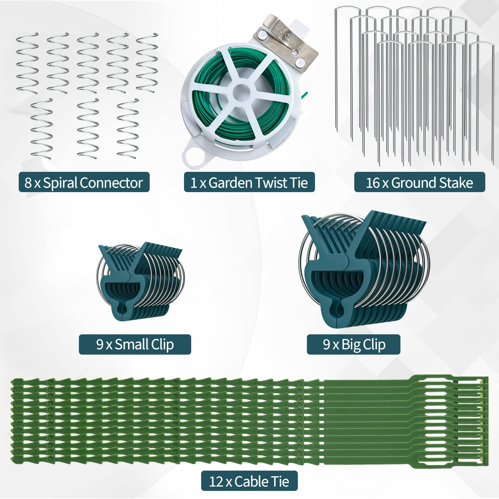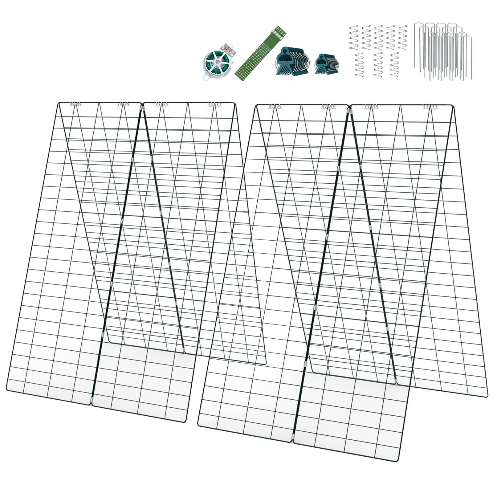 8 Panels with Complete Accessories The trellis rack can better increase air circulation and make plants absorb more sunlight. It also includes complete accessories to help plant: 9 big clips, 9 small clips, 16 ground stakes, 8 spiral connectors, 12 cable ties, and a garden twist tie.