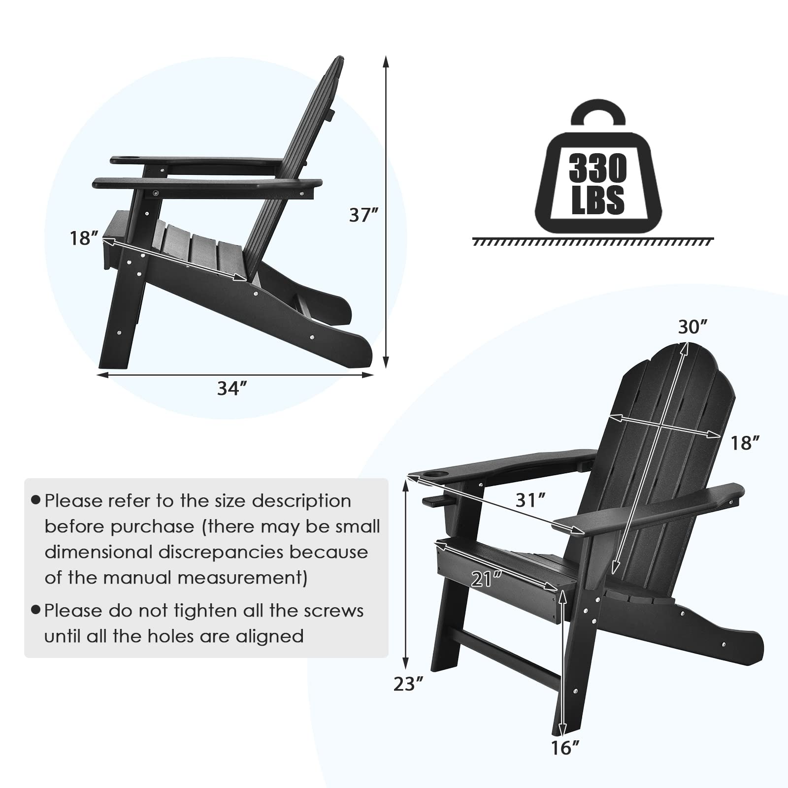 - How About the Assembly Step: Our lifetime adirondack chairs are not very hard to assemble. All necessary hardware and detailed instructions are provided with this Adirondack chair. You can quickly connect all chair parts by yourself with ease and without spending too much time. Overall dimension: 34” x 31” x 37” (L x W x H), weight capacity: 330 lbs.
