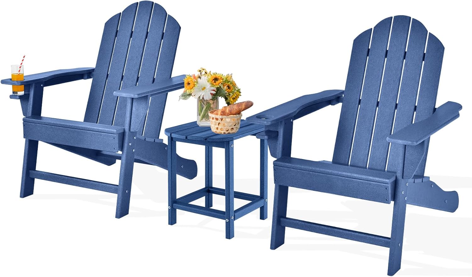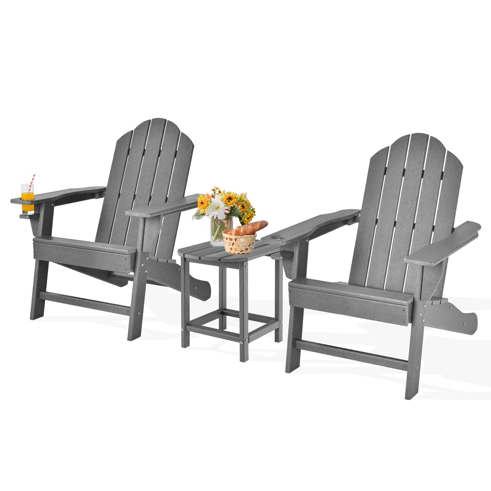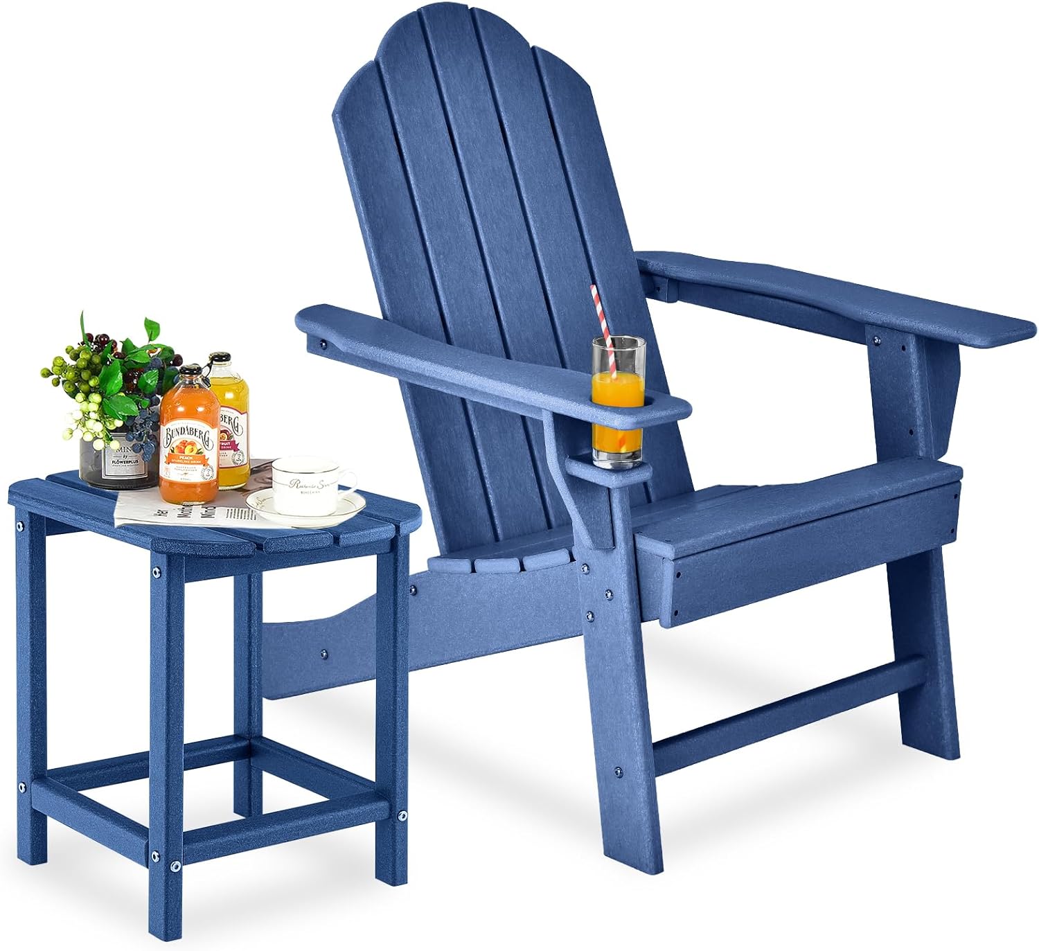 To strengthen the overall outdoor ability, this outdoor fire pit furniture set uses the weather resistant PE material and connects by the 304 stainless steel screws. Therefore, you can sit on the ergonomic Adirondack chair and put your items on the convenient side table for outdoor enjoyment. The drinks can be stored in the cup holder as well. And the low maintenance and easy installation endow additional convenience for you.