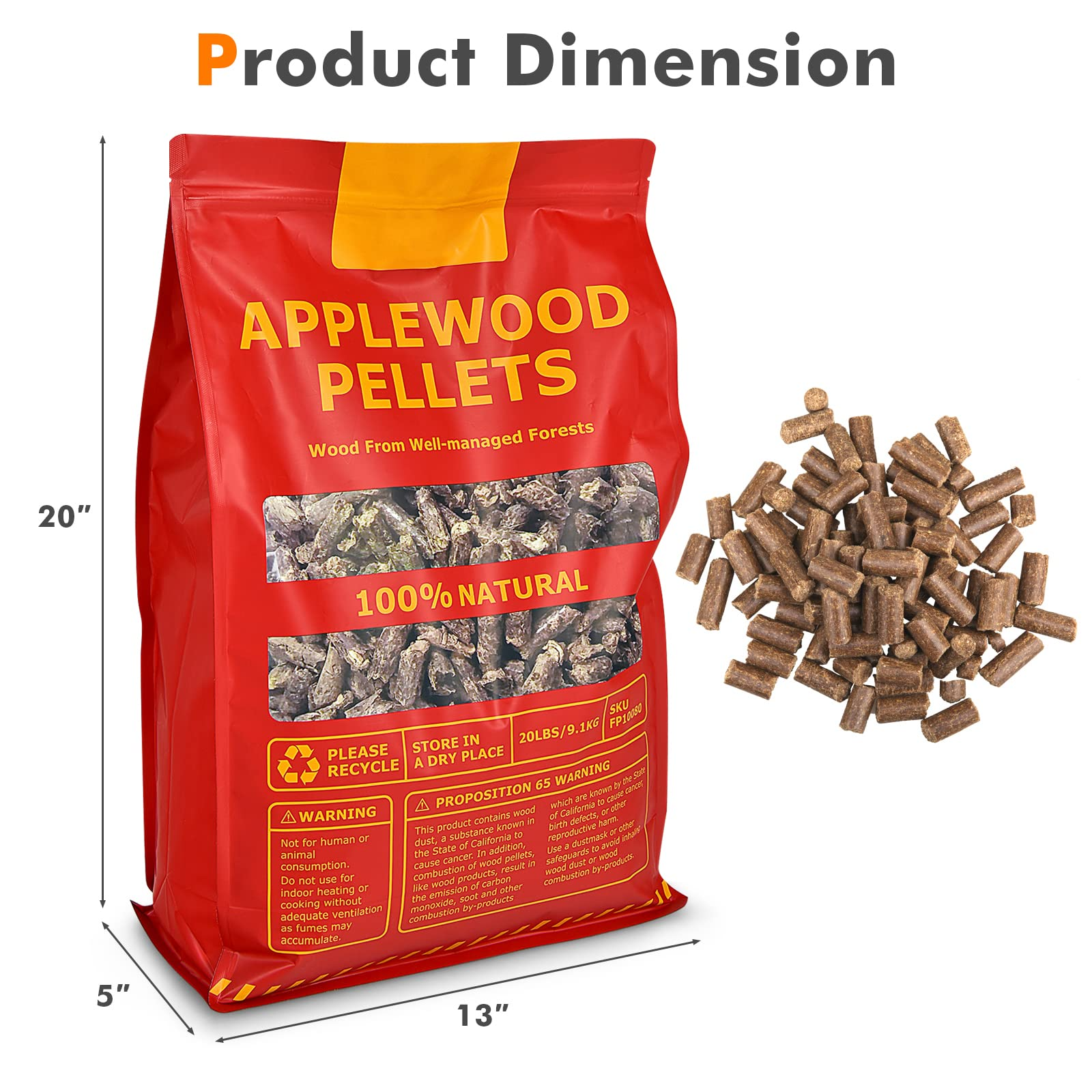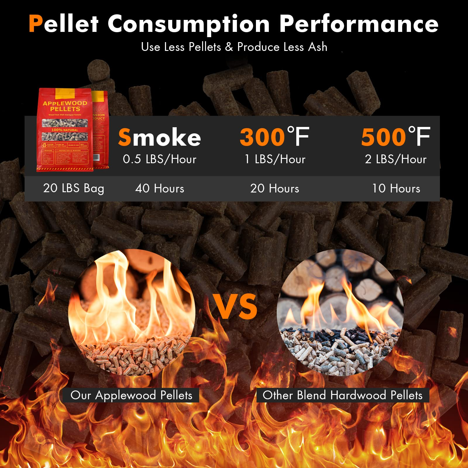 Outstanding Burning Performance: Compared to other hardwood pellets and wood clips, our premium apple wood pellets are able to reach 500 more quickly with fewer pellets. If you use it to smoke, the 20 lbs pellets can be burned for up to 40 hours or so (0.5 lbs per hour).