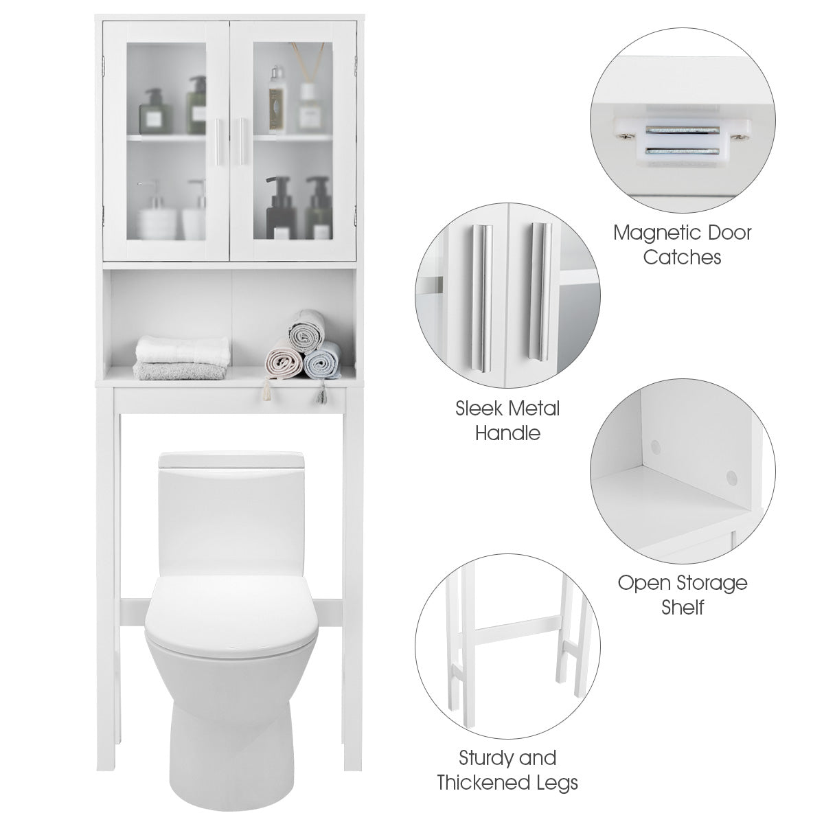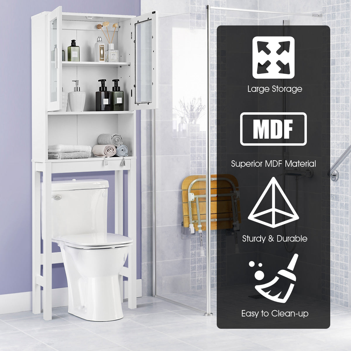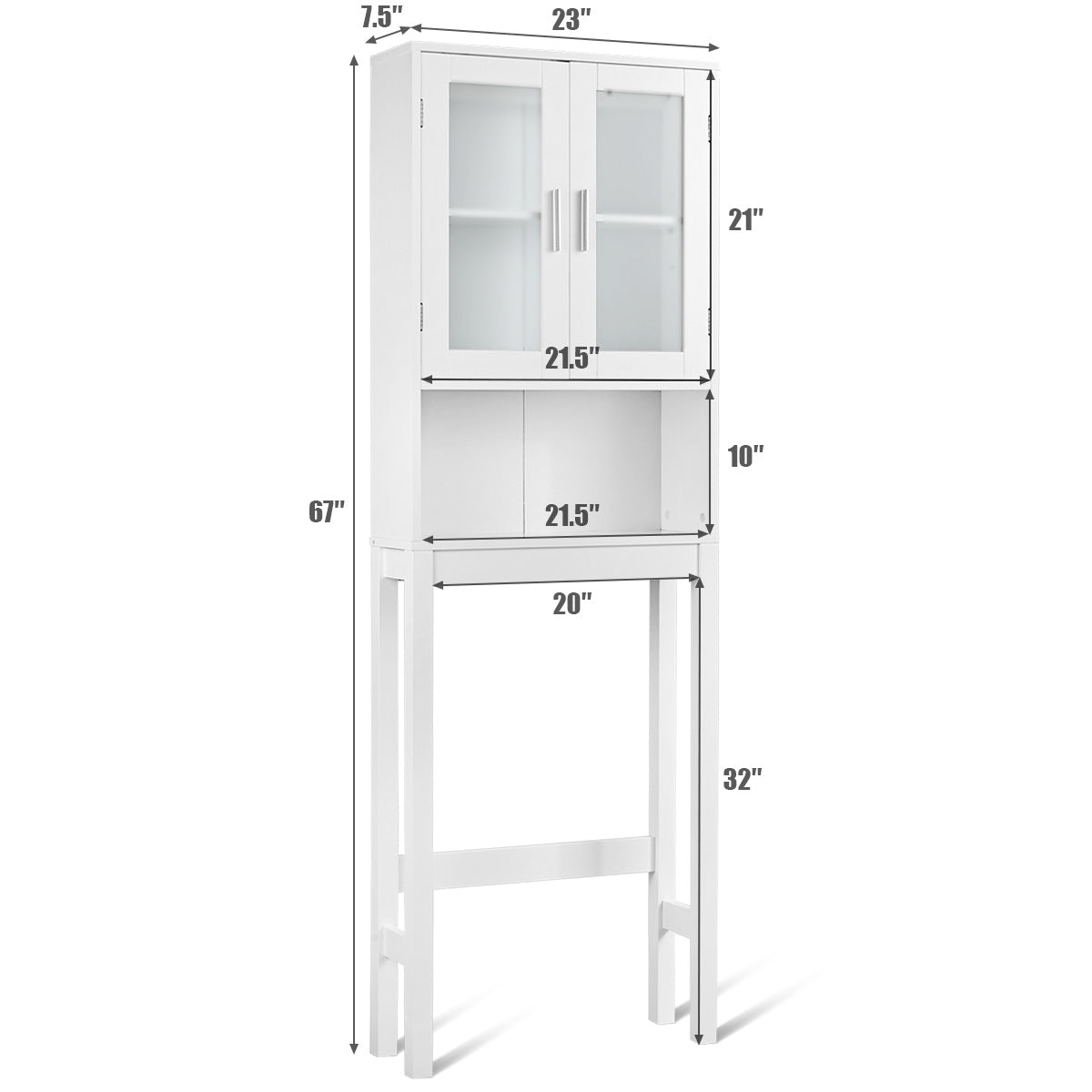 Our brand new clever and versatile bathroom spacesaver allows you to utilize extra space for all your bathroom storage needs. Place this white bathroom space saver around the toilet and add bathroom storage space quickly and easily. Features an two-door cabinet and an open shelf for easy access storage. The cabinet provides excellent storage solutions for bathrooms with limited space. This bathroom space saver features sturdy MDF construction, and its white finish ensures that it will match and accent any existing decor. It is a free standing furniture piece, which conveniently fits over standard toilet tanks and adds easy storage for roll paper and other bathroom necessities. Don?? hesitate to buy it!