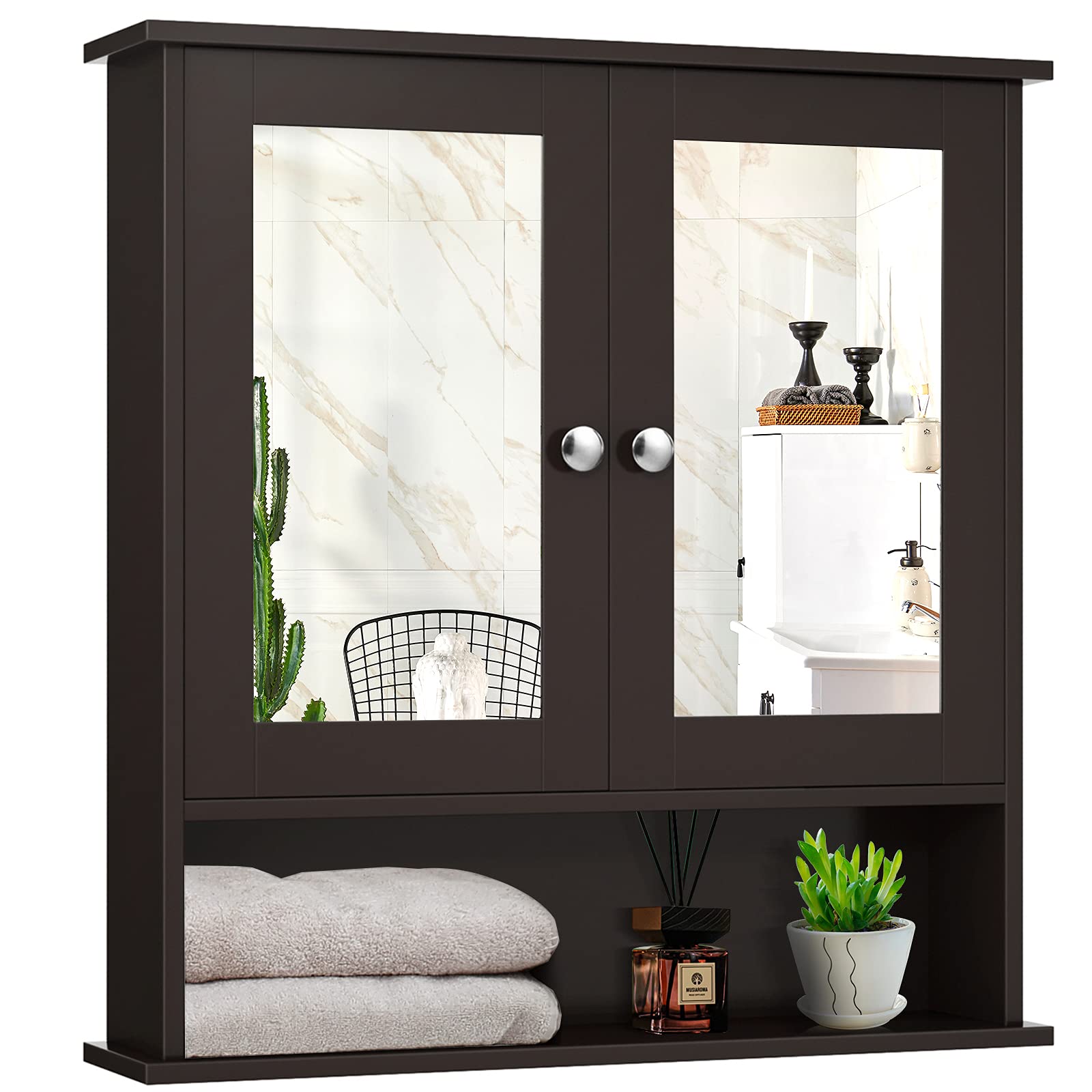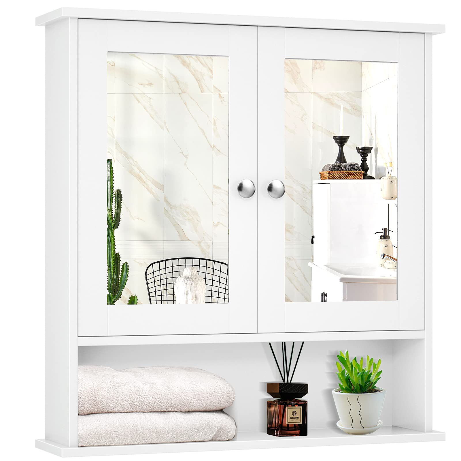 Are you suffering from limited and messy space in the bathroom? Our wall-mounted cabinet with a mirror is a perfect solution! This 3-tier cabinet with an adjustable shelf provides ample and flexible storage space for your bathroom essentials or other items. The built-in mirror is designed for convenient everyday makeup or shaving. As for quality, made of high-quality MDF with premium paint, this bathroom hanging cabinet is durable, stable, and waterproof, which can serve you for a long time. Moreover, with an elegant and modern style, this mirror cabinet can perfectly blend in various decoration styles and is multifunctional to be used in your bathroom, bedroom, living room, or entryway.