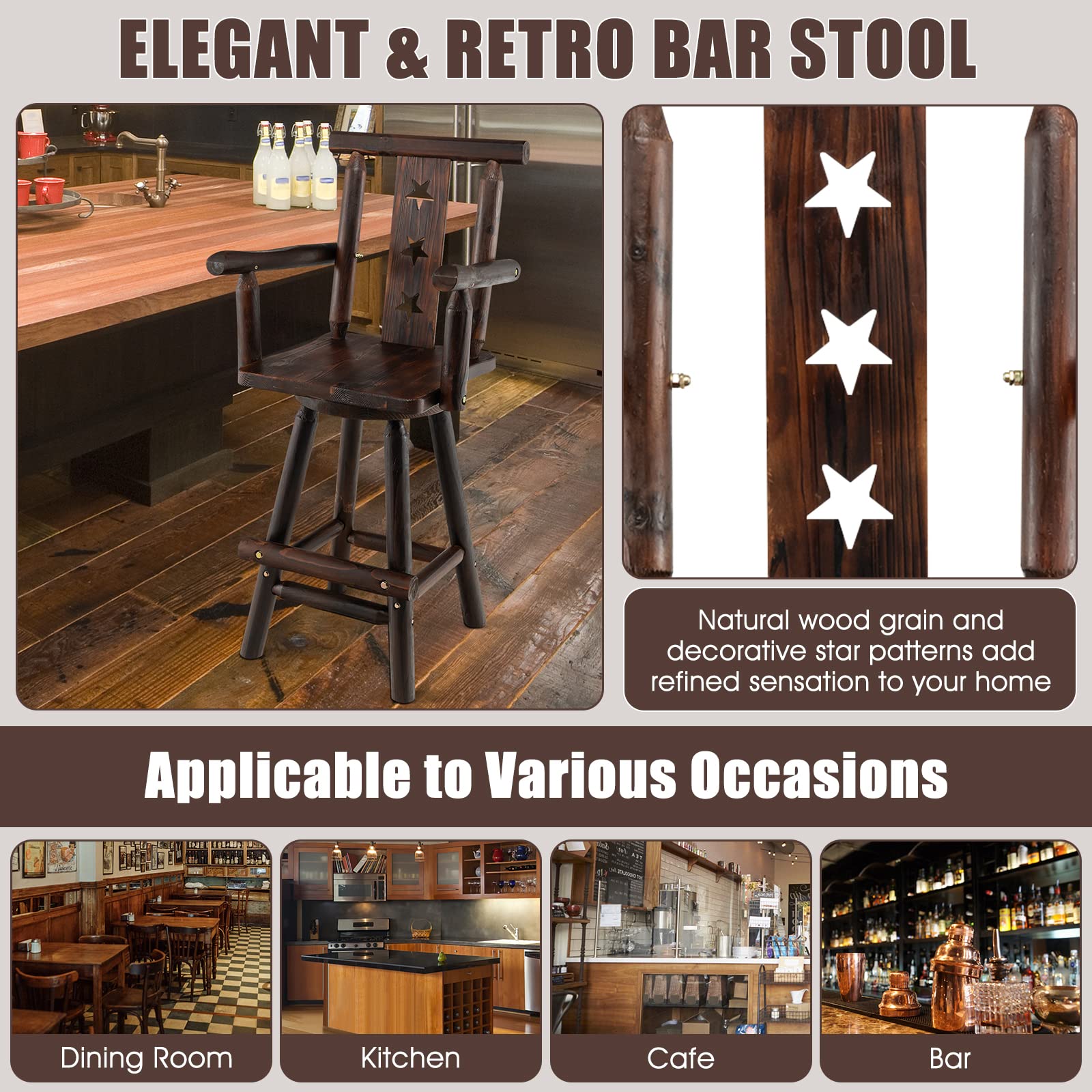 Brown Bar Stool, 29’’ Solid Fir Wood Bar Chair with Footrest, Decorative Star Backrest, Wide Armrest, Rustic Kitchen Stool