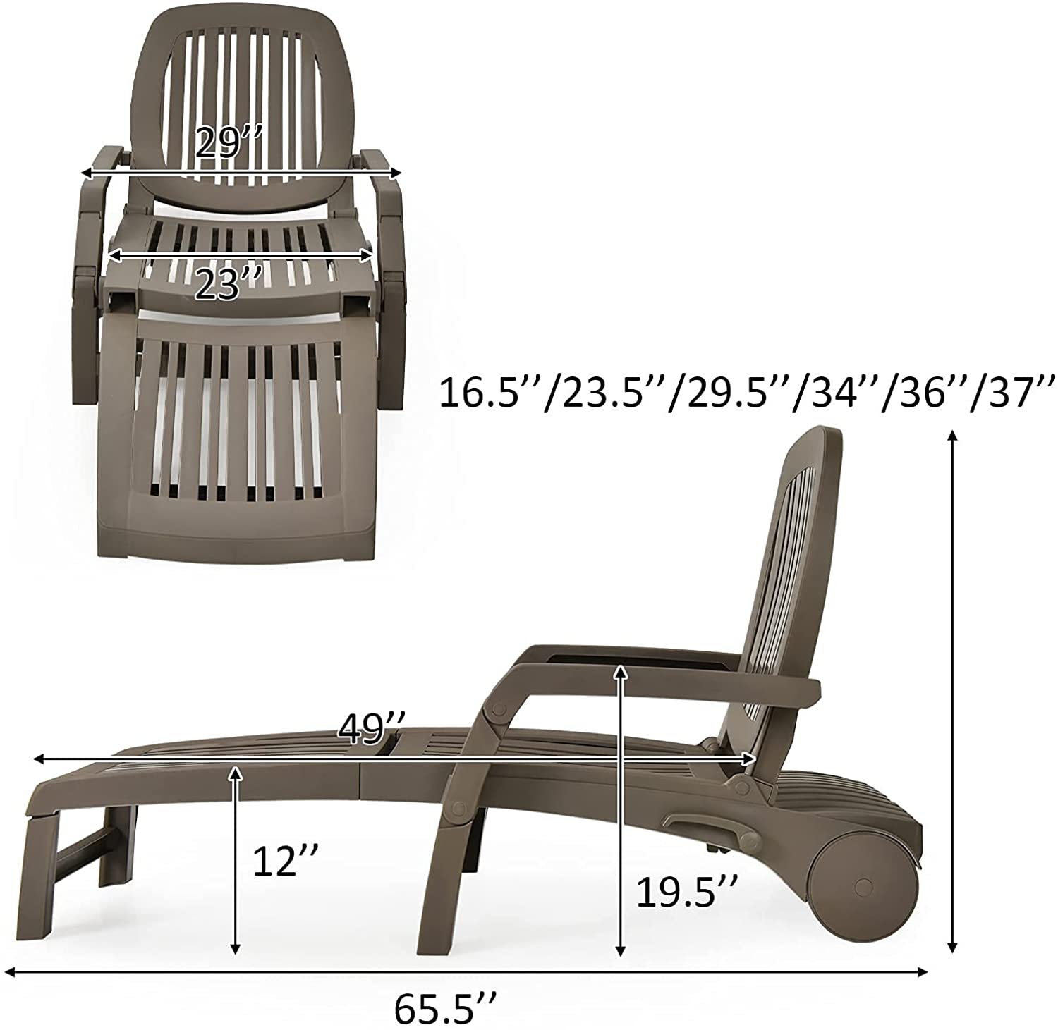 - Foldable Design for Convenient Transportation: This outdoor plastic recliner can be quickly folded into a compact size within 1 minute in a few simple steps for convenient storage. What's more, with two smooth wheels, this sun recliner makes it easy for you to transfer it from outdoors to indoors. In view of the fact that you may need to store some sundries, this recliner is designed with a storage box which is in the back of backrest to satisfy you.