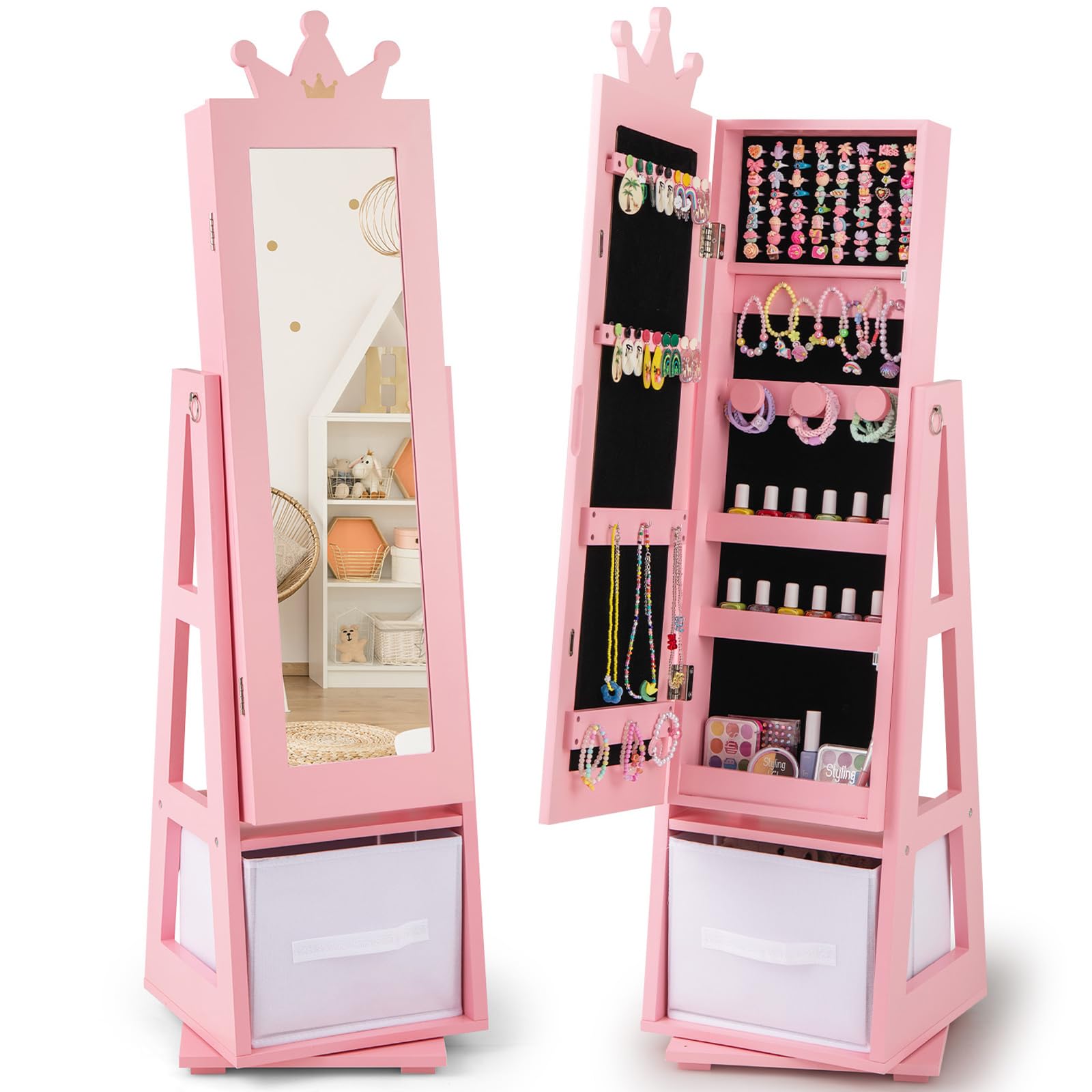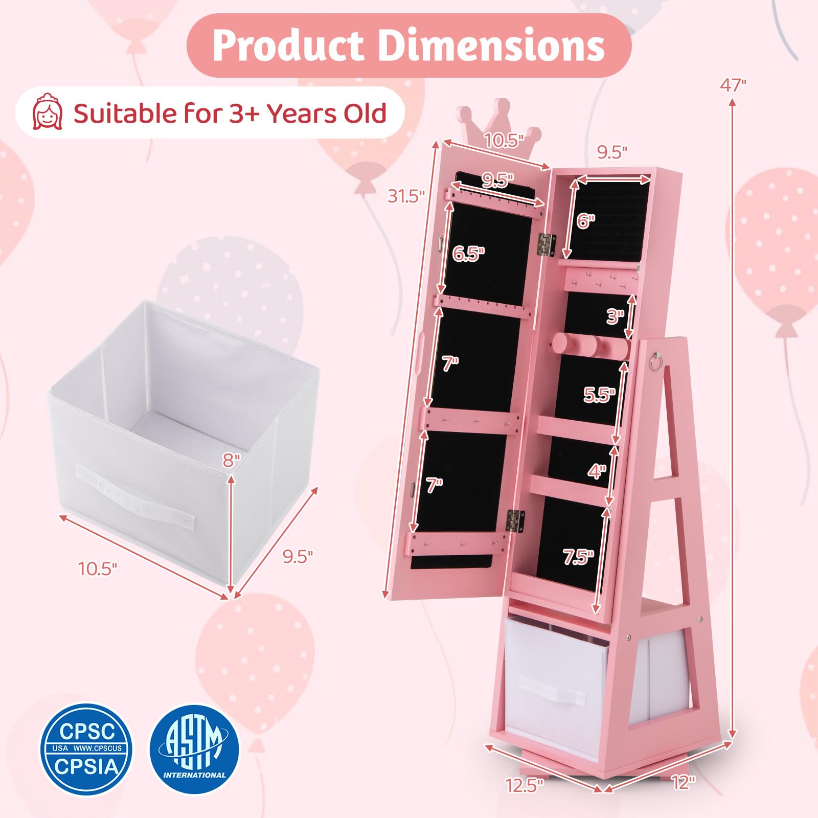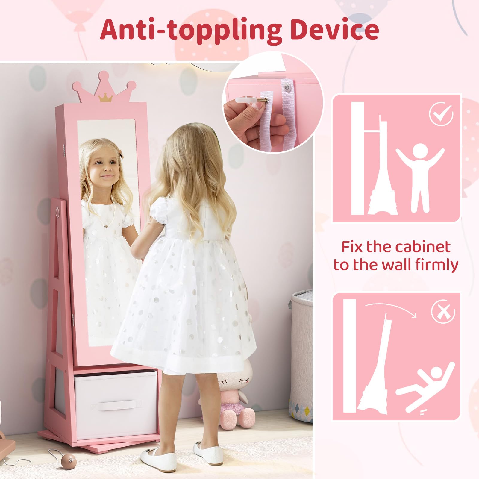 Enhance your child's room with our multifunctional kids' jewelry cabinet, featuring a 360° swivel base for easy access, a full-length dressing mirror, and a rear storage rack. The freestanding full-length dressing mirror not only offers clear reflection, but also allows for a complete head-to-toe view. The large capacity interior includes multiple hooks and shelves, providing ample space to store and sort jewelry collections, hair accessories, or small treasures. In addition, the foldable fabric drawer and rear shelf offer additional storage space. What's more, to enhance overall stability and security, this freestanding jewelry cabinet includes an anti-toppling device.