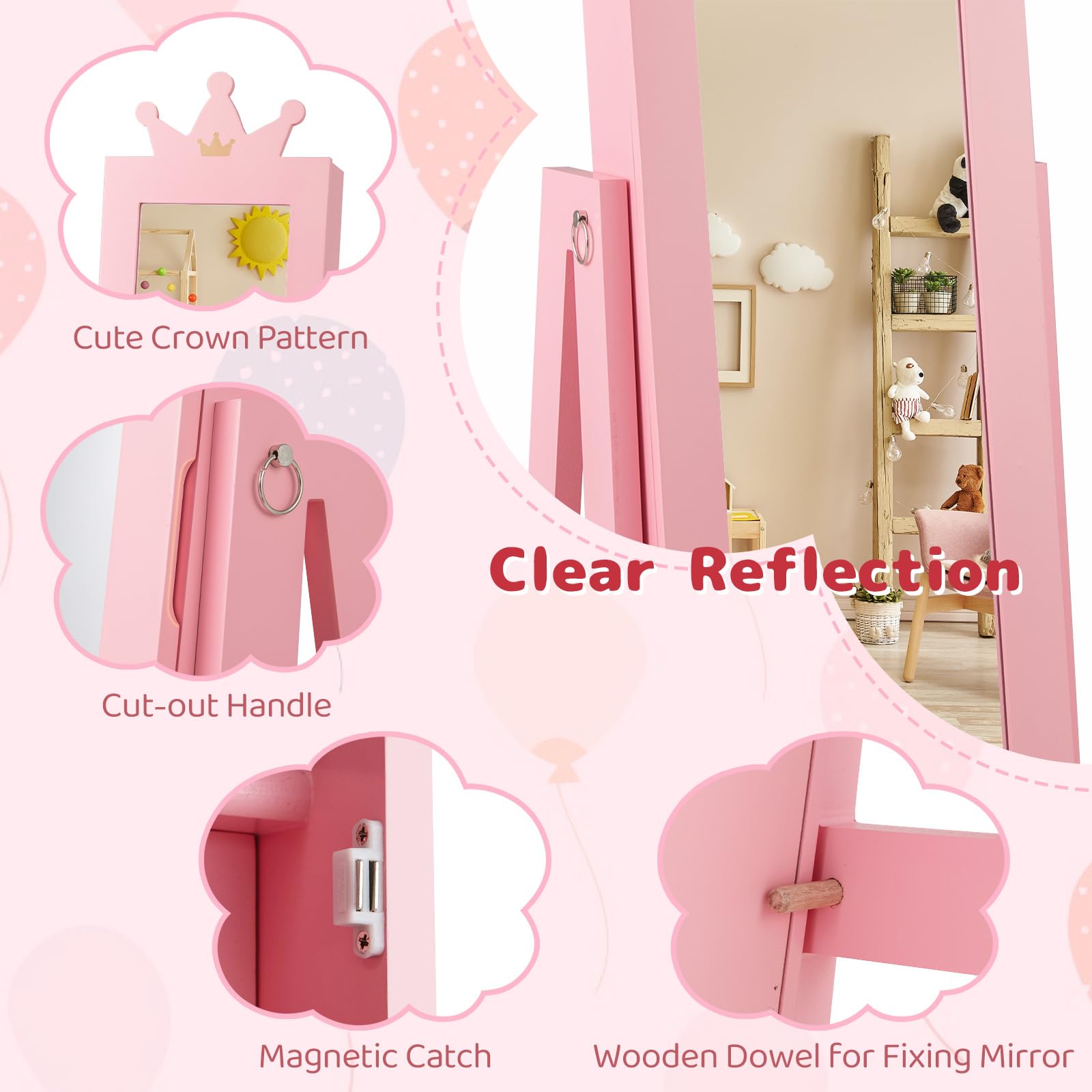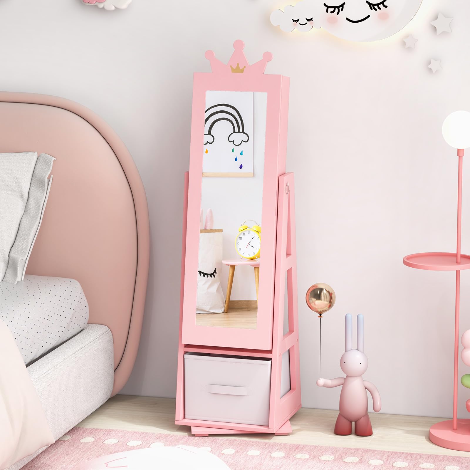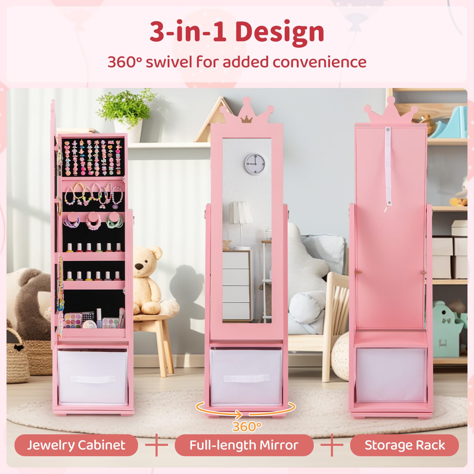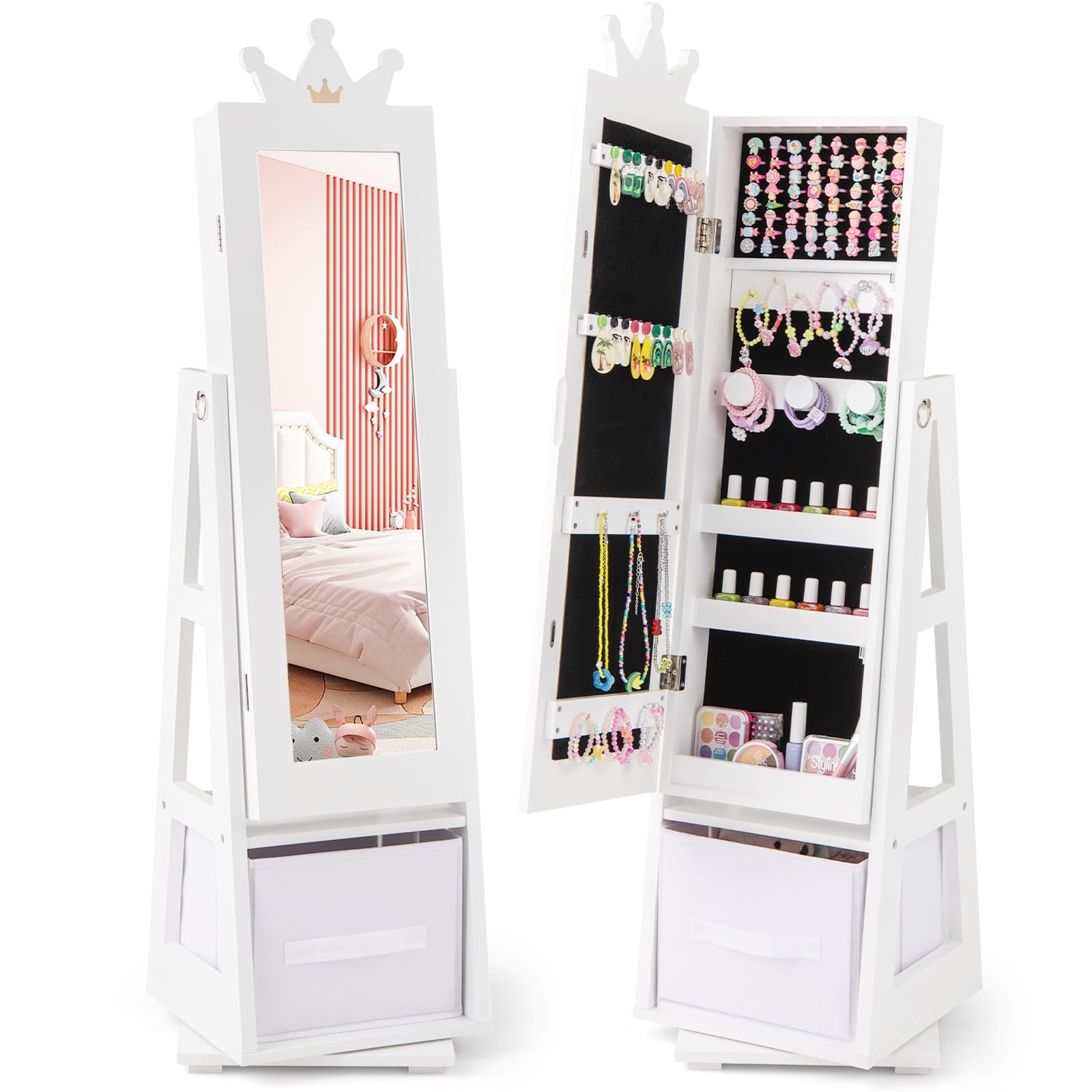 Enhance your child's room with our multifunctional kids' jewelry cabinet, featuring a 360° swivel base for easy access, a full-length dressing mirror, and a rear storage rack. The freestanding full-length dressing mirror not only offers clear reflection, but also allows for a complete head-to-toe view. The large capacity interior includes multiple hooks and shelves, providing ample space to store and sort jewelry collections, hair accessories, or small treasures. In addition, the foldable fabric drawer and rear shelf offer additional storage space. What's more, to enhance overall stability and security, this freestanding jewelry cabinet includes an anti-toppling device.