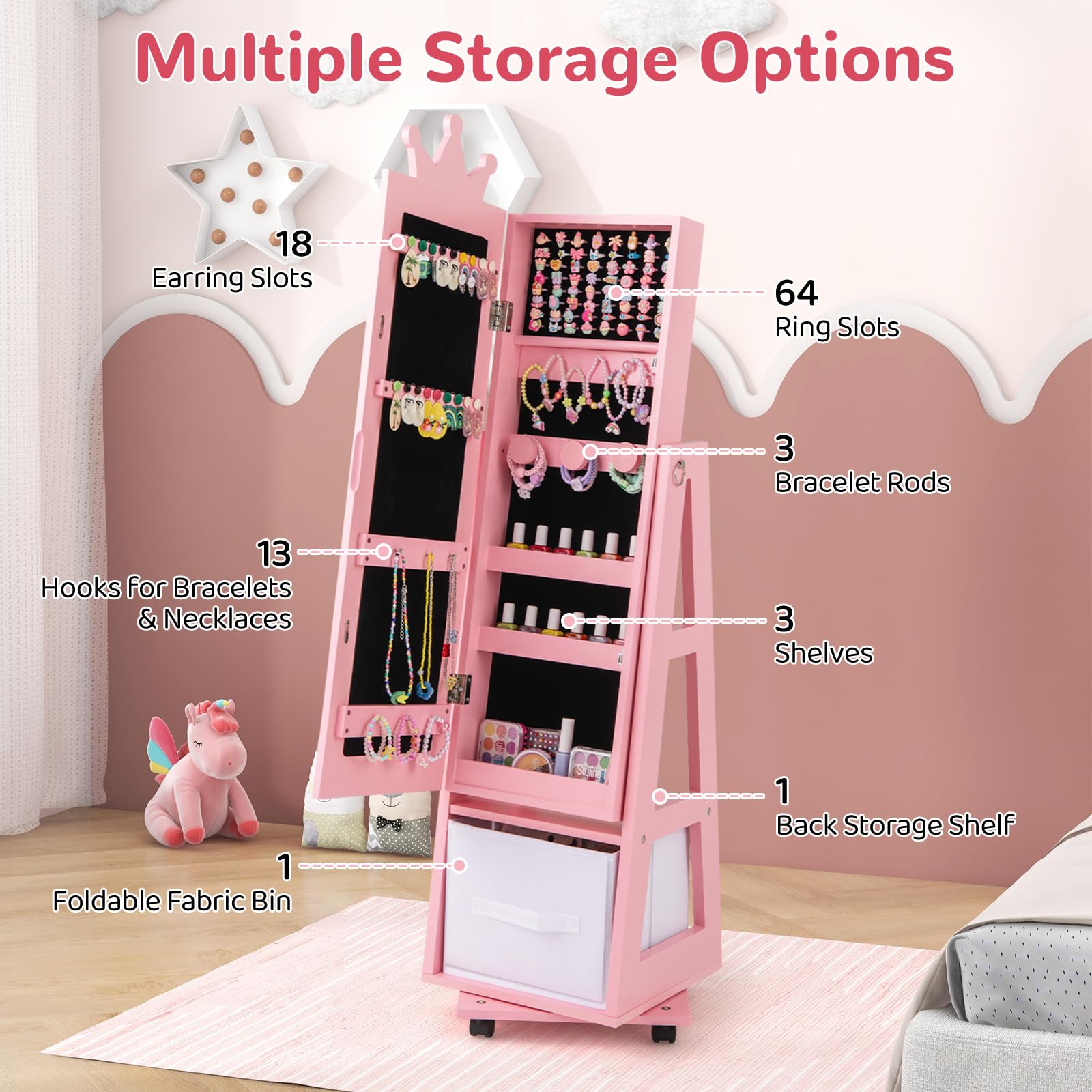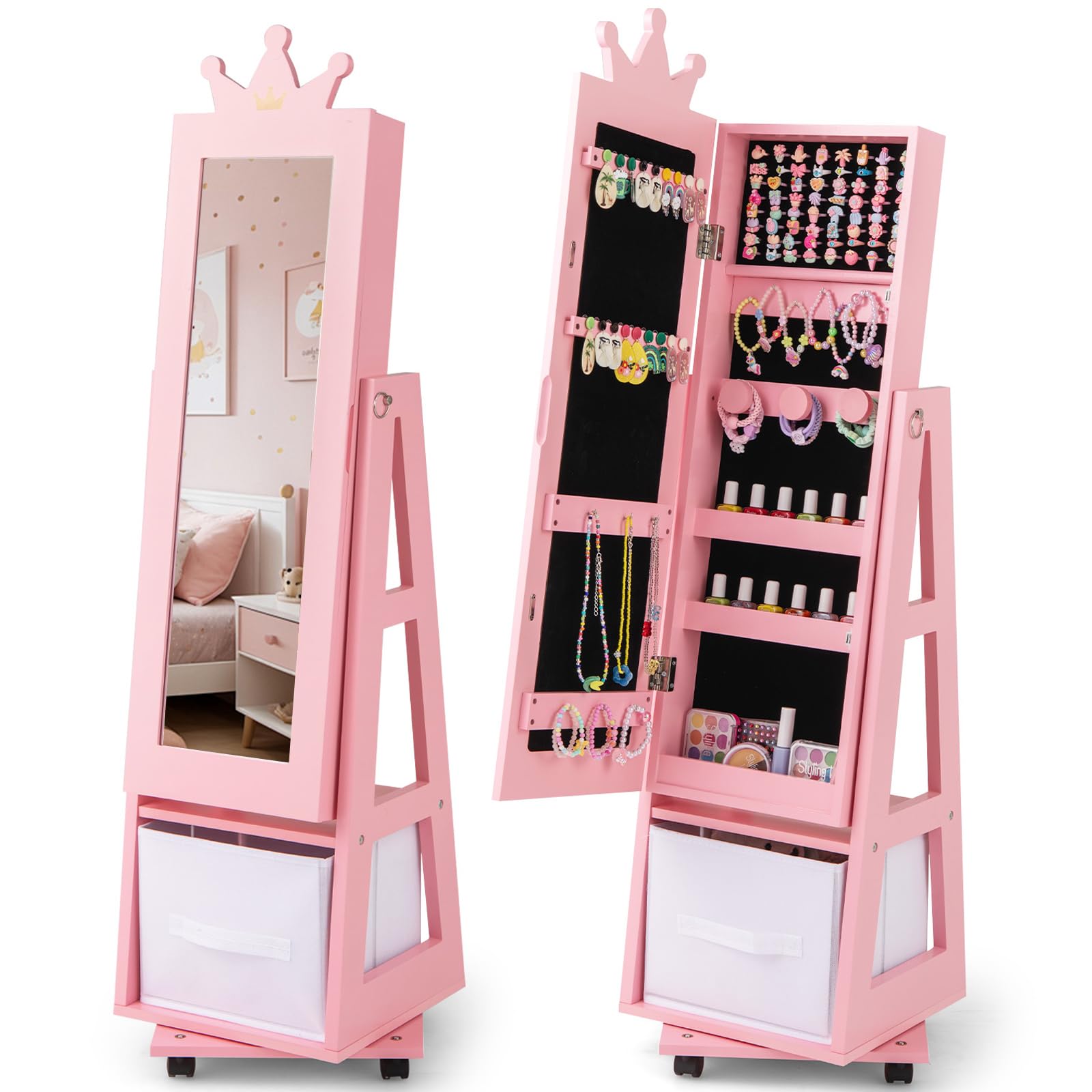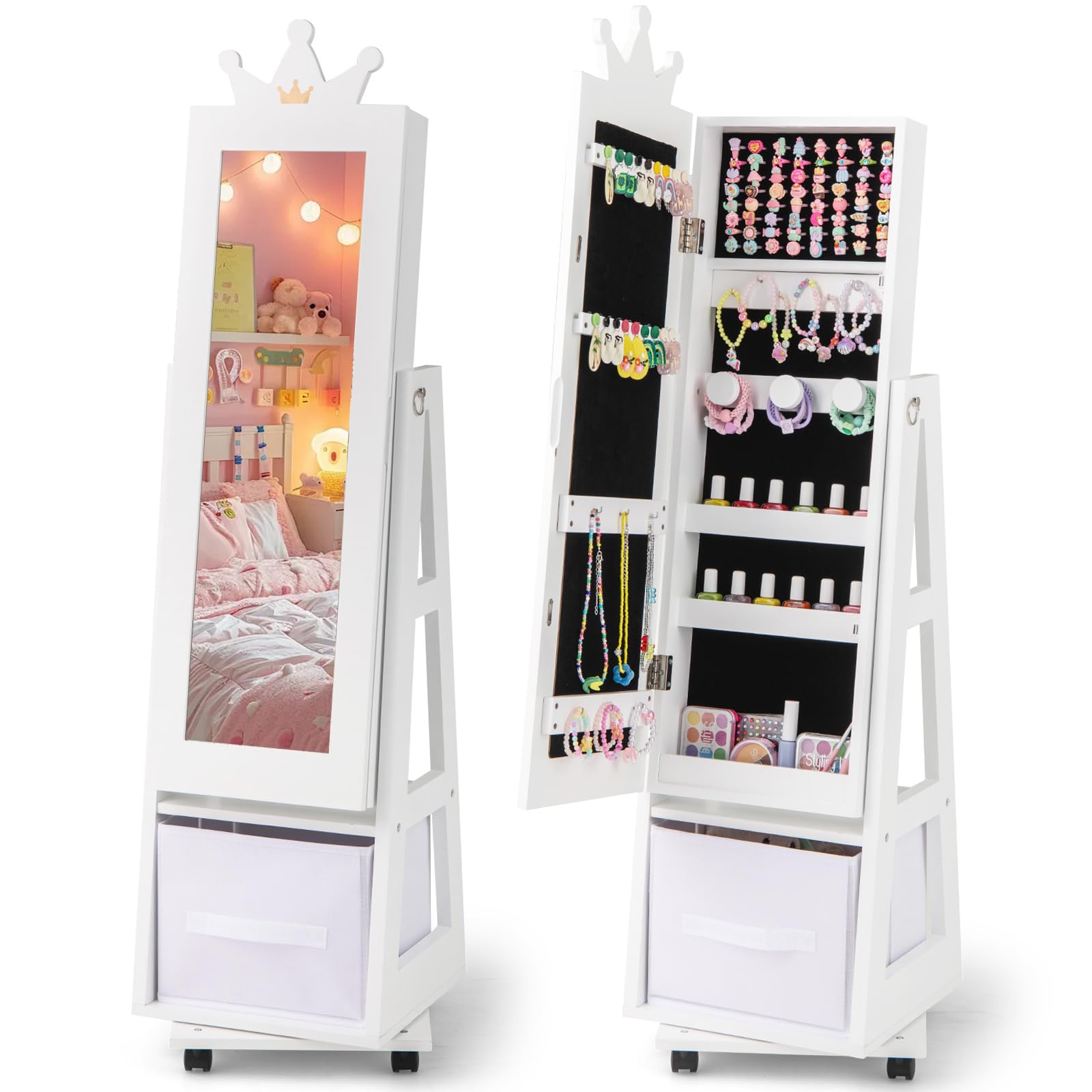 With lots of earring slots, hooks, ring slots, shelves and more, this jewelry organizer keeps your kid’s treasures neatly organized and easily accessible. The swivel base and lockable universal wheels enhance accessibility and stability. This multifunctional jewelry armoire is a perfect gift choice for birthdays, Christmas, and children's day.