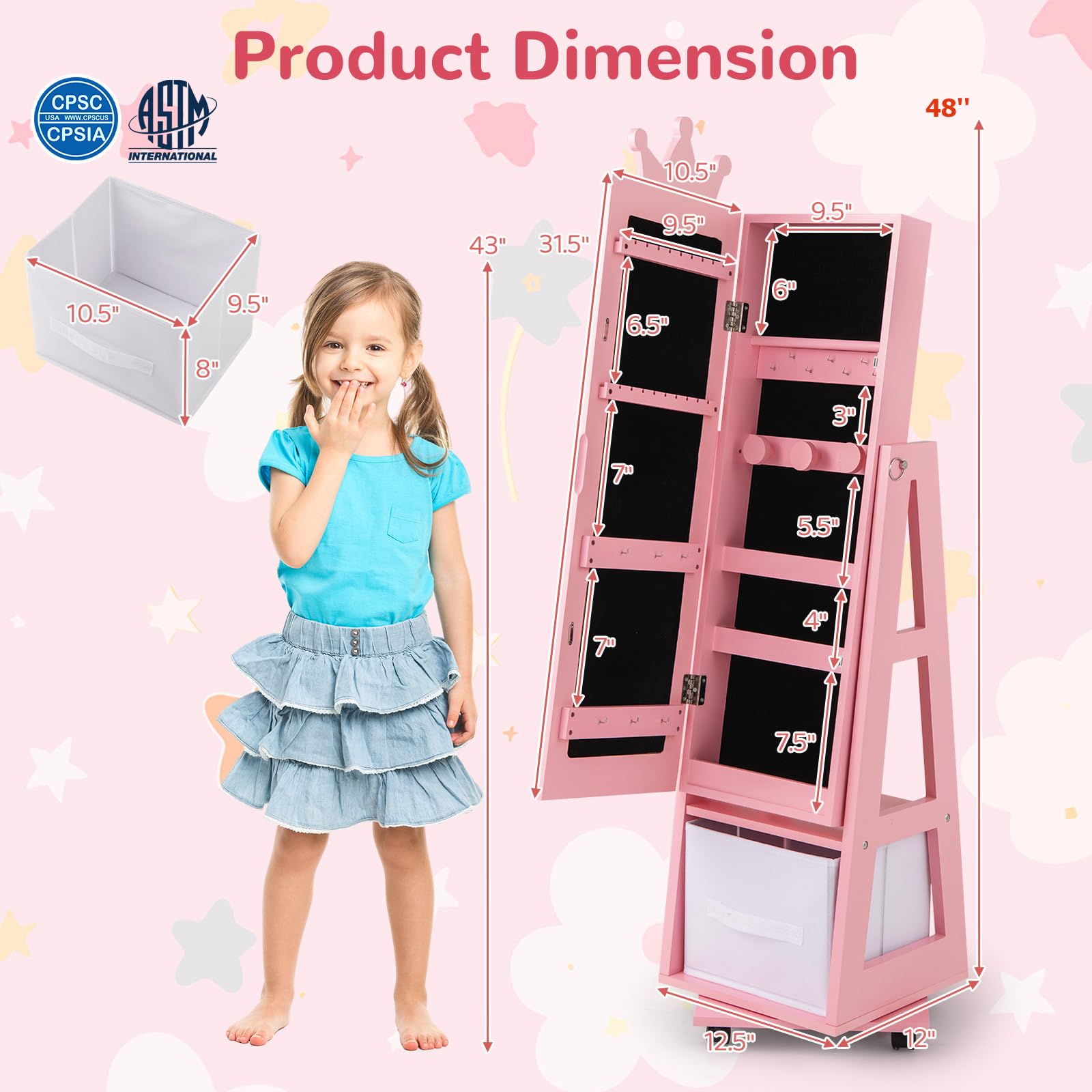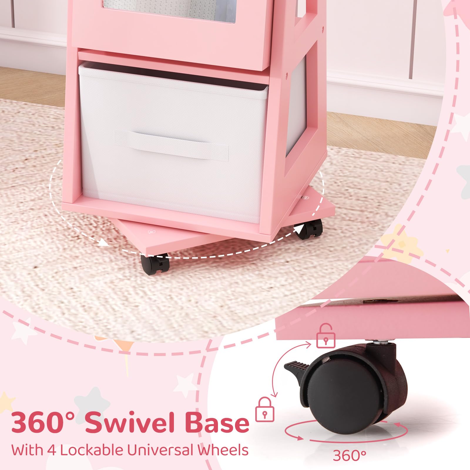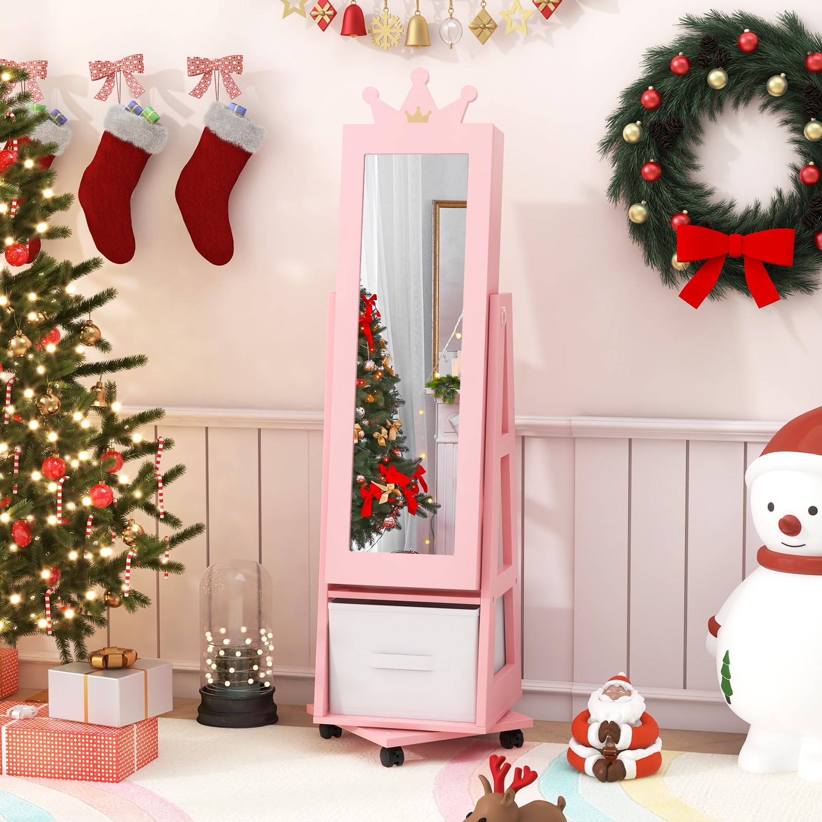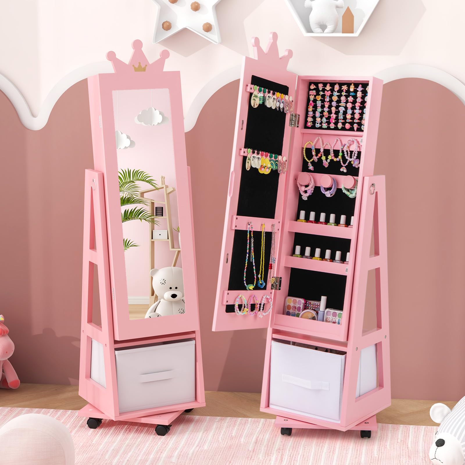 With lots of earring slots, hooks, ring slots, shelves and more, this jewelry organizer keeps your kid’s treasures neatly organized and easily accessible. The swivel base and lockable universal wheels enhance accessibility and stability. This multifunctional jewelry armoire is a perfect gift choice for birthdays, Christmas, and children's day.