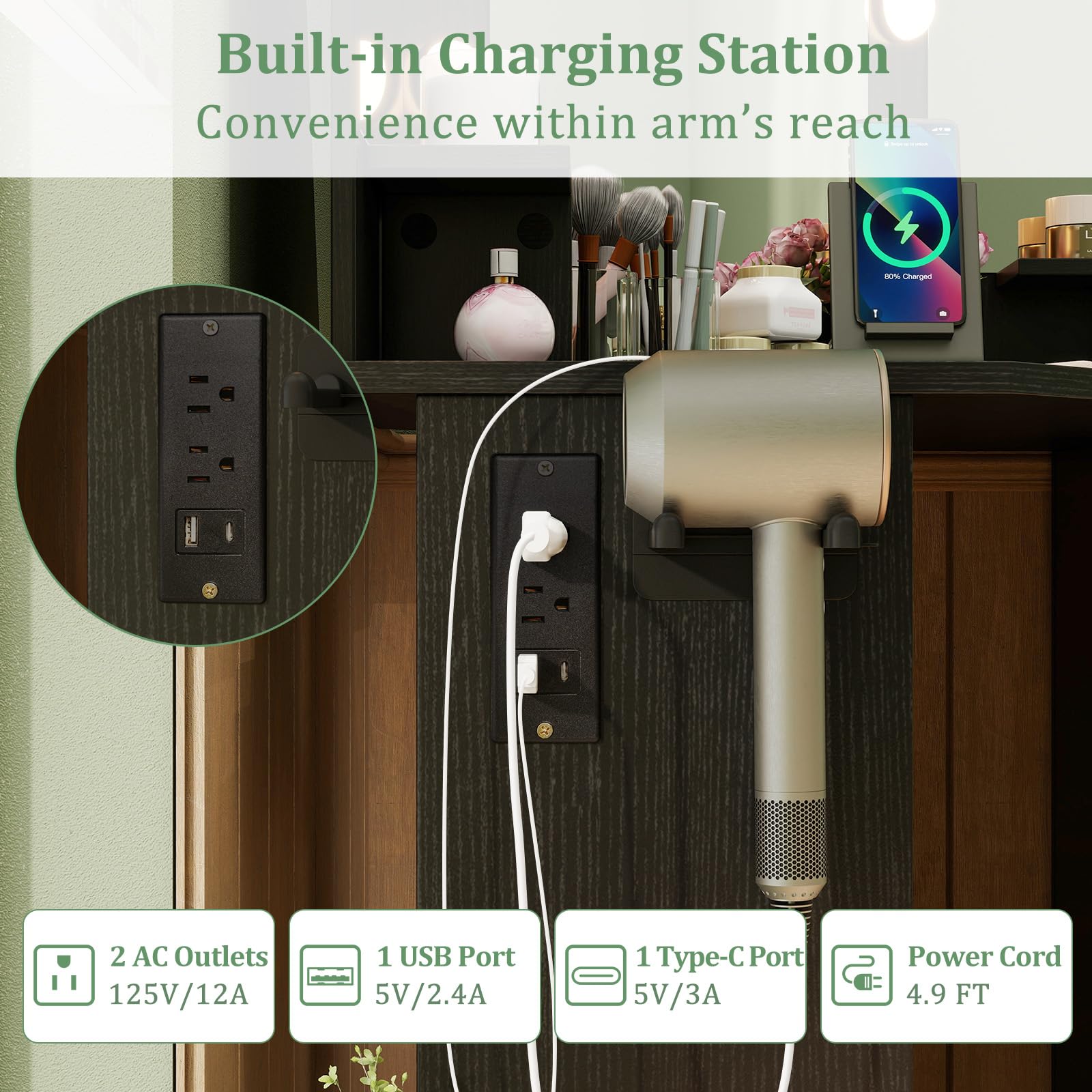 - [Built-in Charging Station]: Stay connected while you get ready! This vanity desk features 2 AC outlets, 1 USB port, and 1 Type-C port, allowing you to conveniently charge multiple devices without leaving your seat.
