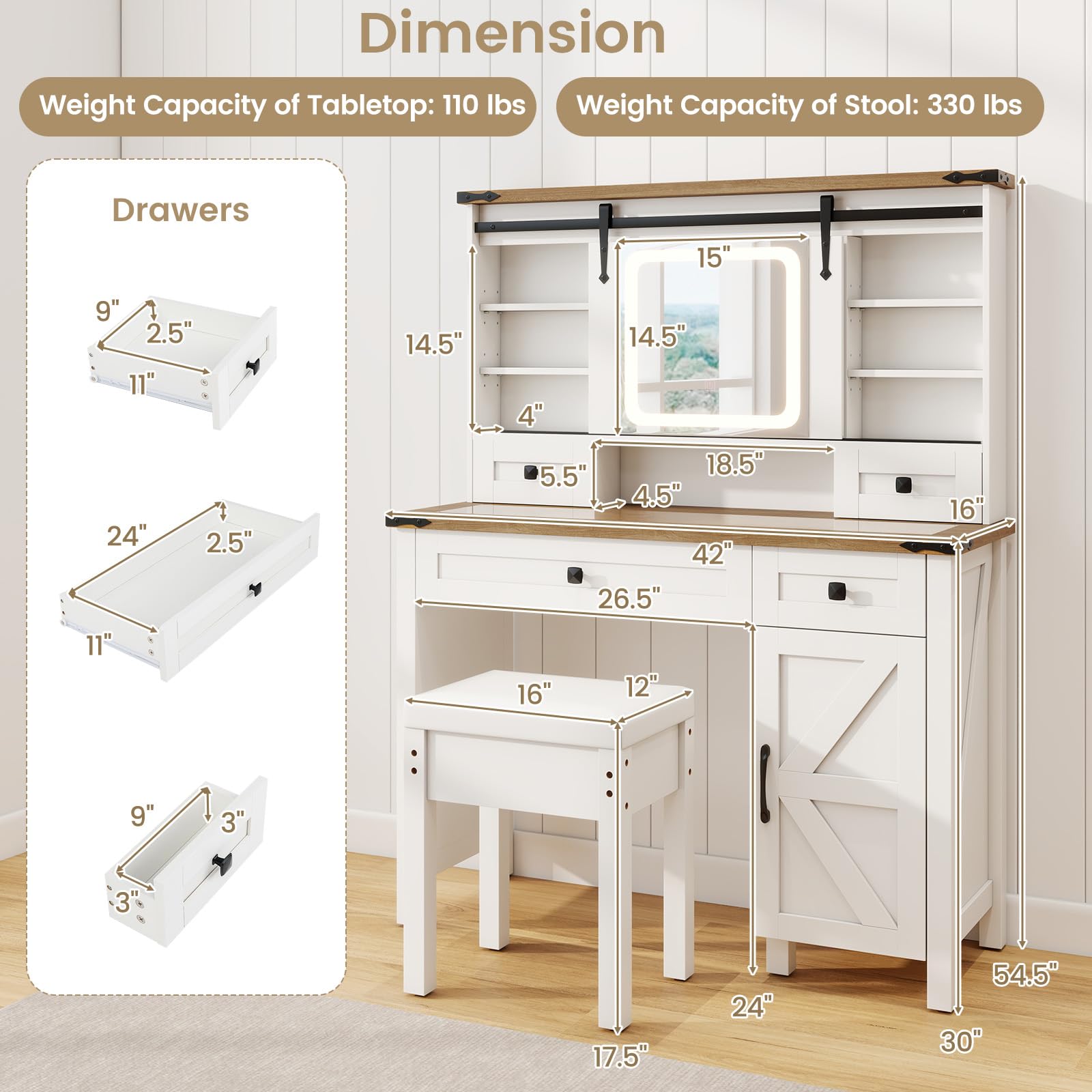 The sliding mirror offers easy access to storage shelves behind the mirror, and the LED lights features adjustable brightness and 3-color lighting options. Moreover, you stay organized with small and large drawers, shelves, and a side cabinet. Moreover, the glass tabletop allows you to easily locate the jewelry and items you want. With its farmhouse design and thoughtful features, this makeup vanity desk set makes a stylish and practical gift for loved ones.