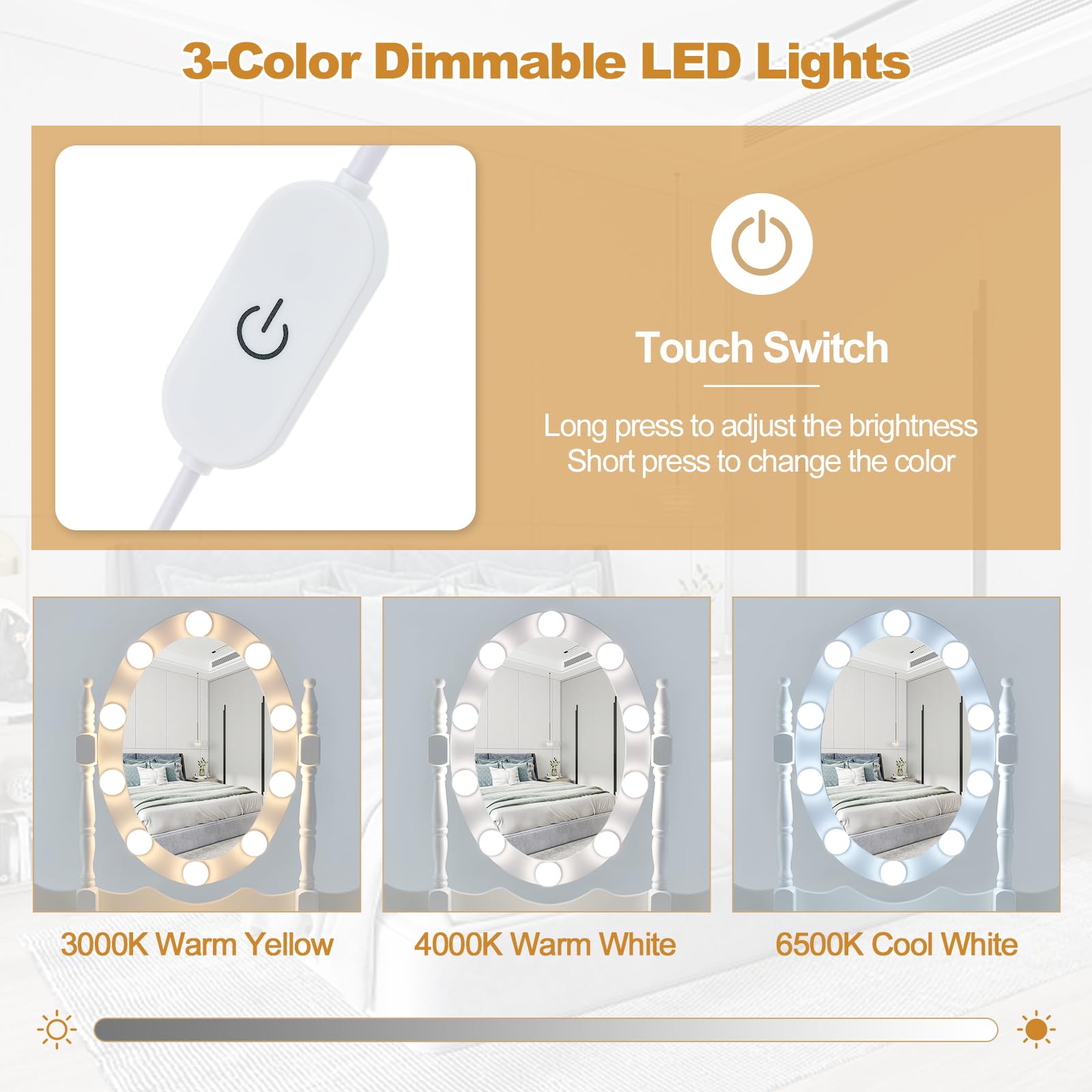 Illuminate your beauty with our stunning vanity table set! The LED lights offer 3 color modes and adjustable brightness, perfect for all your makeup needs. With 4 drawers and a spacious tabletop, you can easily organize your cosmetics and jewelry. Assembly is a breeze with our easy-to-follow instructions. The sturdy solid wood legs ensure long-lasting durability, and the included anti-toppling device provides additional safety.