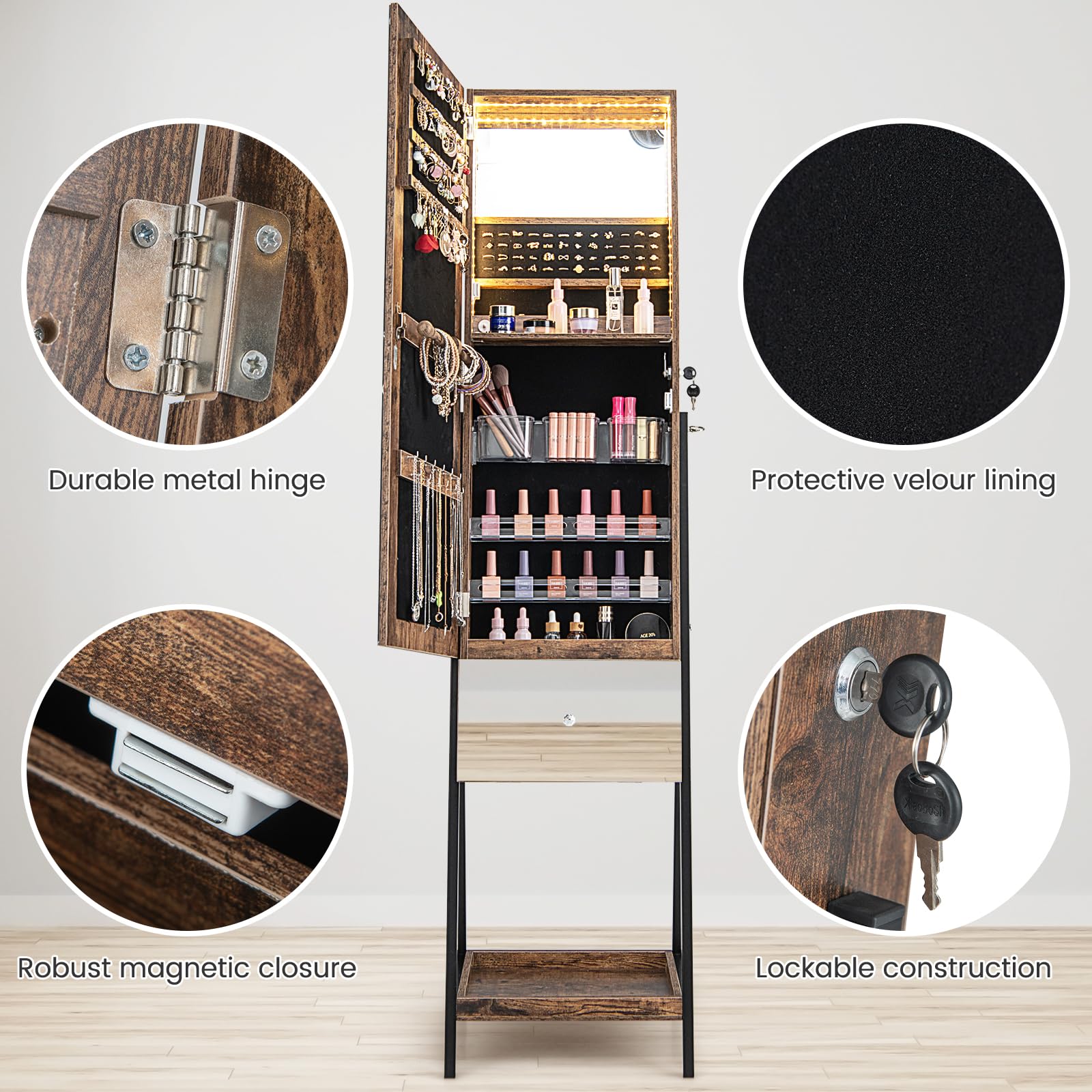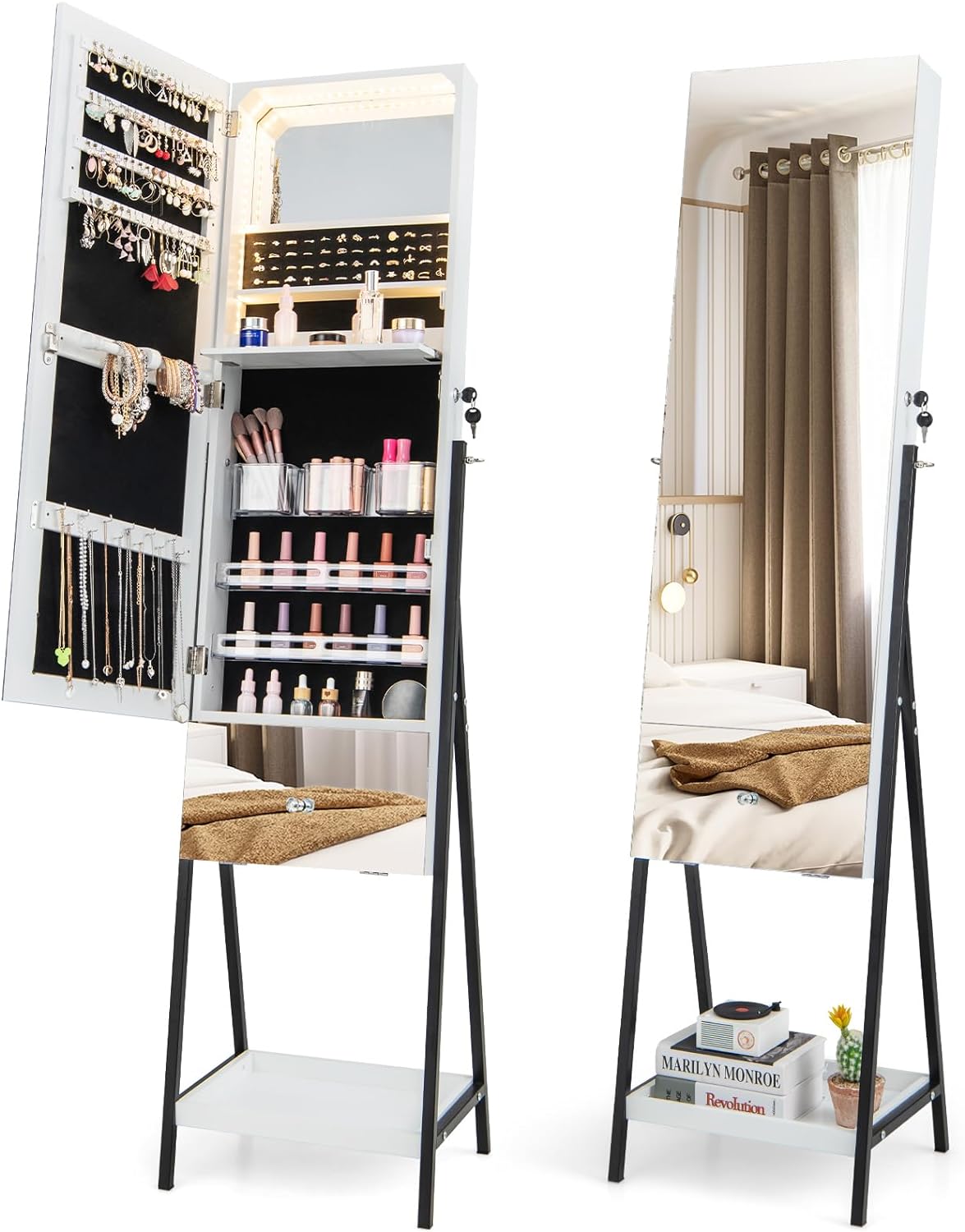 With a full-length mirror and built-in vanity, you can easily check your outfit and complete your makeup. The cabinet offers ample storage for all your precious jewelry and features 3 color LED lights for a versatile ambiance. Security is ensured with a lockable construction, while premium materials and a protective velvet lining guarantee durability and scratch prevention.