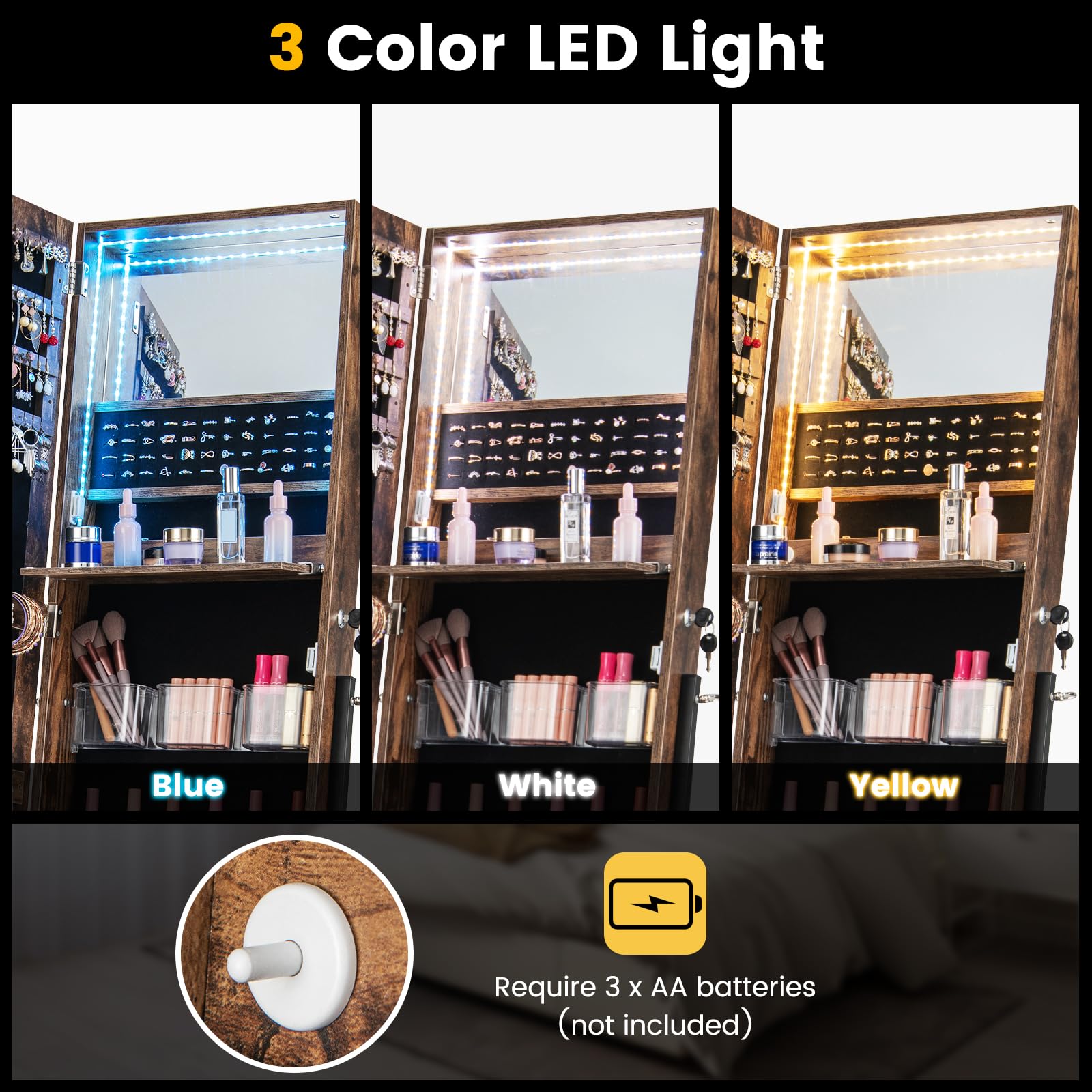- 【3-Color LED Lighting】: Our jewelry organizer features 3-color LED light strips that allow you to customize the lighting according to your mood and preference. Choose among warm yellow light, bright white light, or refreshing blue light to create the perfect ambiance. Note: This cabinet requires 3 x AA batteries (not included).