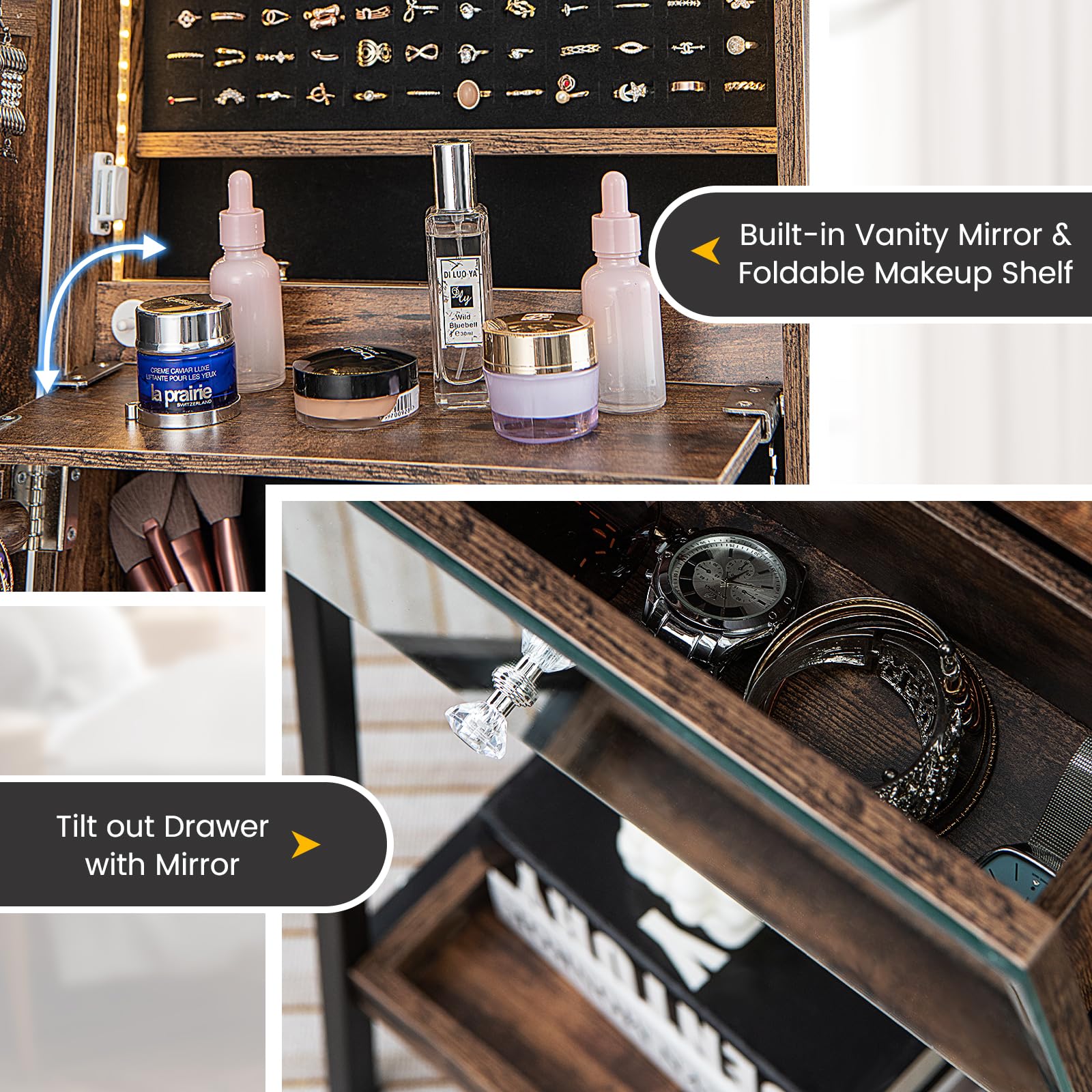 - 【Full Length Mirror & Built-in Vanity Mirror】: This jewelry armoire features a full-length mirror and a built-in vanity mirror, providing convenience and versatility. The full-length mirror allows you to check your outfit and accessories from head to toe, while the vanity mirror assists in completing your makeup flawlessly.