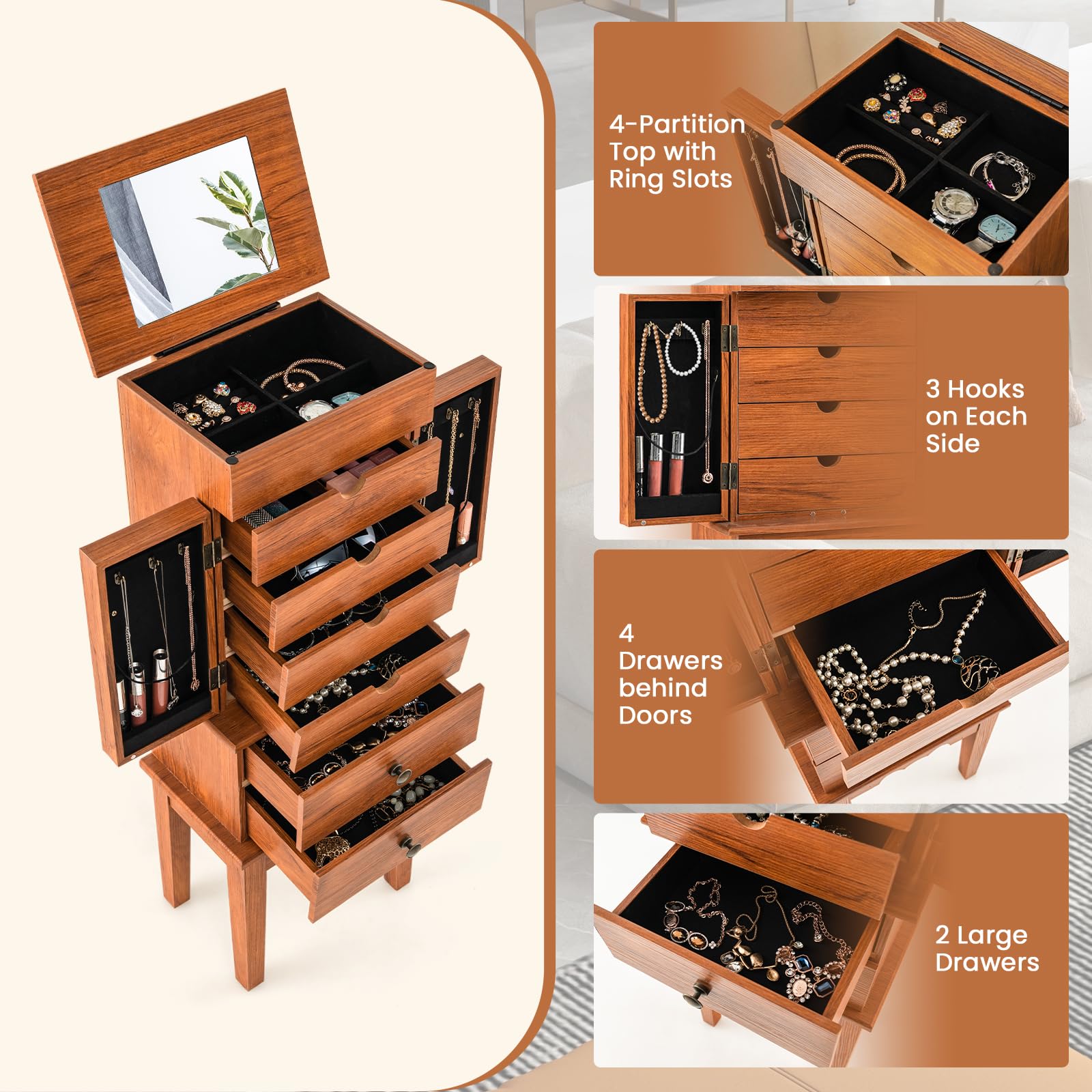 - [Ample Storage Capacity]: With 4 concealed drawers, 2 large drawers, and a 4-partition top compartment with ring slots, this standing jewelry armoire provides plenty of room to organize and store your jewelry collection, keeping everything easily accessible and neatly arranged.