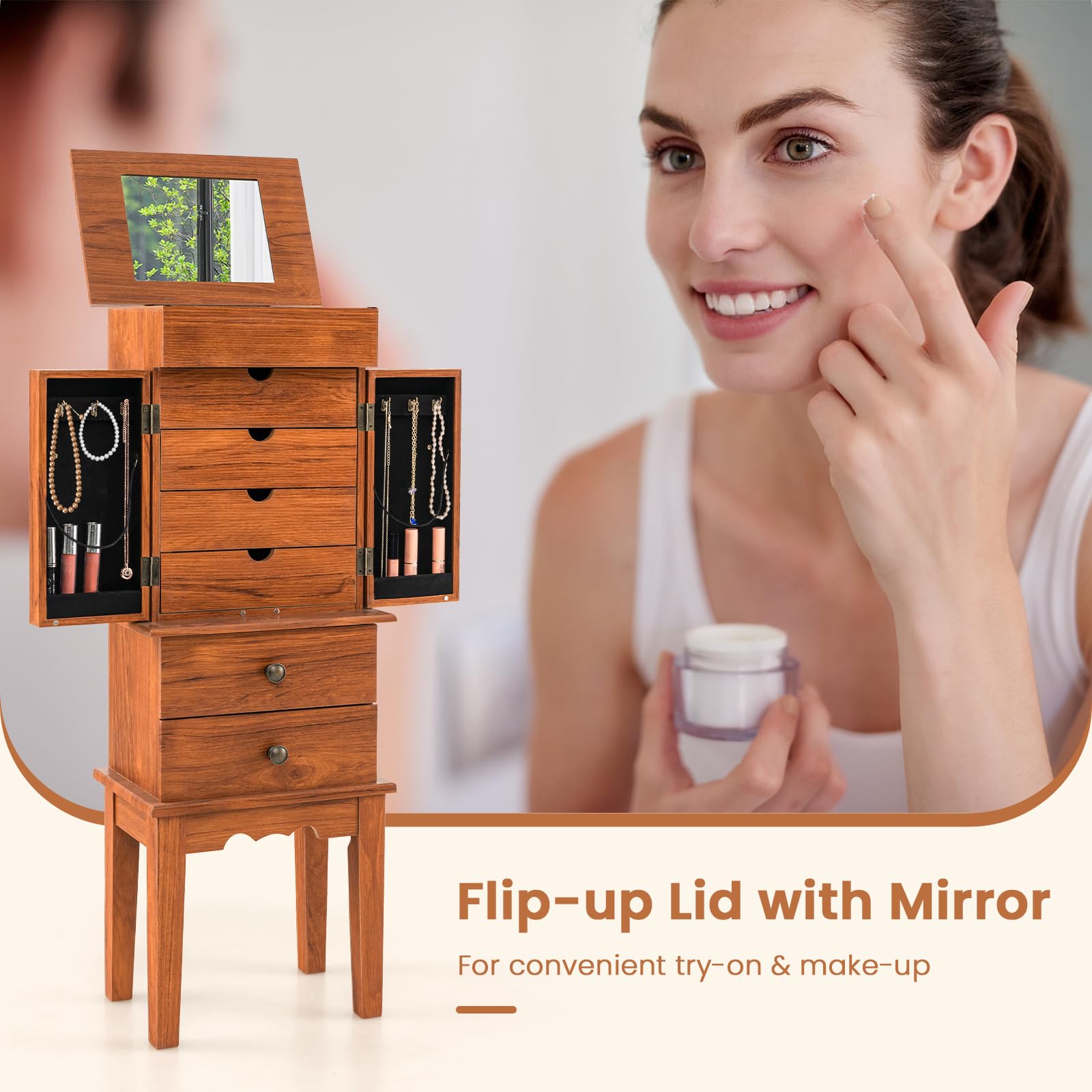 Organize your jewelry collection with ease! This gorgeous standing jewelry armoire has everything you need. With a spacious top compartment, 2 bottom drawers, 2 side doors and 4 drawers behind the door, you’ll never run out of space. There are specified space for your rings and necklace, prevent them from getting into a mess. The top flip mirror doubles as a makeup mirror and is perfect for accessorizing. Made with sturdy construction including wood legs and an anti-tipping kit, this armoire ensures safety and stability. Enjoy the elegant retro-style details and built-in soft lining that protects your precious jewelry from scratches. Click now to transform your jewelry collection!