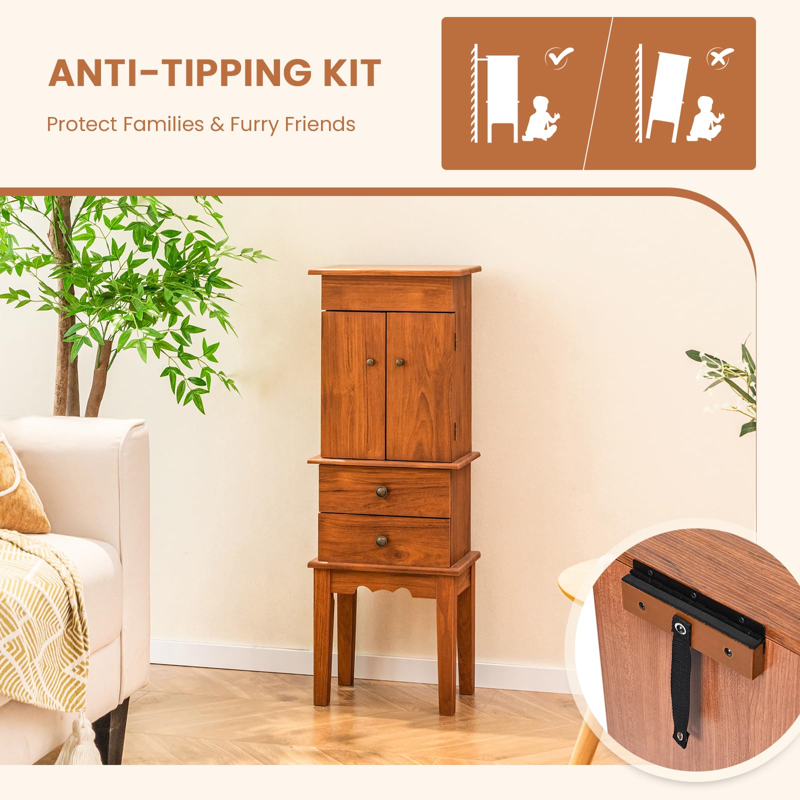 - [Sturdy Construction & Excellent Craftsmanship]: With robust wood legs and anti-tipping kit, this standing jewelry box features a stable construction to protect families & furry friends from falling accidents. Plus, the exquisite craftsmanship ensures long-lasting functionality and beauty.