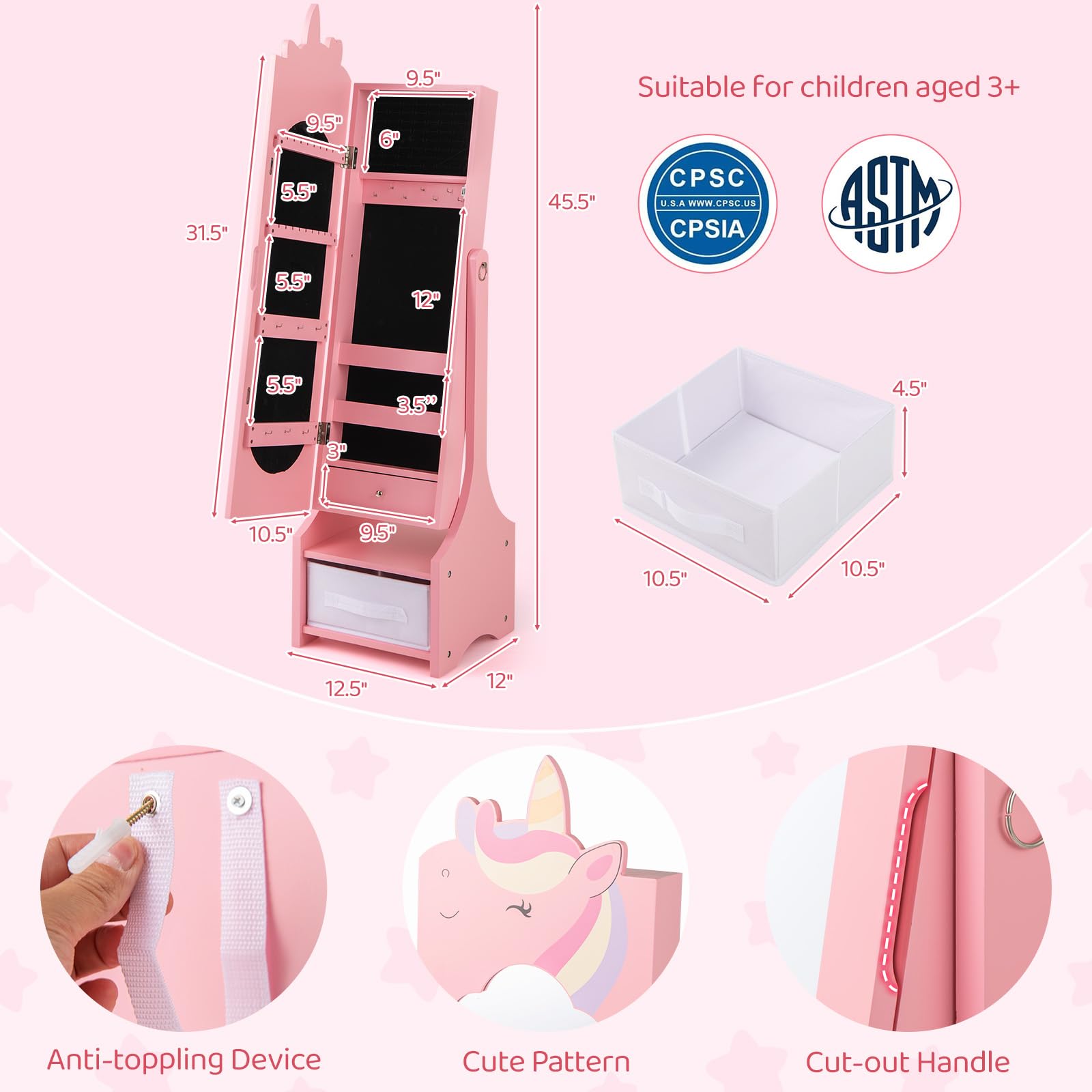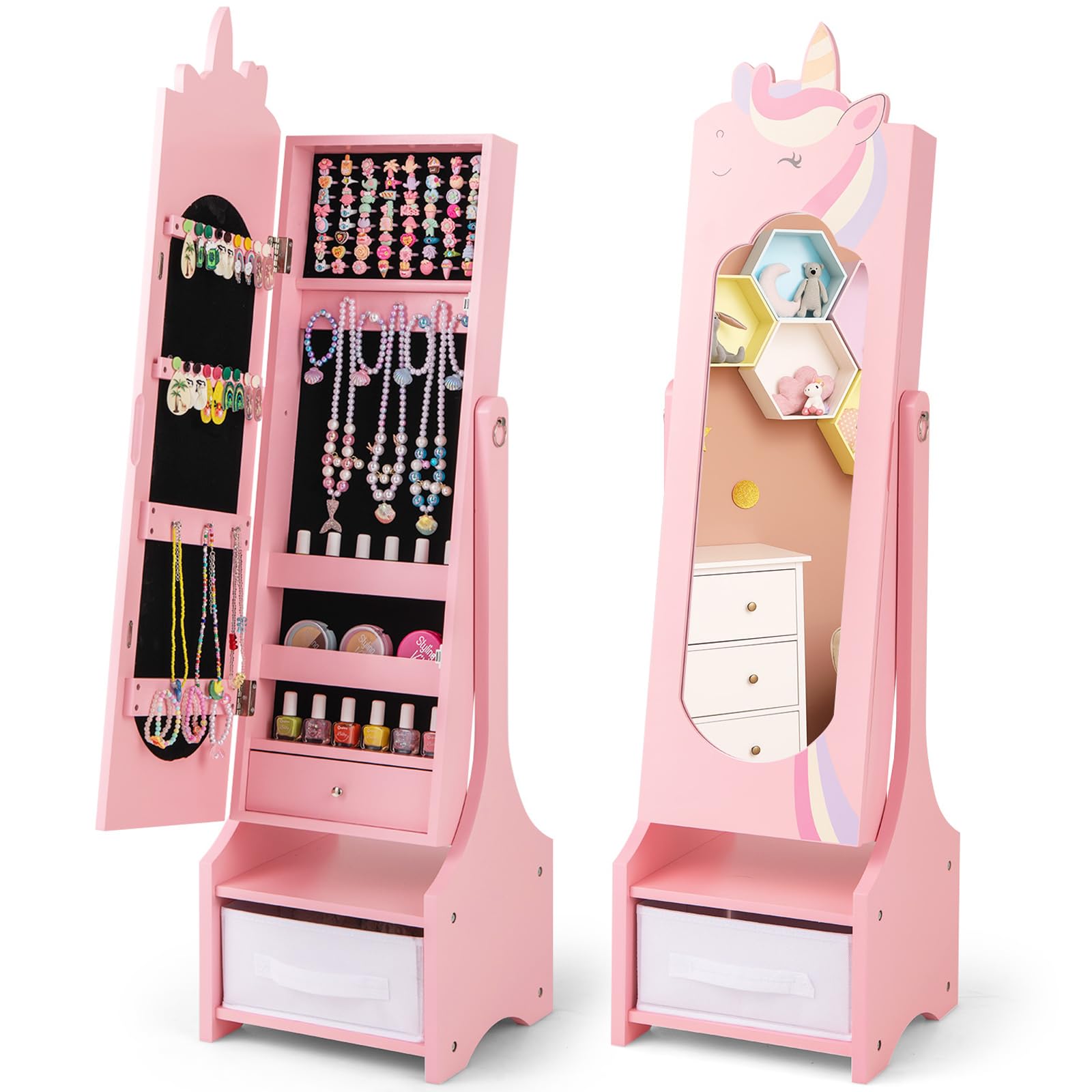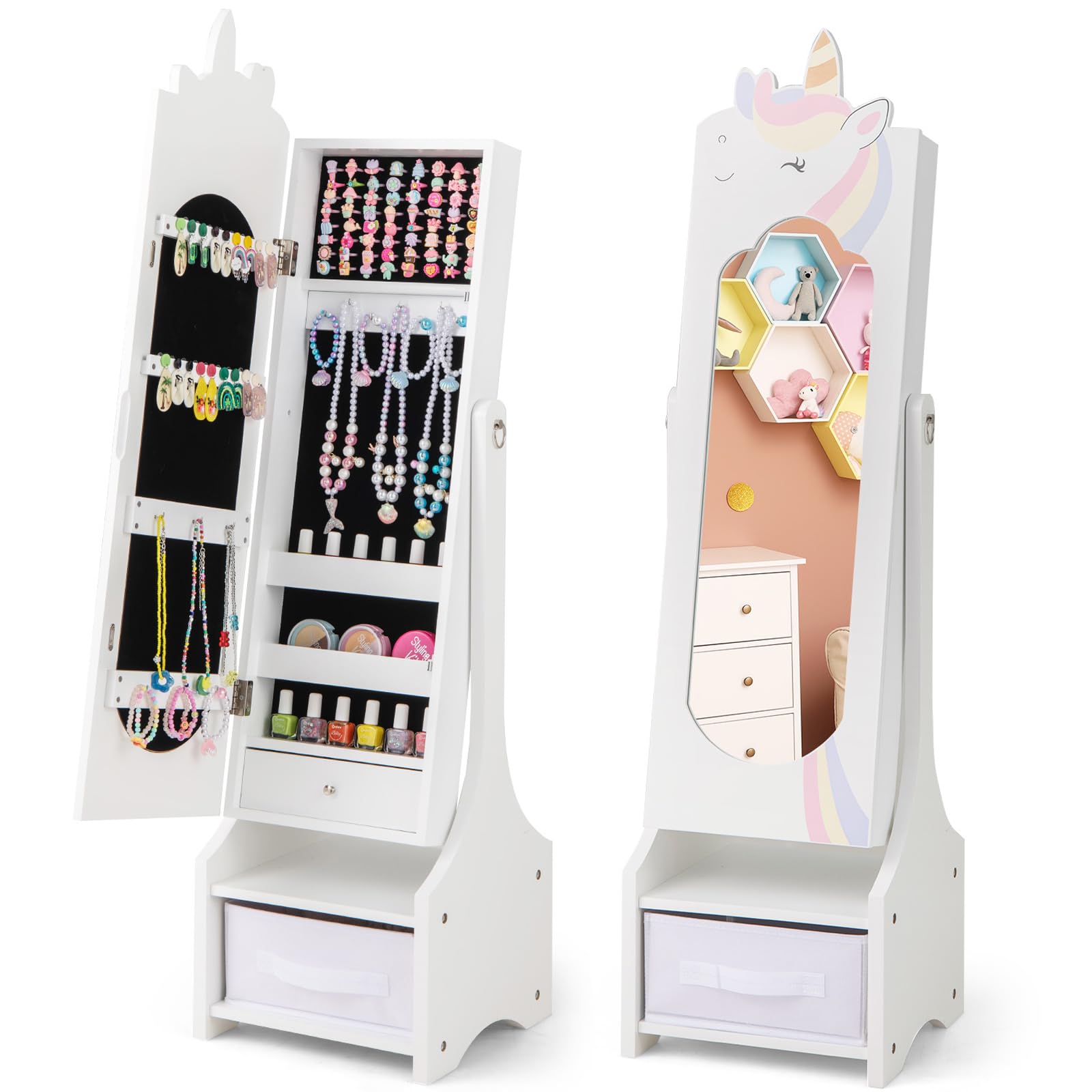 This freestanding jewelry armoire features a full-length mirror with 2 adjustable tilting angles, enabling your little princess to admire her outfits from every perspective. Each piece of jewelry finds its perfect place with ample storage options including hooks, slots and drawers. Safety is paramount with our ASTM and CPSIA compliant design, which includes an anti-toppling device and a stable base for peace of mind.
