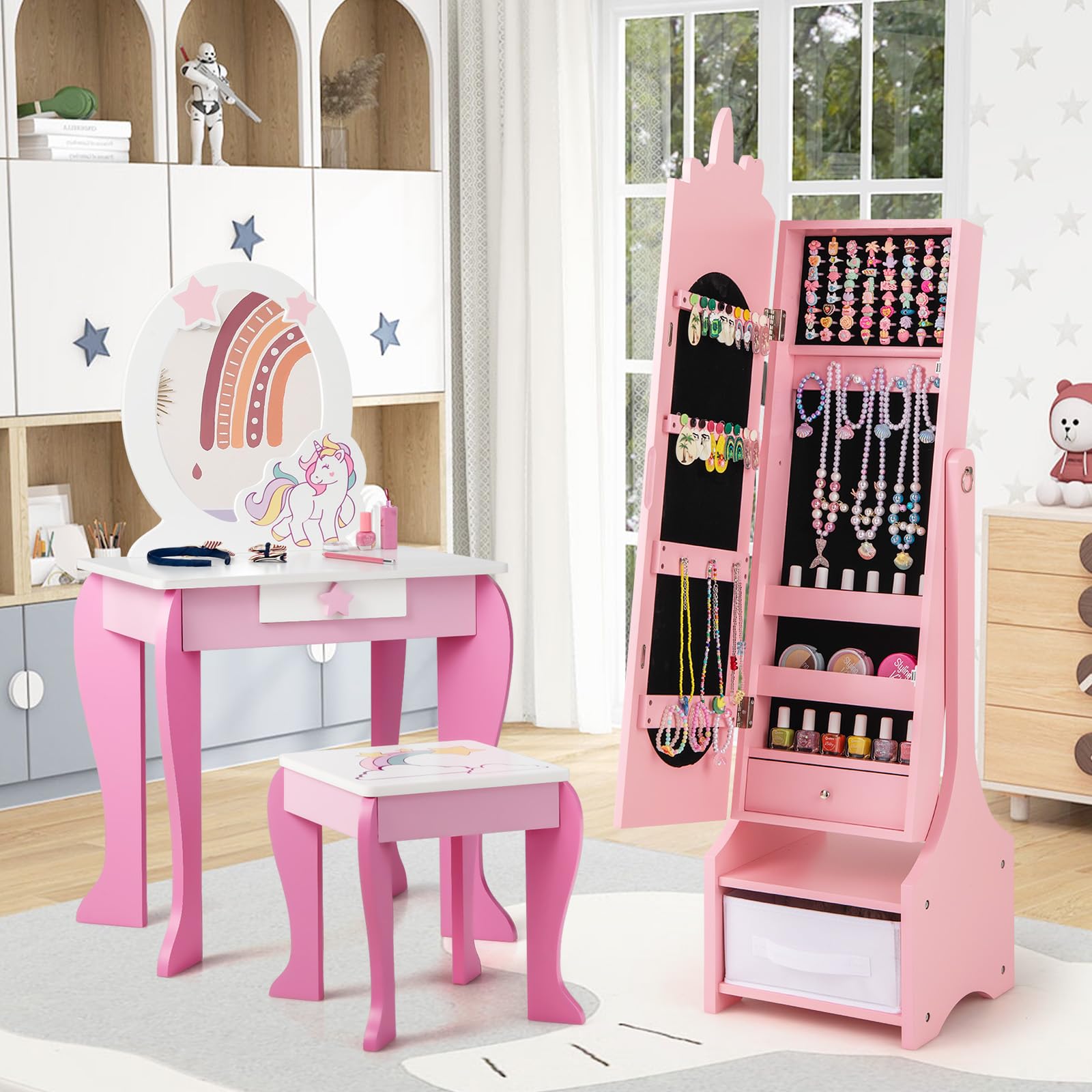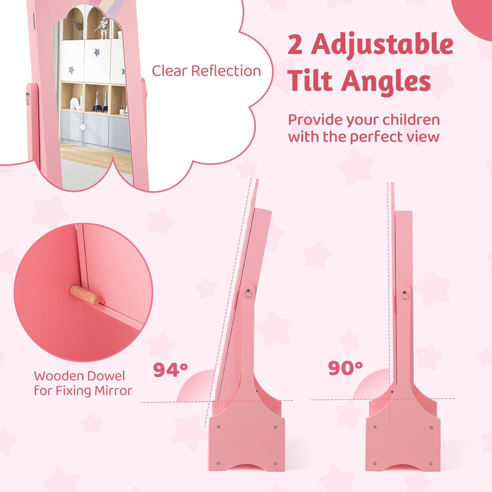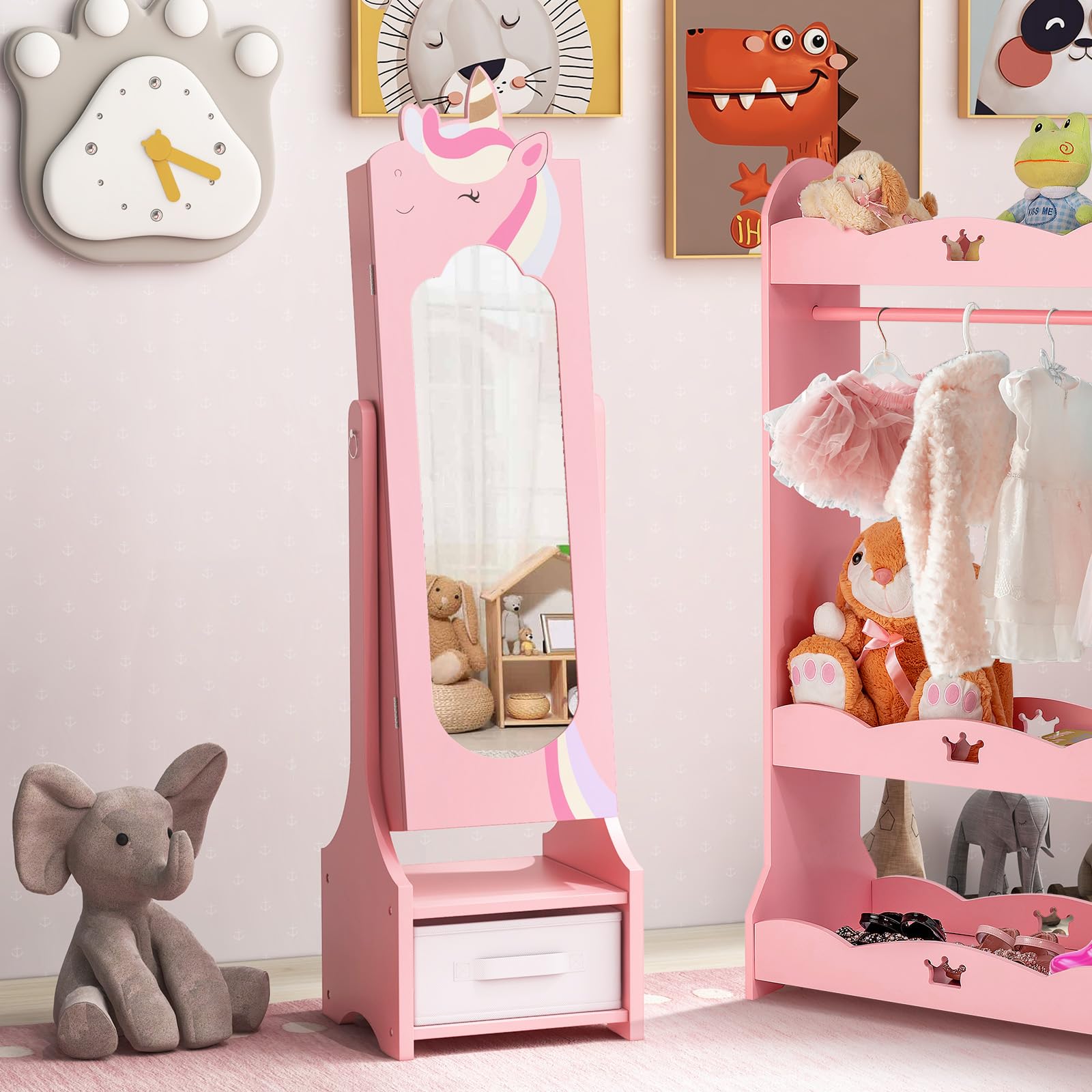 This freestanding jewelry armoire features a full-length mirror with 2 adjustable tilting angles, enabling your little princess to admire her outfits from every perspective. Each piece of jewelry finds its perfect place with ample storage options including hooks, slots and drawers. Safety is paramount with our ASTM and CPSIA compliant design, which includes an anti-toppling device and a stable base for peace of mind.