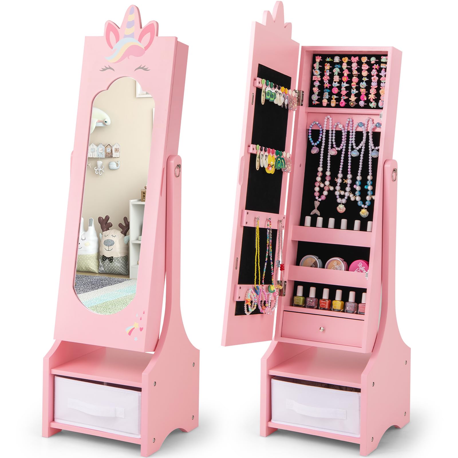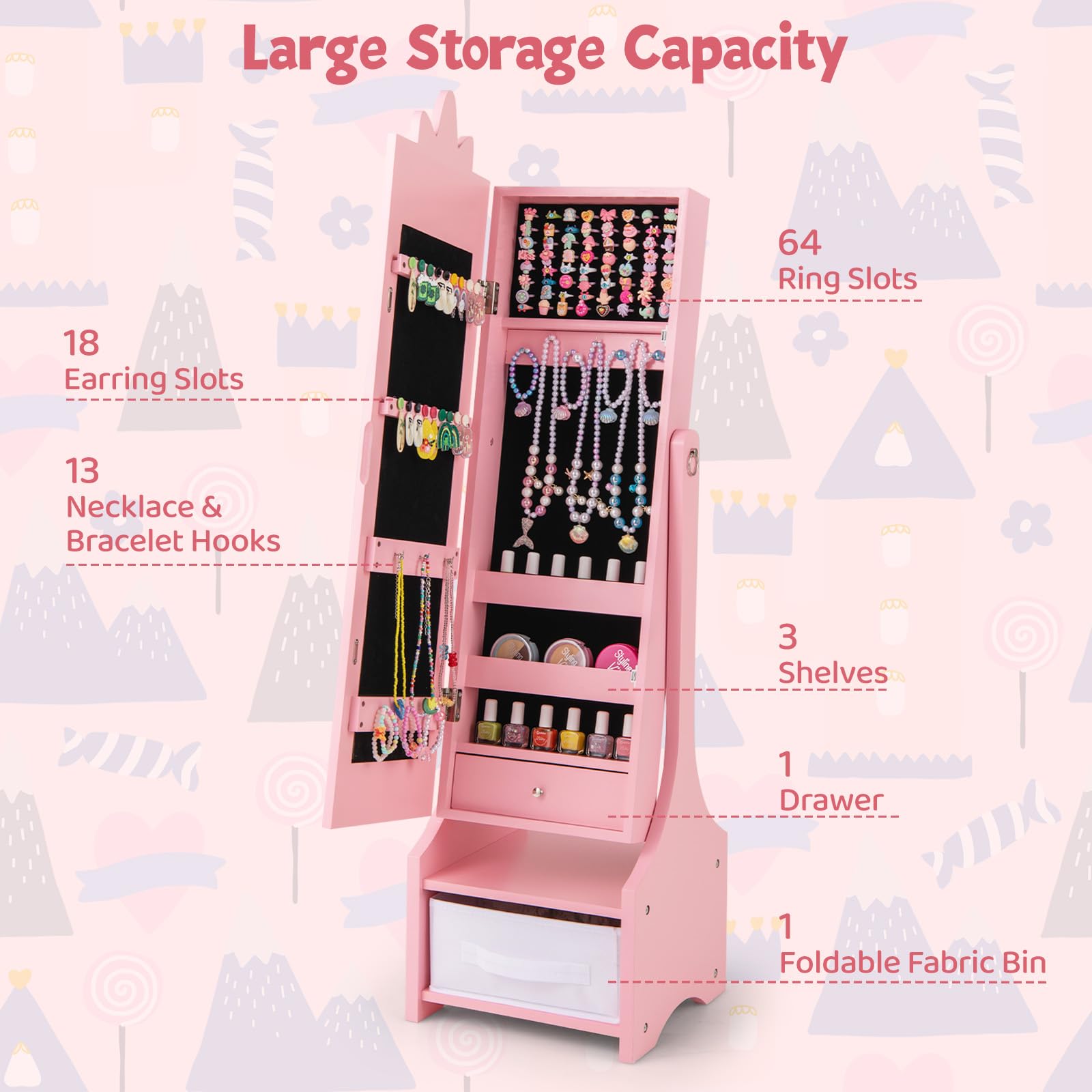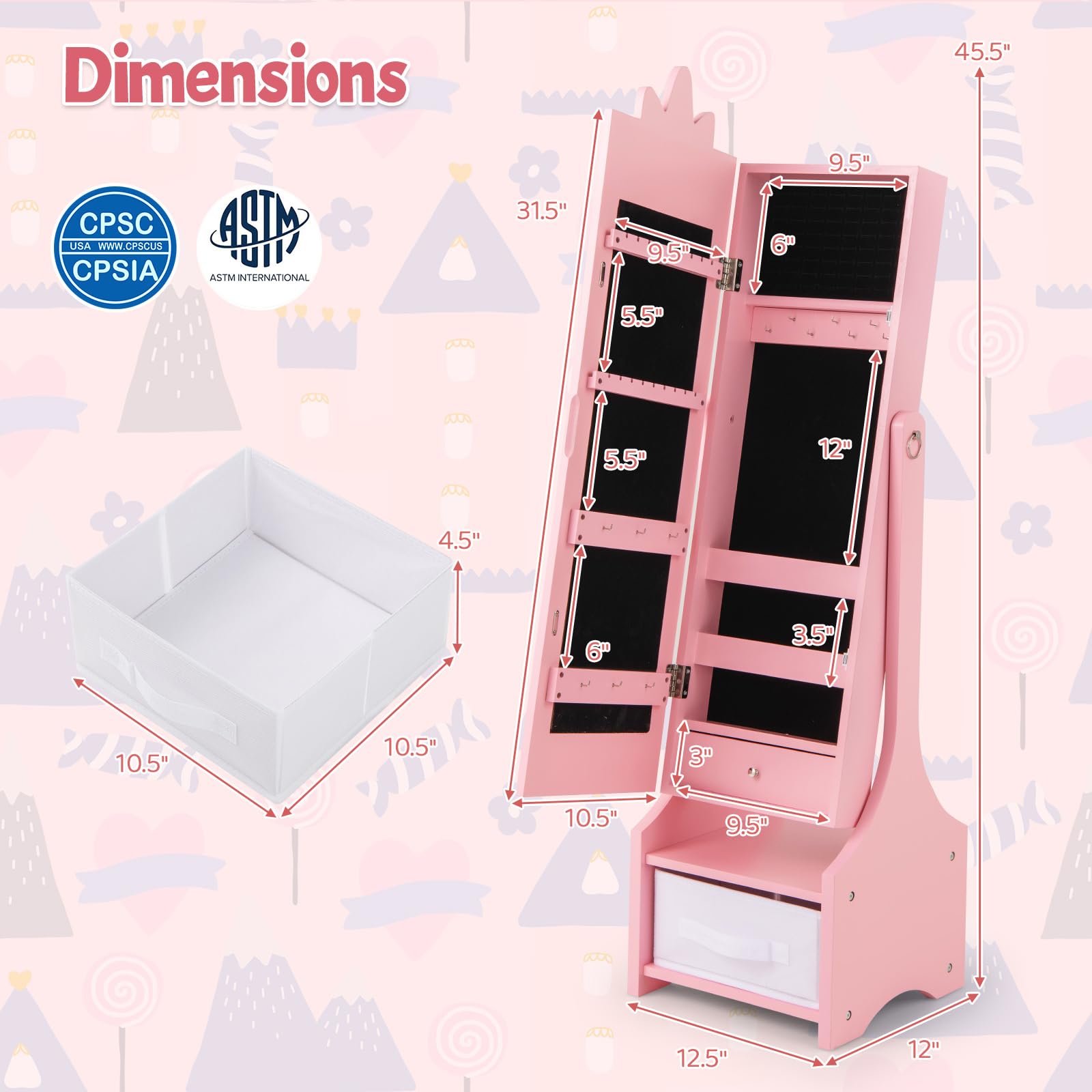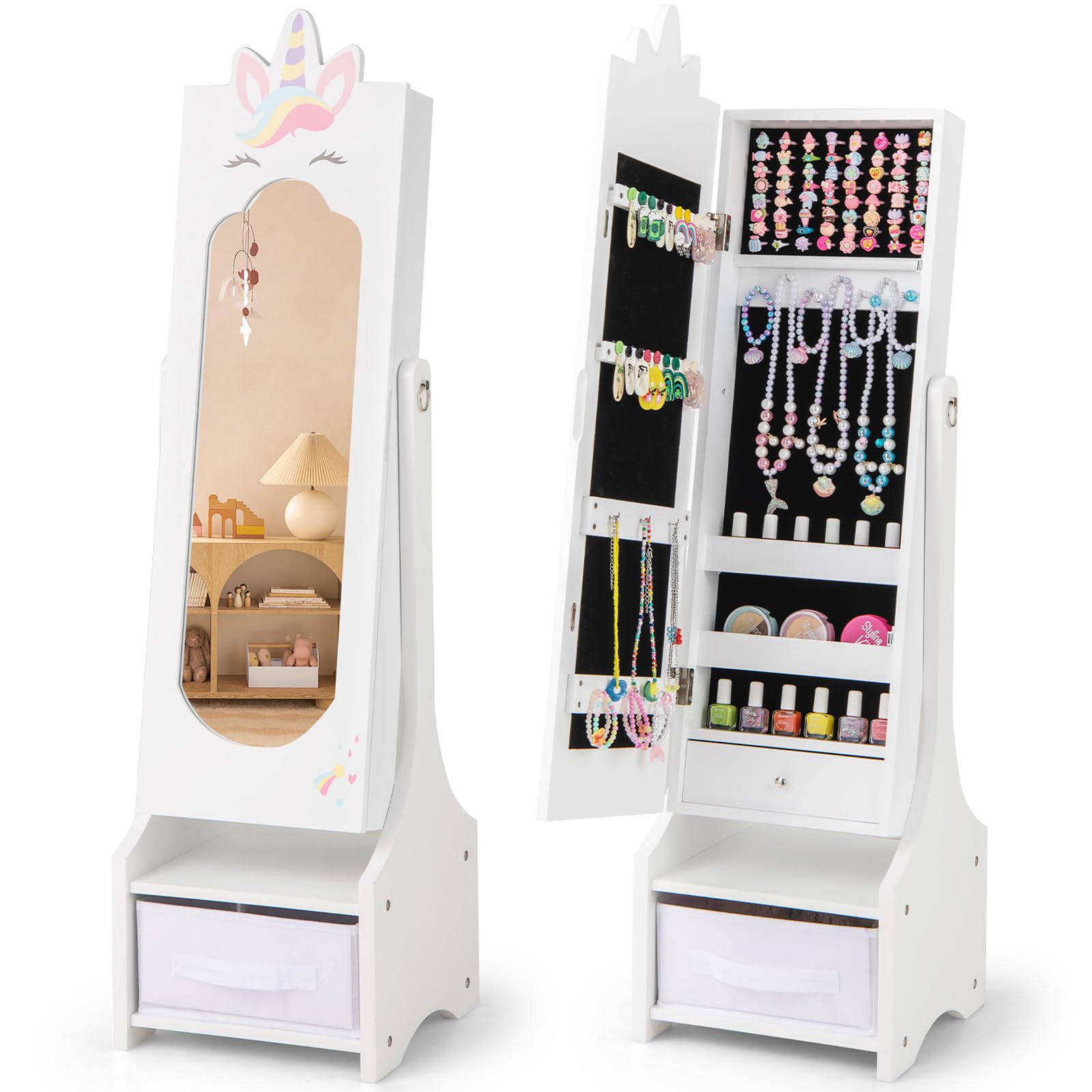 CHARMAID Kids Mirror Jewelry Cabinet - 45.5" Standing Jewelry Armoire with Full Length Mirror