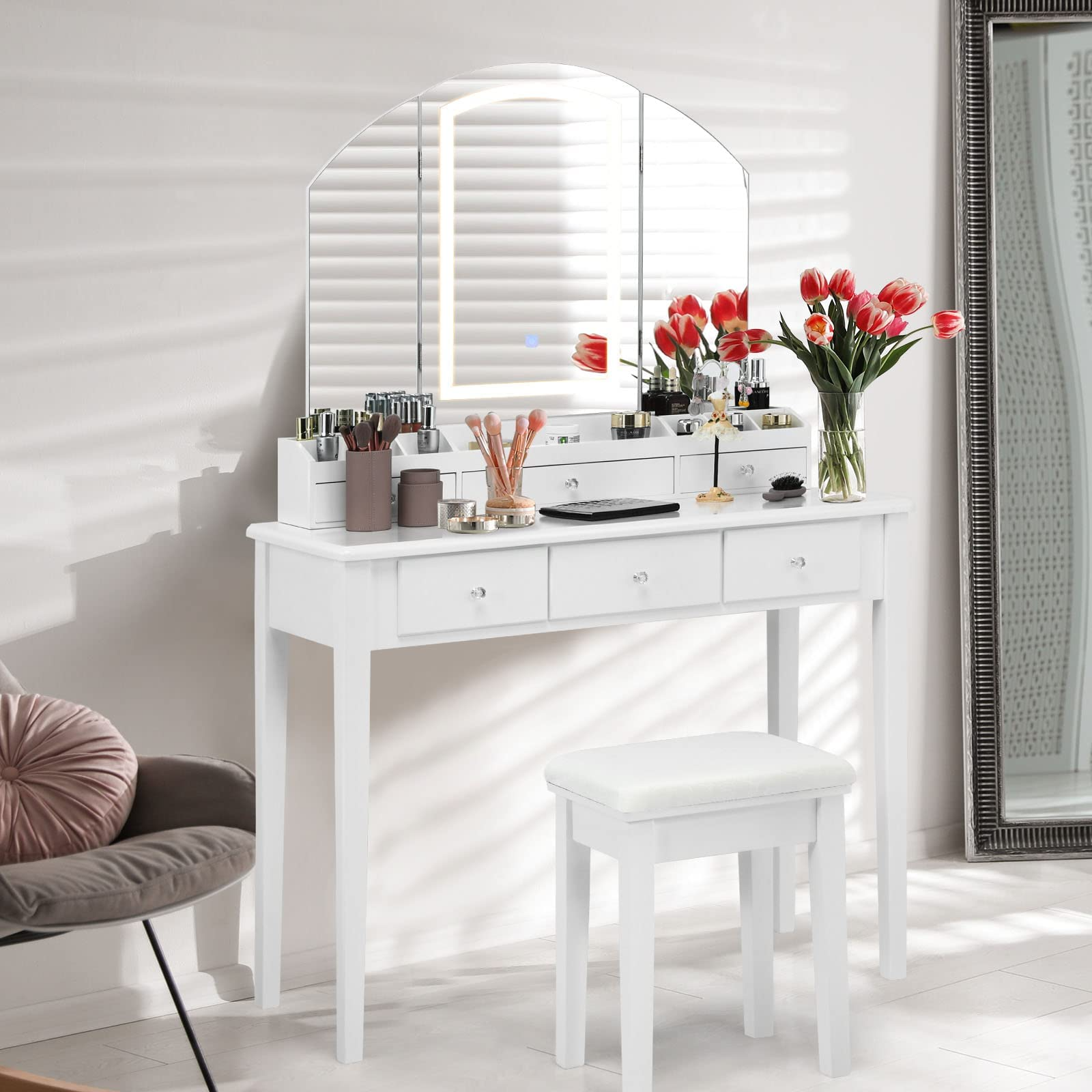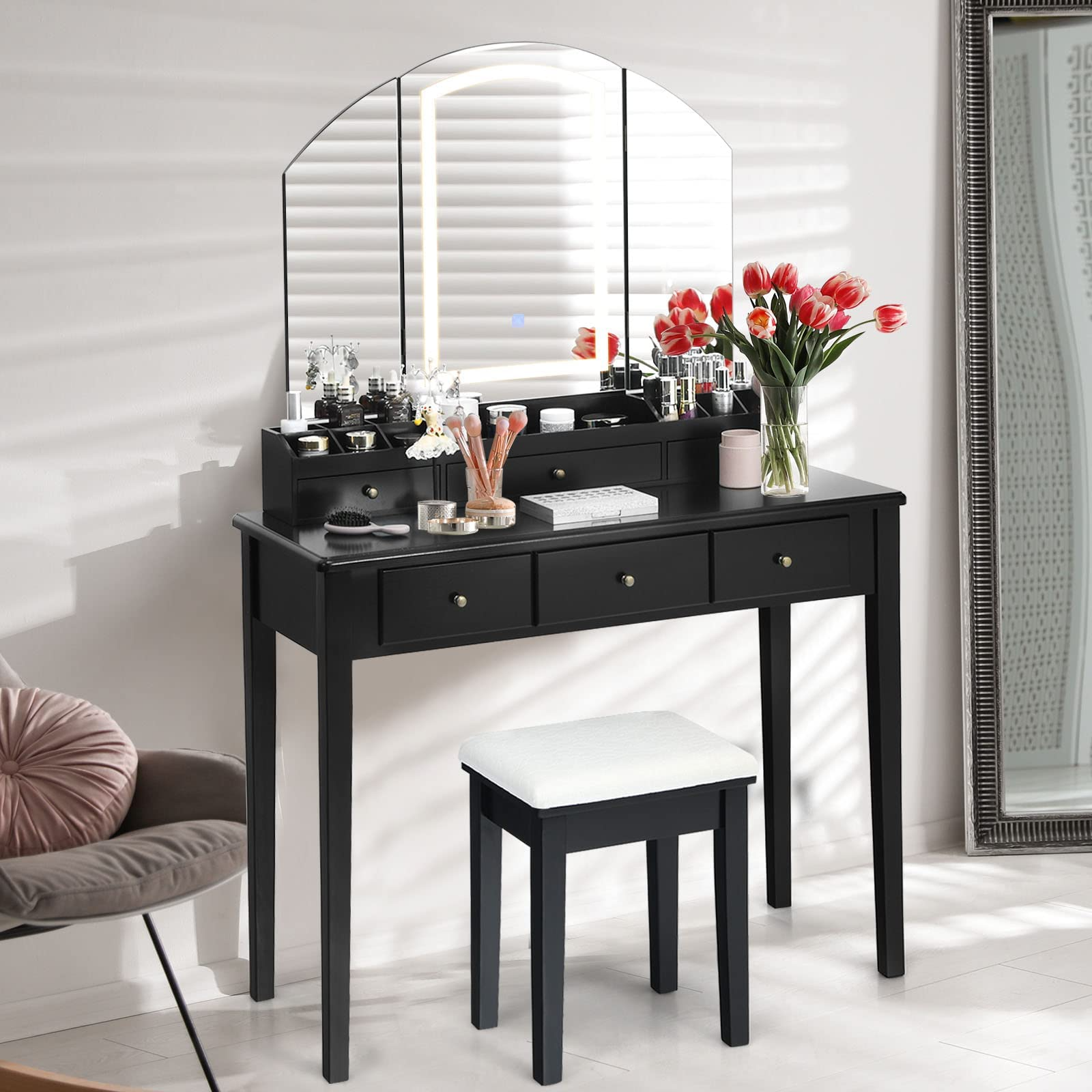 With 12 storage slots, a big compartment, and 6 drawers, the large vanity table provides you with ample space for your precious cosmetics and other items. The stable MDF and rubber wood construction will make you feel it is reliable to sit in front of the table and dress up freely. With its modern and stylish design, the table set will also be a great home decor and adds elegance to your living condition.