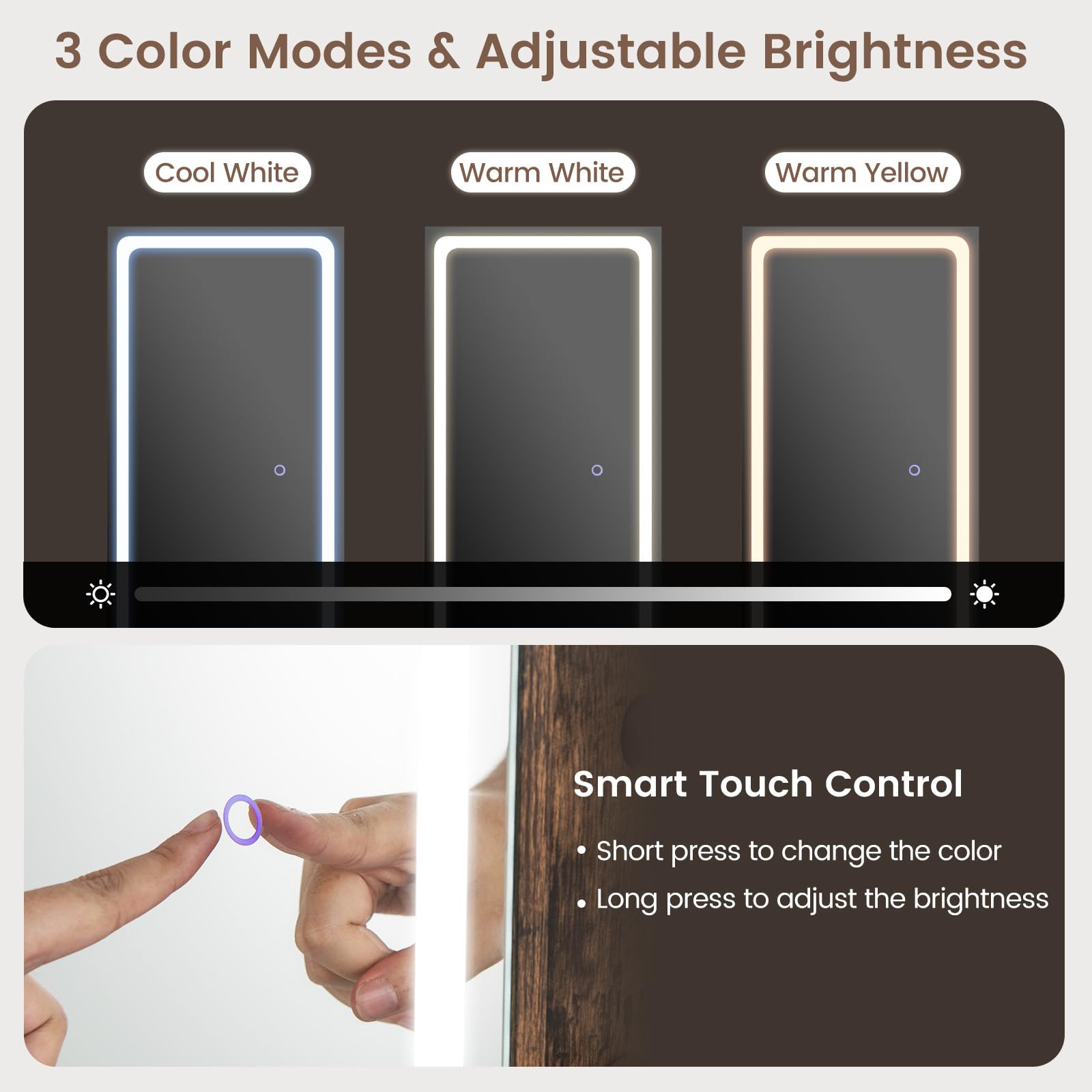 - ?LED Lighted Full-Length Mirror: Our full-length mirror with lights is available in 3 color options (cool white, warm white, and warm yellow) and features adjustable brightness. The touch switch makes operation easy, with a short press to change the color and a long press to adjust the brightness.?