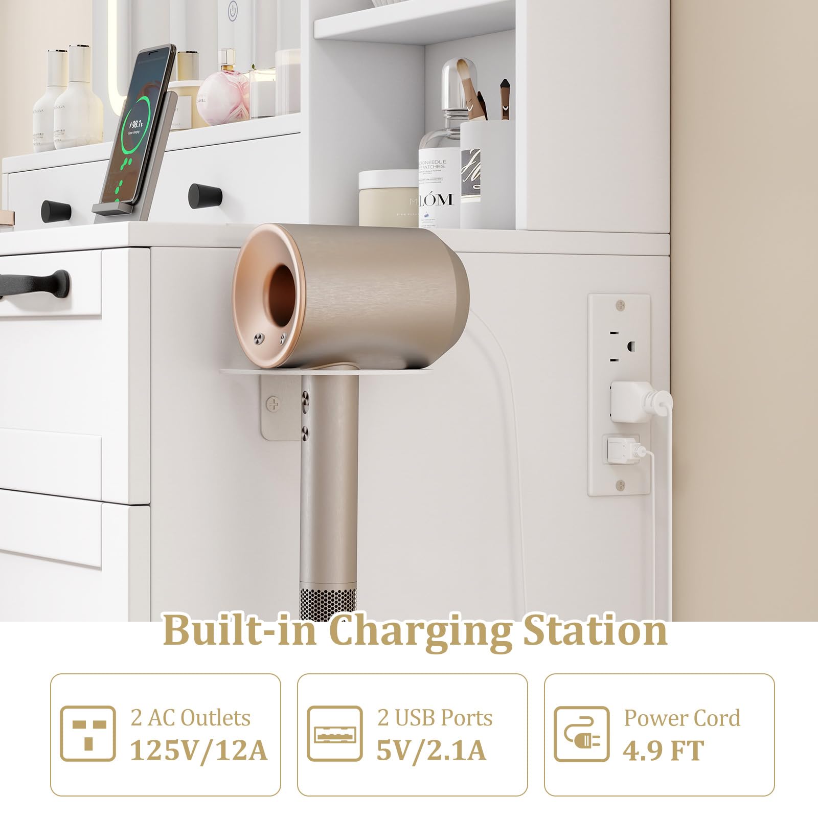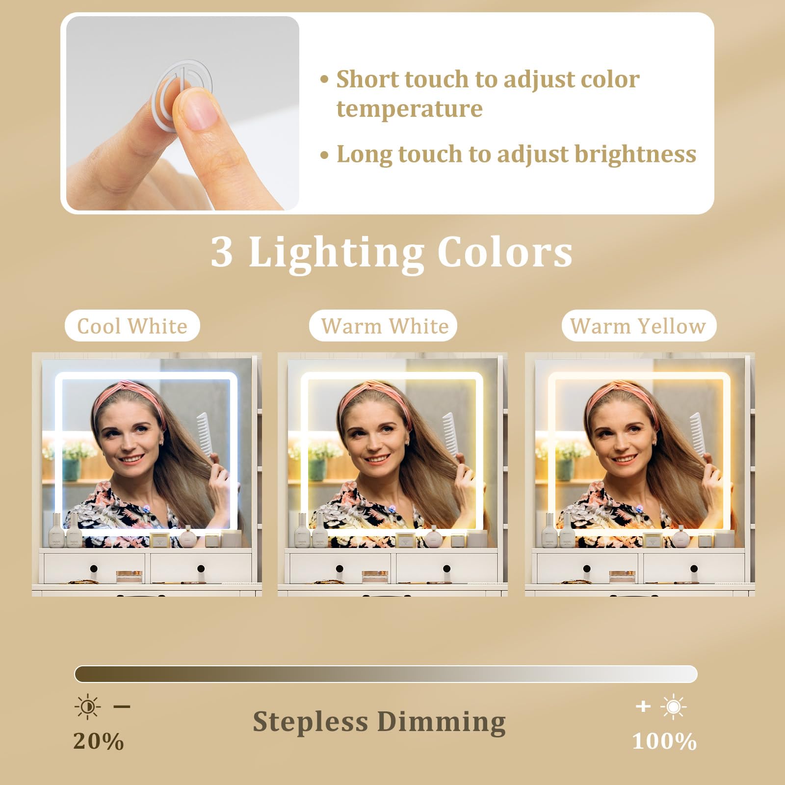 Upgrade your daily routine with this stylish lighted vanity set. The mirror features 3 lighting colors (cool, warm white, warm yellow) and stepless dimming from 20% to 100%, allowing you to create the perfect ambiance. A built-in charging station with 2 AC outlets and 2 USB ports keeps devices powered and your space clutter-free. Multiple storage options—4 open shelves, 4 drawers, an adjustable-shelf cabinet, and a storage stool—keep all your beauty essentials organized. Designed for comfort and convenience, it includes a soft cushioned stool, hair dryer holder, smooth drawer slides, and soft-close hinges. Crafted from durable materials with an anti-toppling device for safety.