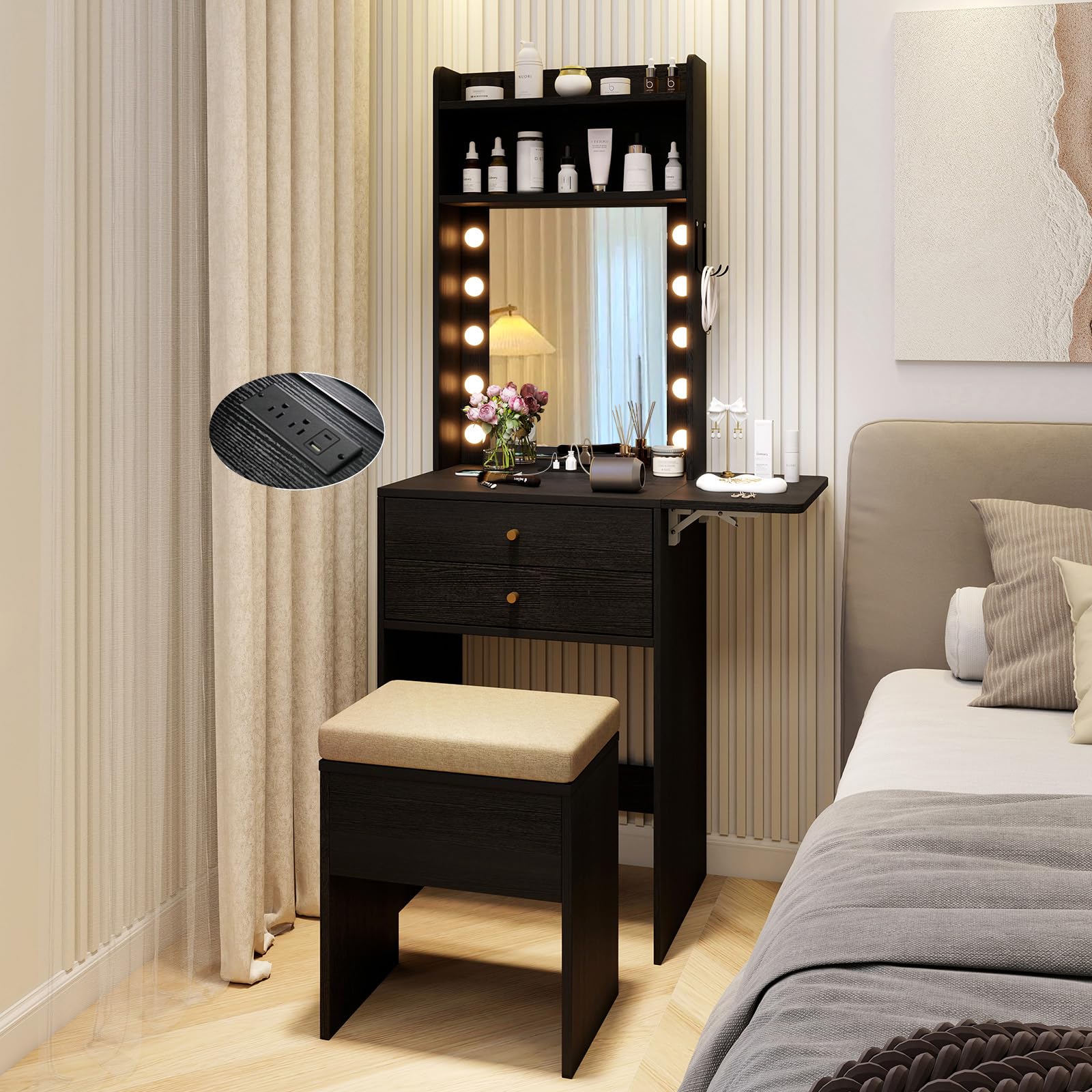 Featuring 2 shelves, hooks, drawers, a foldable side table, and a stool with hidden storage, this dressing table set provides roomy space for all your beauty essentials. Moreover, you can enjoy customizable LED lighting with 3 modes for perfect makeup application. The built-in charging station includes AC outlets and USB port for convenience. The functional design includes a space-saving drop leaf countertop, perfect for small rooms.