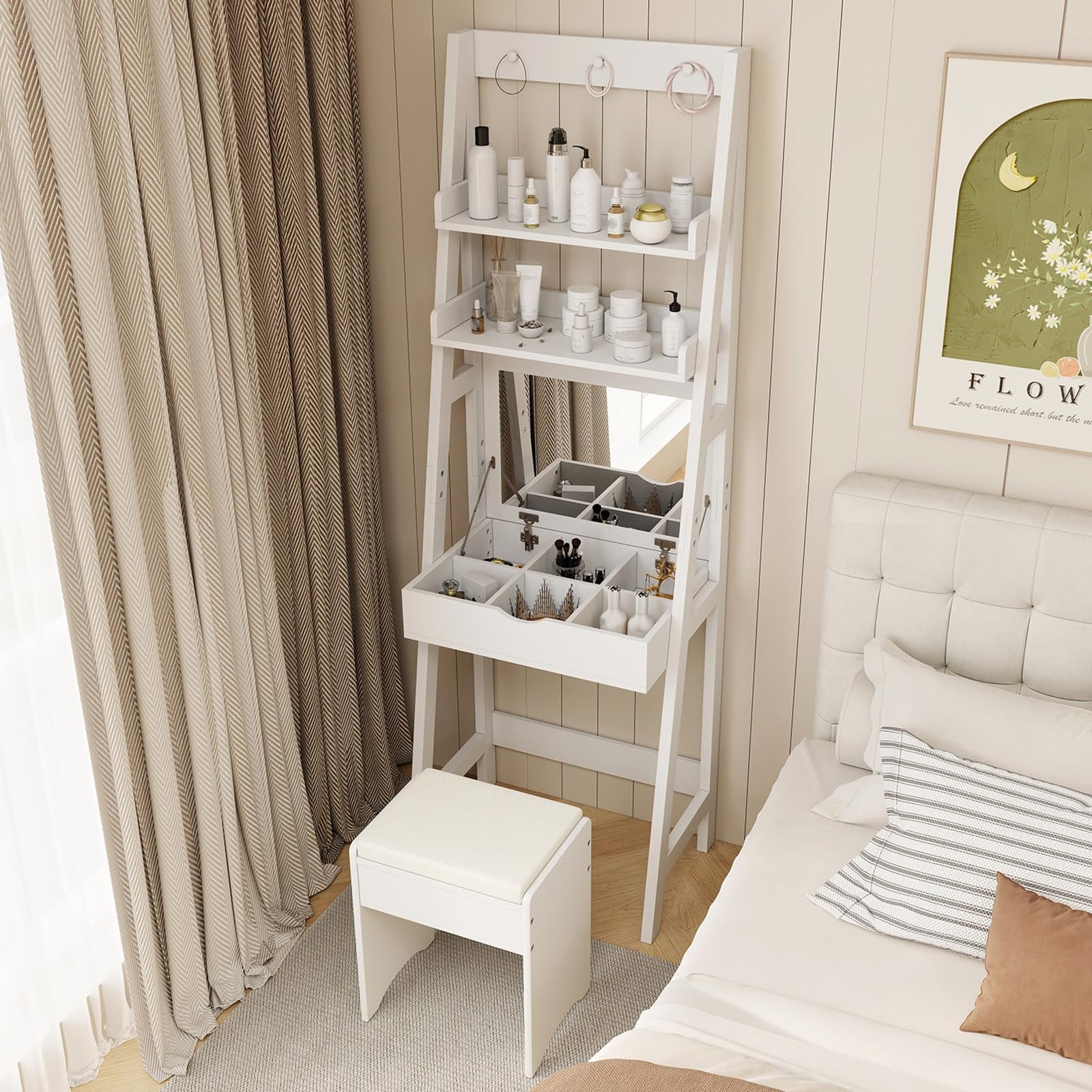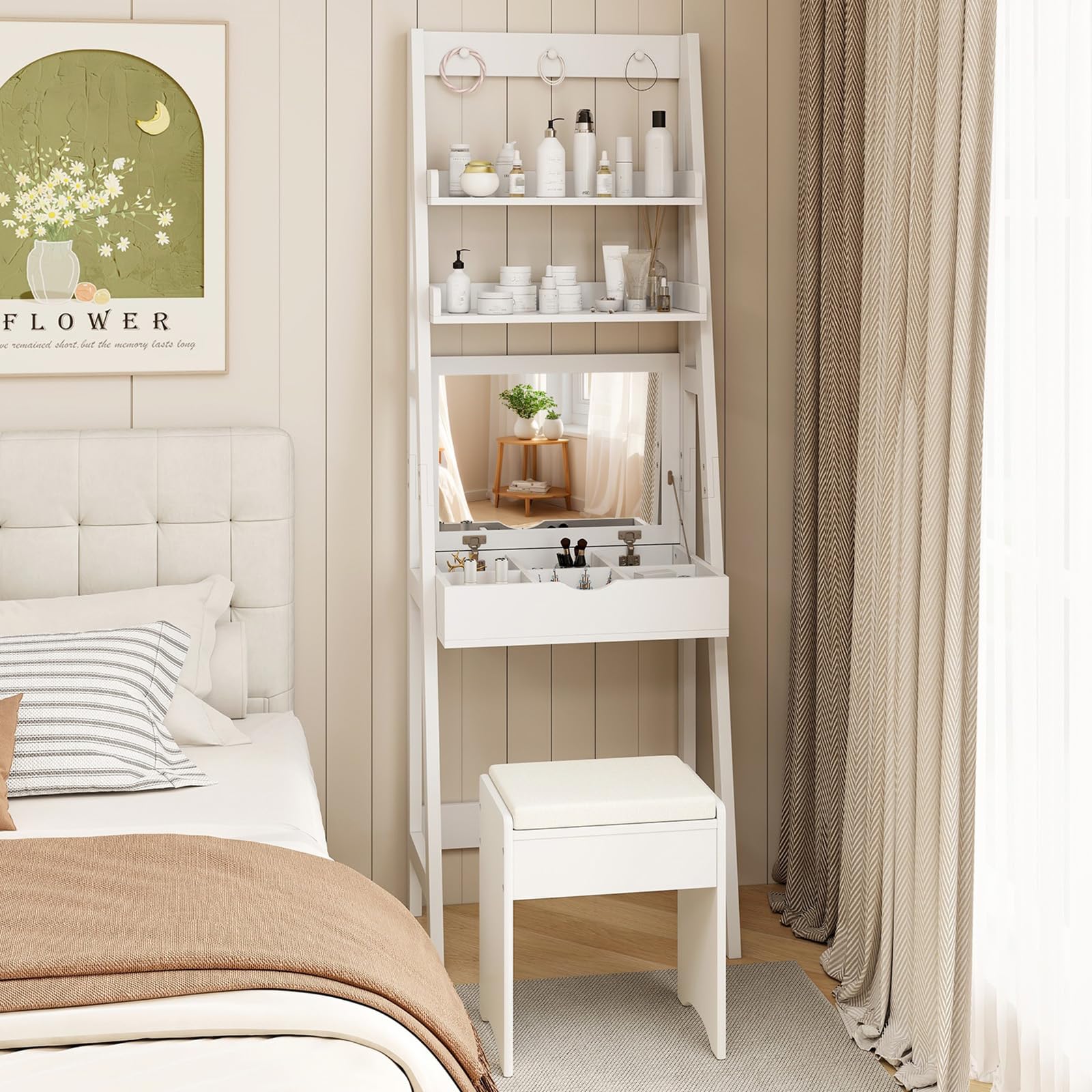 - [Space-Saving Dual-Purpose Design]: This makeup vanity desk features a flip-top mirror that optimizes space without sacrificing functionality. When closed, it transforms into a writing desk, making it perfect for multitasking. Measuring 23.5" x 15.5" x 71" (L x W x H), it’s an excellent fit for small bedrooms or compact areas while providing ample space for your beauty routine.