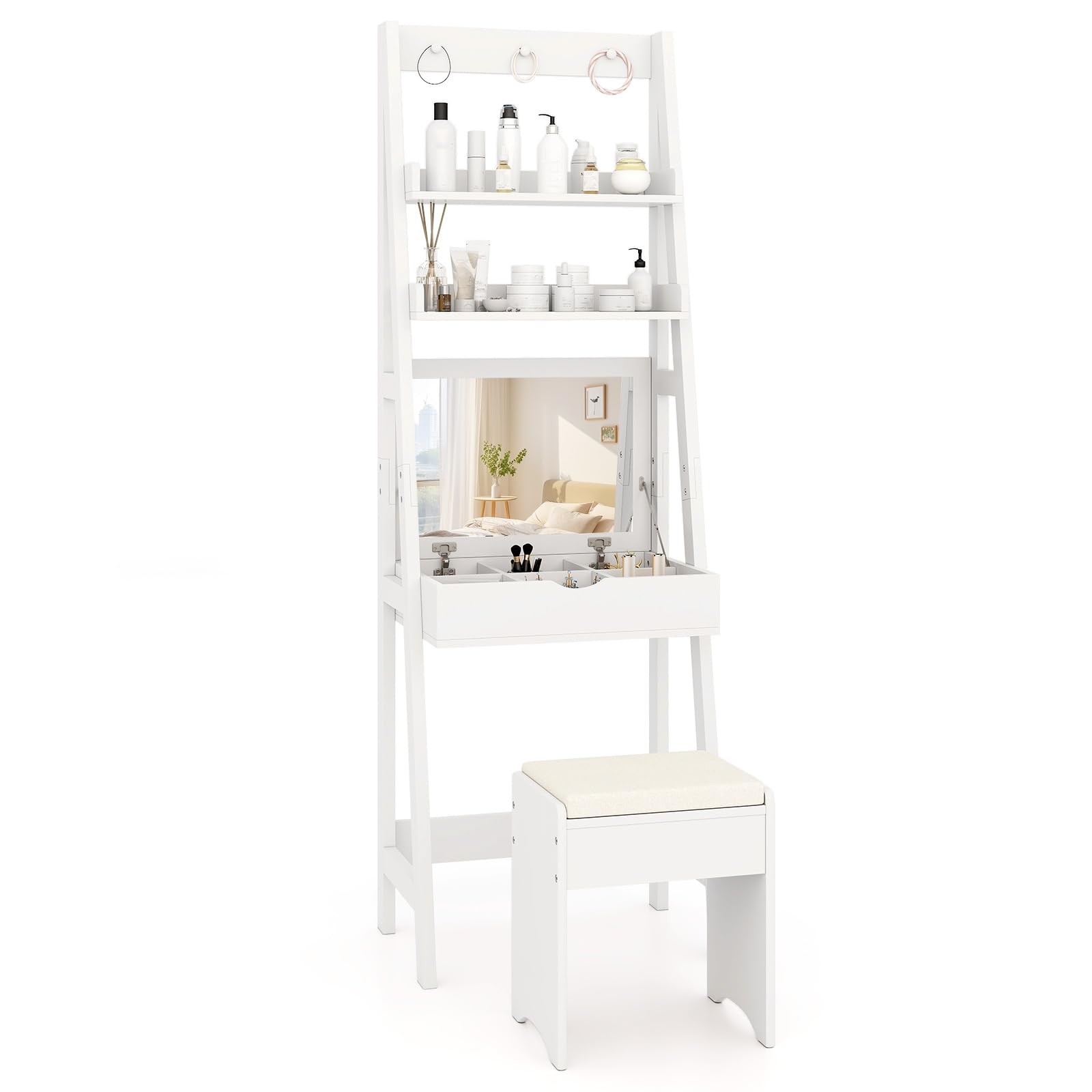 Saves space and meets multiple needs with a flip-top mirror