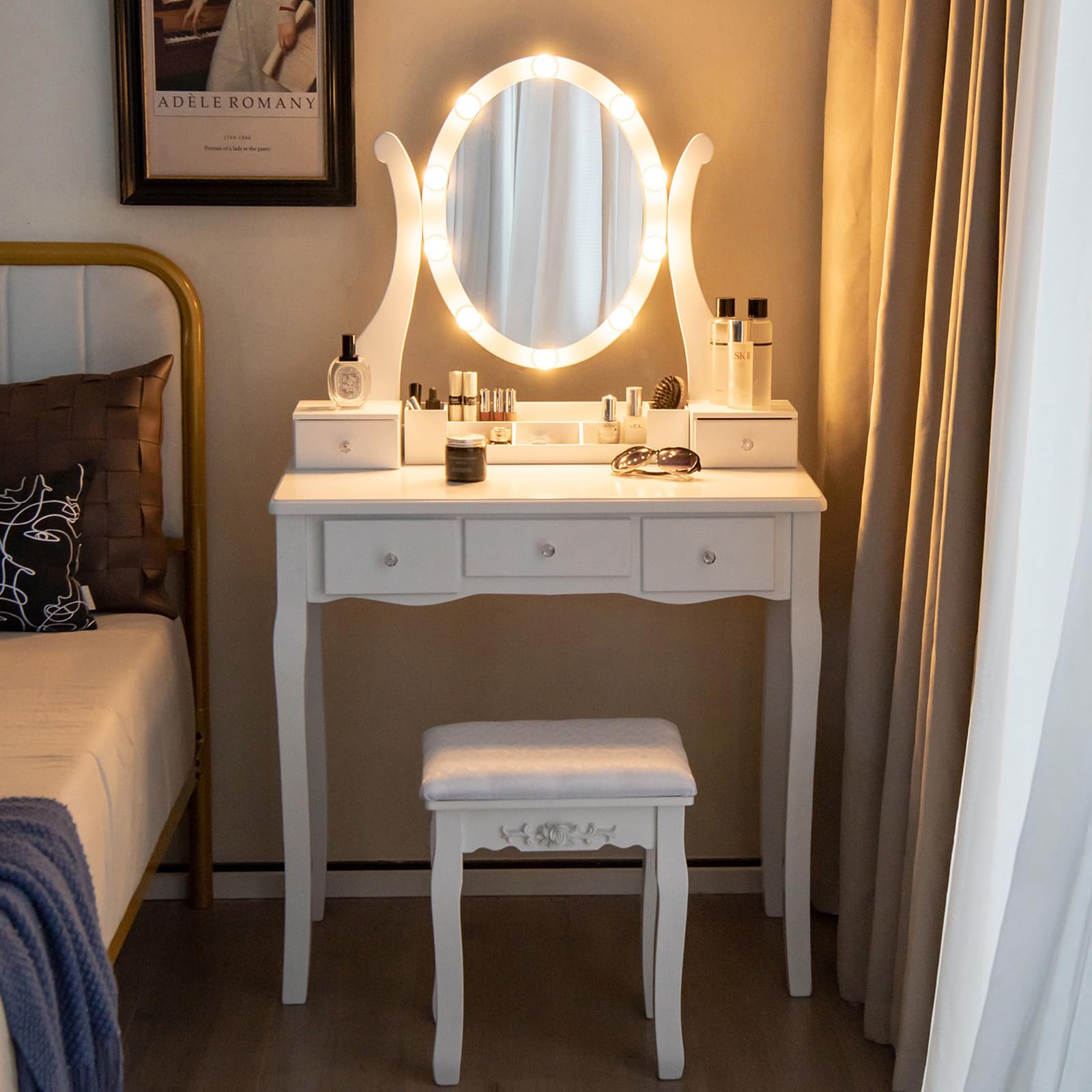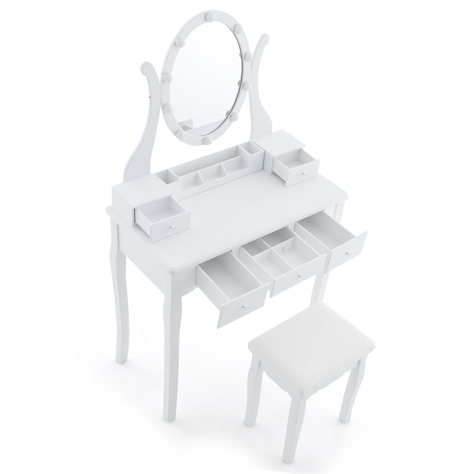 Illuminate your beauty with this vanity table set! It includes a LED lighted rotating mirror and a comfortable stool. The mirror has 3 color modes and adjustable brightness, easily controlled with a touch switch. With 5 drawers and a storage grid, you can neatly organize all your cosmetics, jewelry, and skincare products. The solid wood legs ensure durability, and it can even be attached to the wall for added stability.