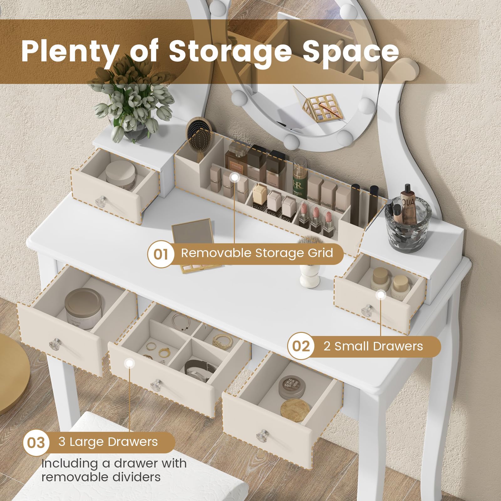 - 【Ample Storage Space】: This dressing table features 5 drawers, including a drawer with 4 compartments for organized storage. Additionally, the tabletop storage grid helps you store and organize your cosmetics, and it can be detached according to your needs.
