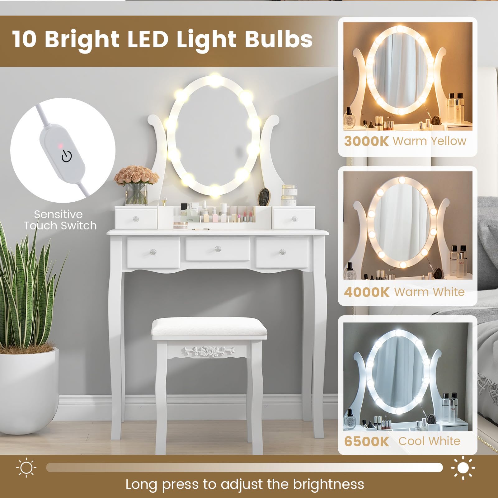 - 【Large LED Lighted Mirror】: This lighted mirror features 10 bright LED bulbs with 3 color modes (warm yellow, warm white, cool white) and adjustable brightness. The touch switch allows for easy control. Additionally, the mirror is 360° rotatable to accommodate different makeup needs.