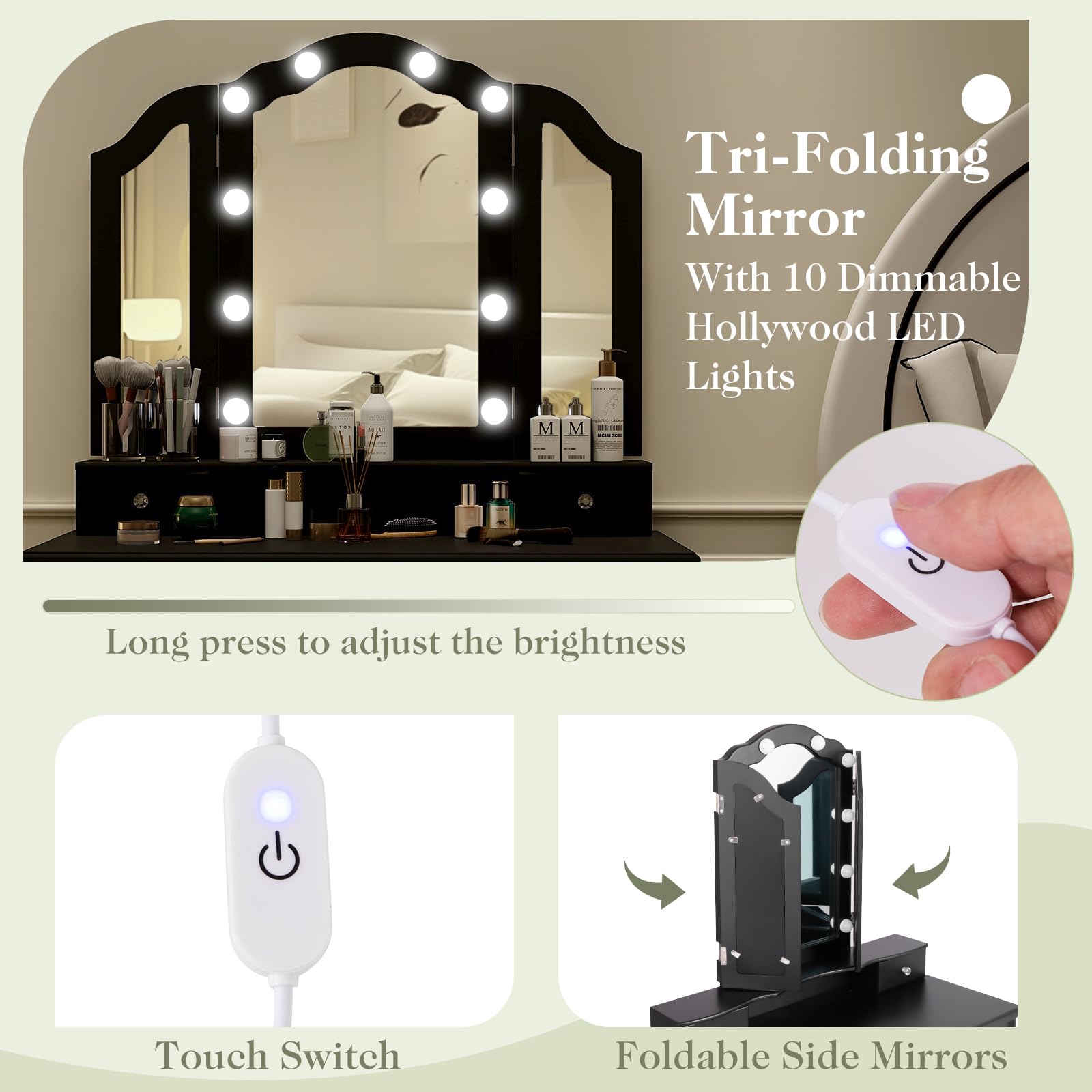 - [Illuminated Tri-Fold Mirror]: This tri-fold mirror features 10 adjustable Hollywood LED lights, providing a clear and well-lit reflection at any time of day. The mirror includes a touch control switch for easy operation: a long press adjusts the brightness to your preference.
